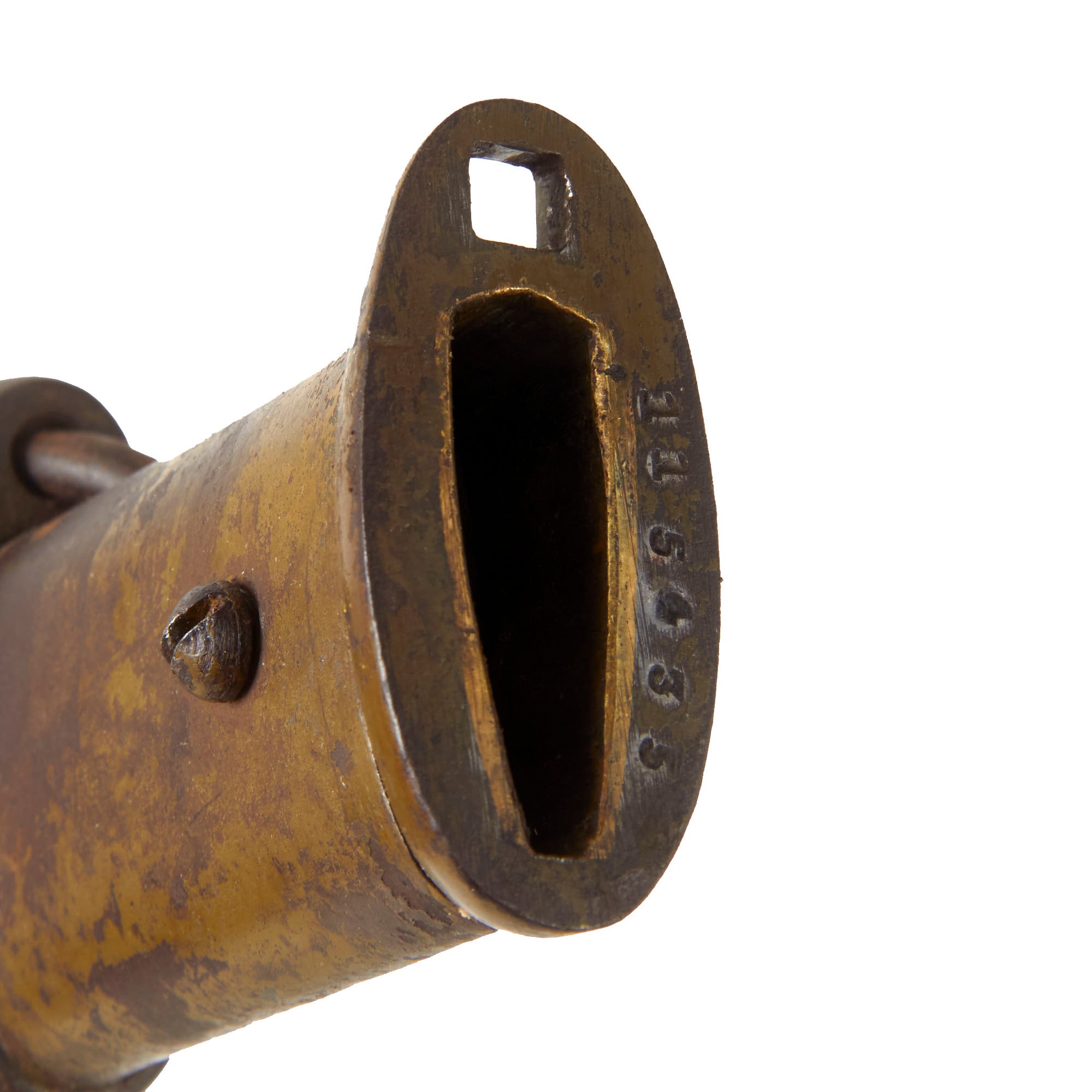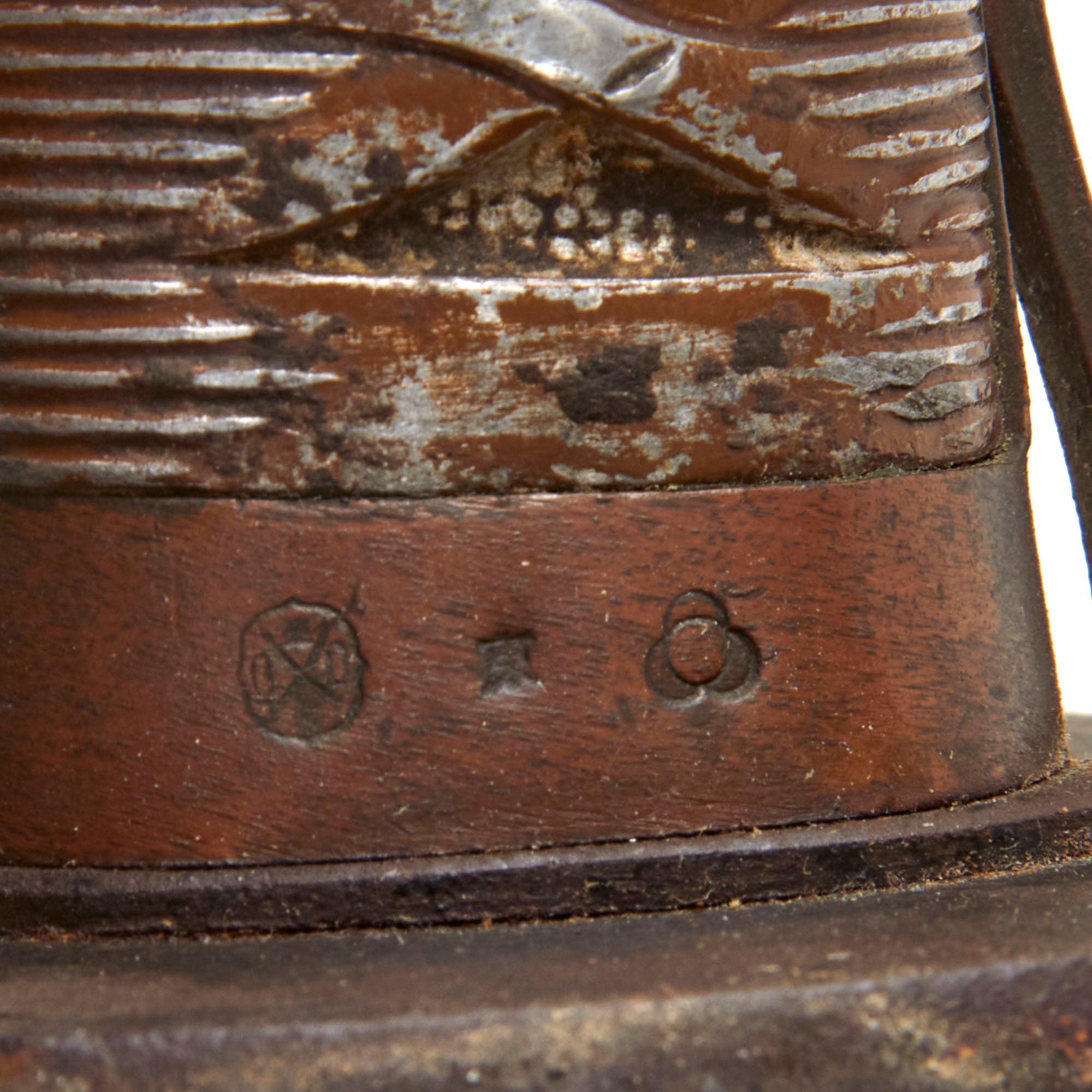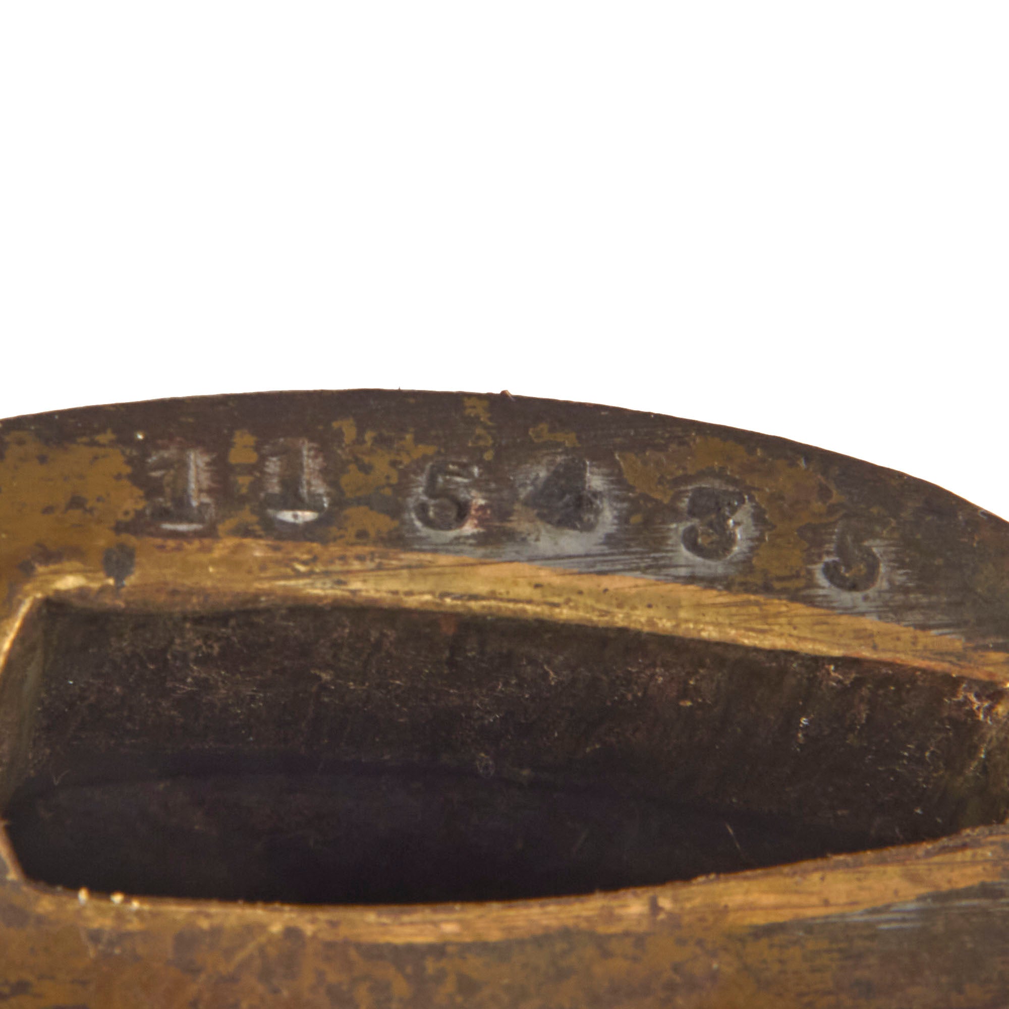 All NCO swords were numbered. This example has a matching serial number 115435 on both the blade and the throat of the scabbard. Most swords do not have matching numbers because somewhere along the life of the sword the scabbard was changed. Next to the serial on the blade is the 東 (To) marking for Tokyo Arsenal. The copper Fuchi (grip collar) of the sword is marked with information related to the swords production and inspection. While holding the sword hilt up, the first symbol on the left is the stylized sword Tsuba logo of Iijima Sword Factory, indicating that they produced the sword. To the right of the logo is 東 for inspection by Tokyo arsenal, and all the way to the right is the "Stacked Cannonball" logo of Kokura Arsenal, where the sword was put into arsenal for issue.
