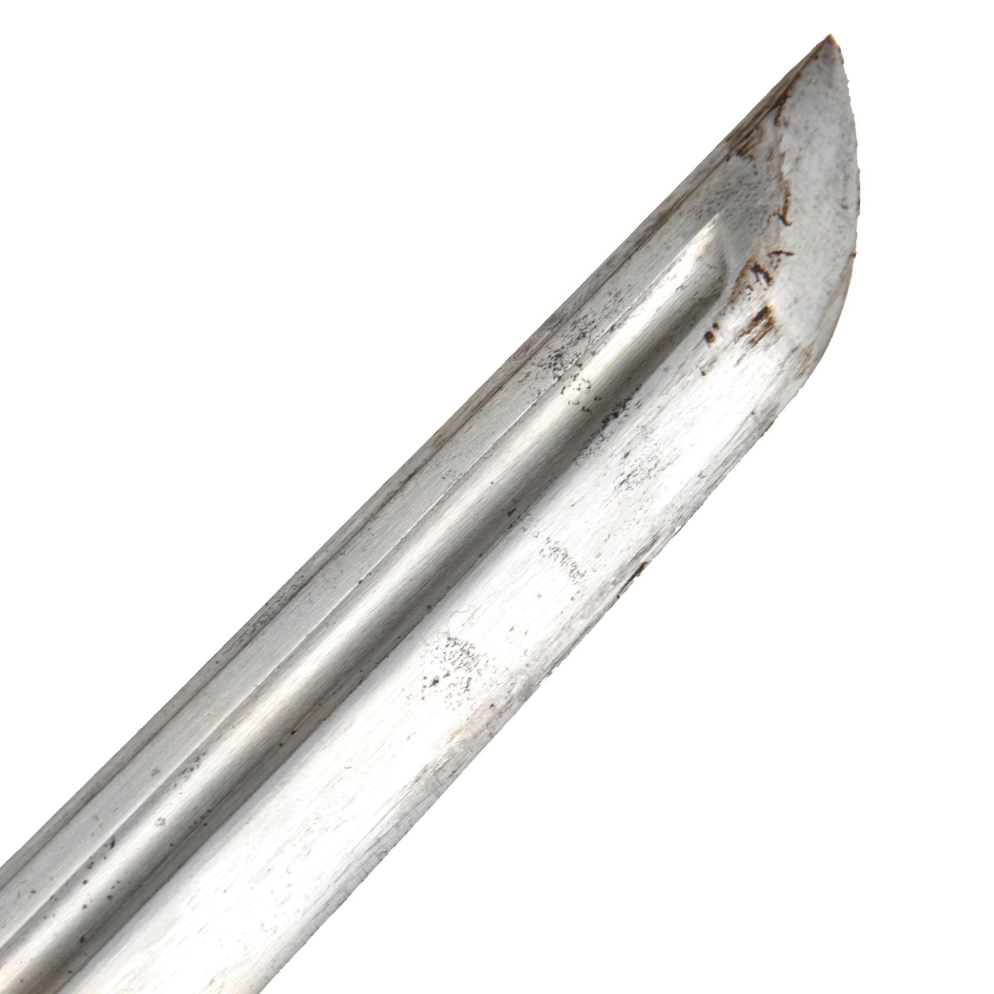 The condition of this sword overall is very good, and the blade is for the most part in great shape, bright and shiny. There is some light staining oxidation in a few areas, including near the point, but no real peppering or pit rust. The edge is great, without the dents and chips we would often see, and the blade surface does not show any major scuffing. It is still quite sharp and should be handled with care.