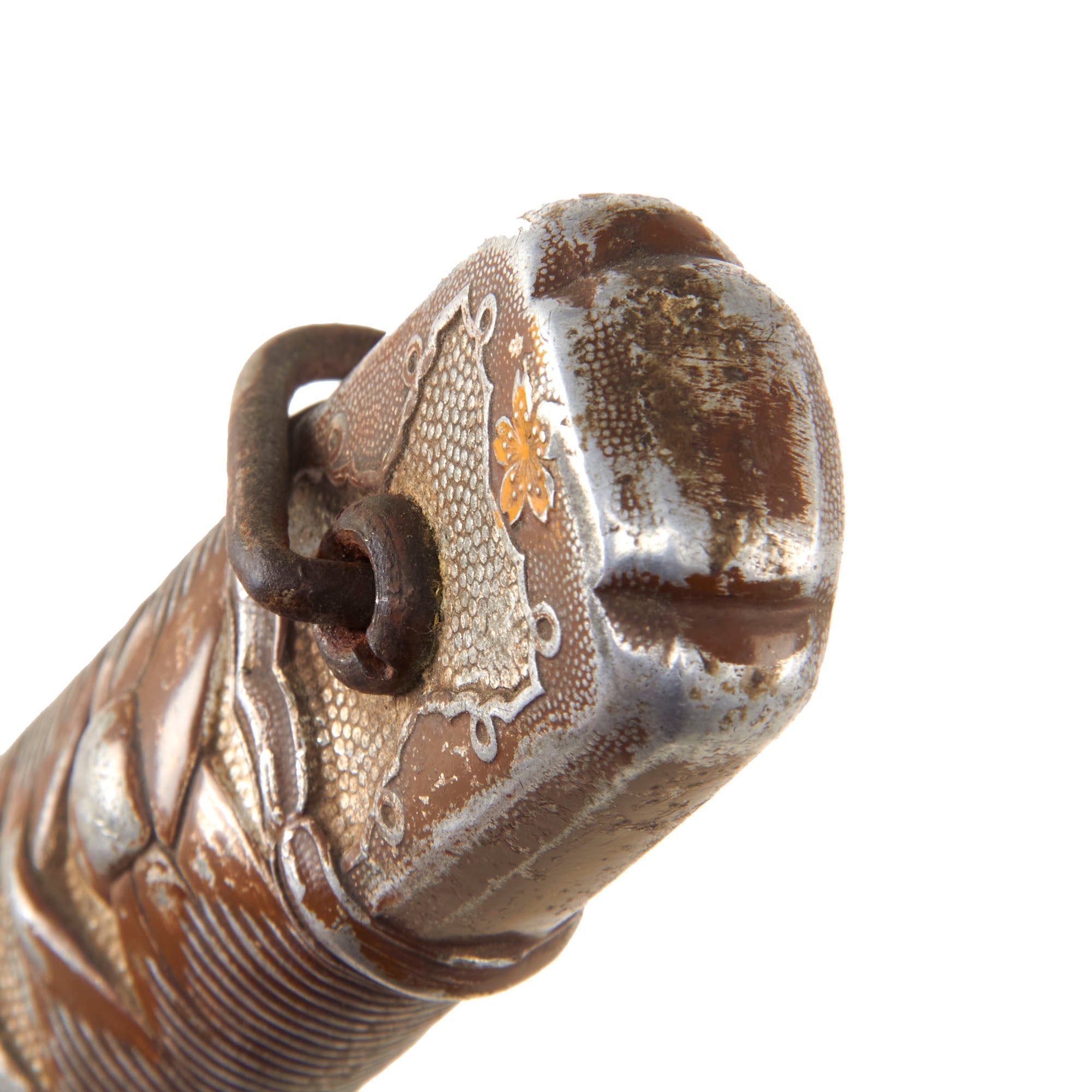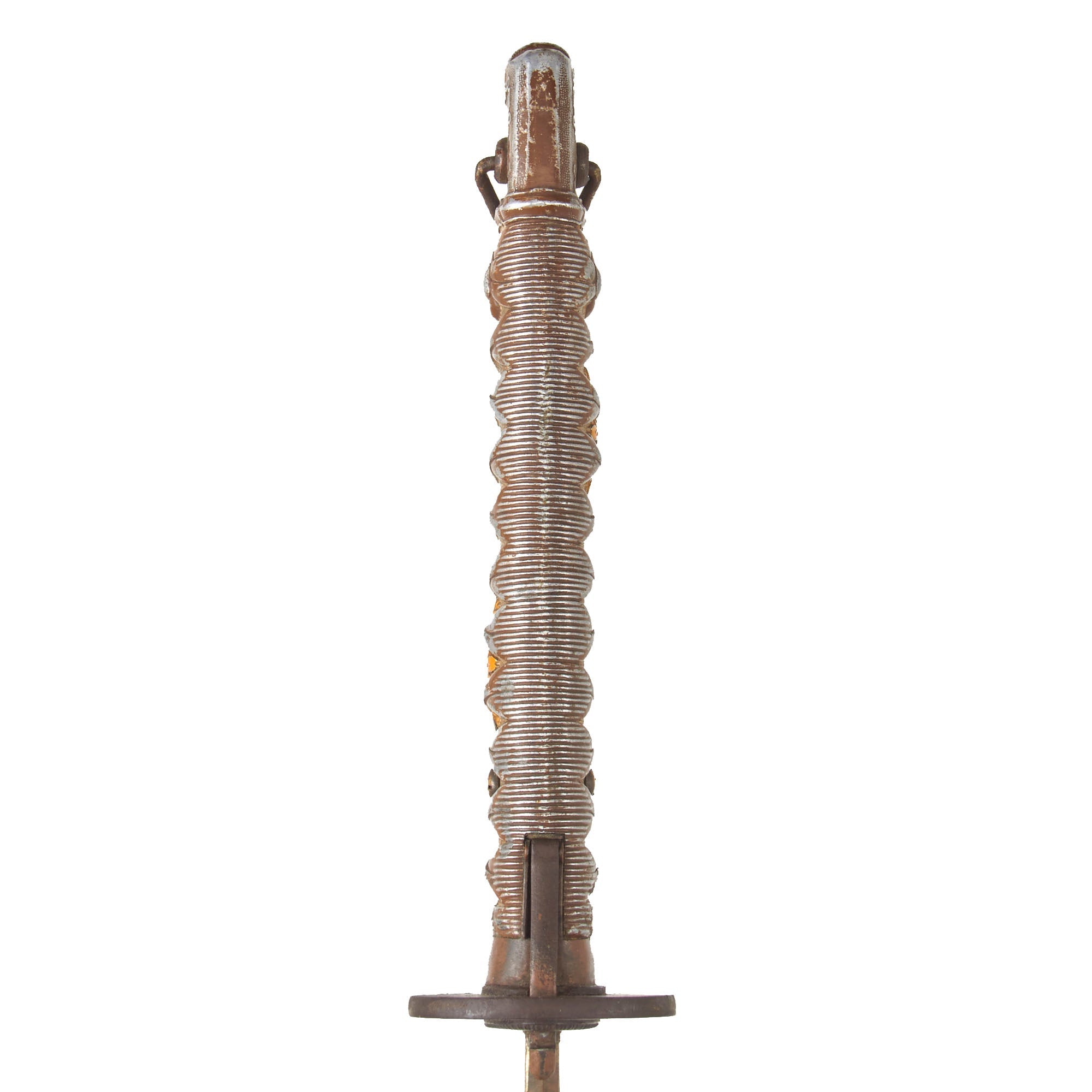 The sword is complete with the metal locking spring tab that secures the blade to the scabbard. This prevents the sword from falling when the soldier is running. Traditionally this function is assigned to the Habaki (blade collar). But machine made swords like this one do not have the accuracy of manufacturing that enable the Habaki to perform such a function. The metal loop on the pommel is still present and in very good condition.