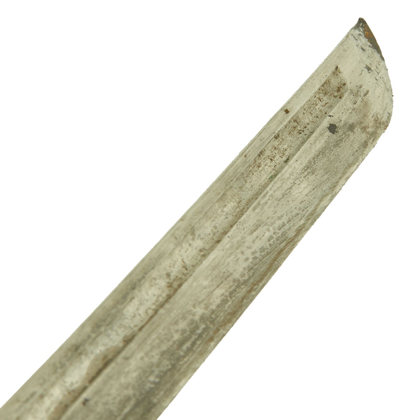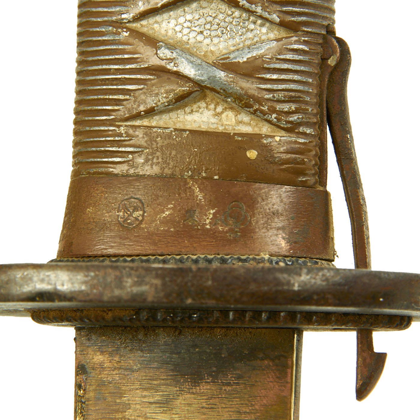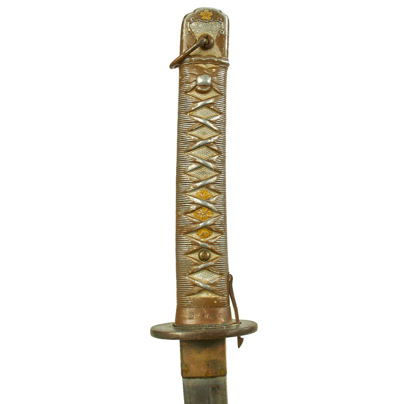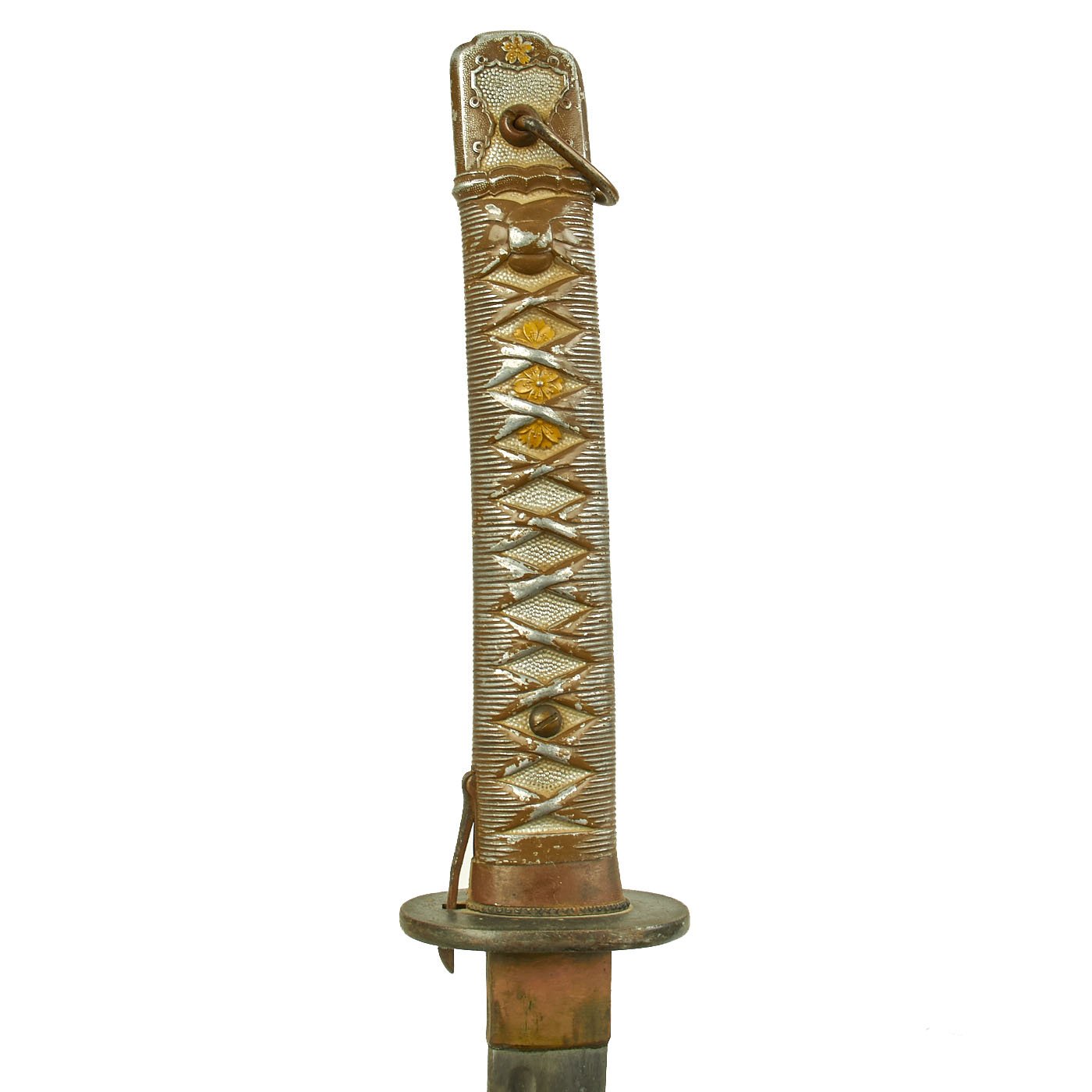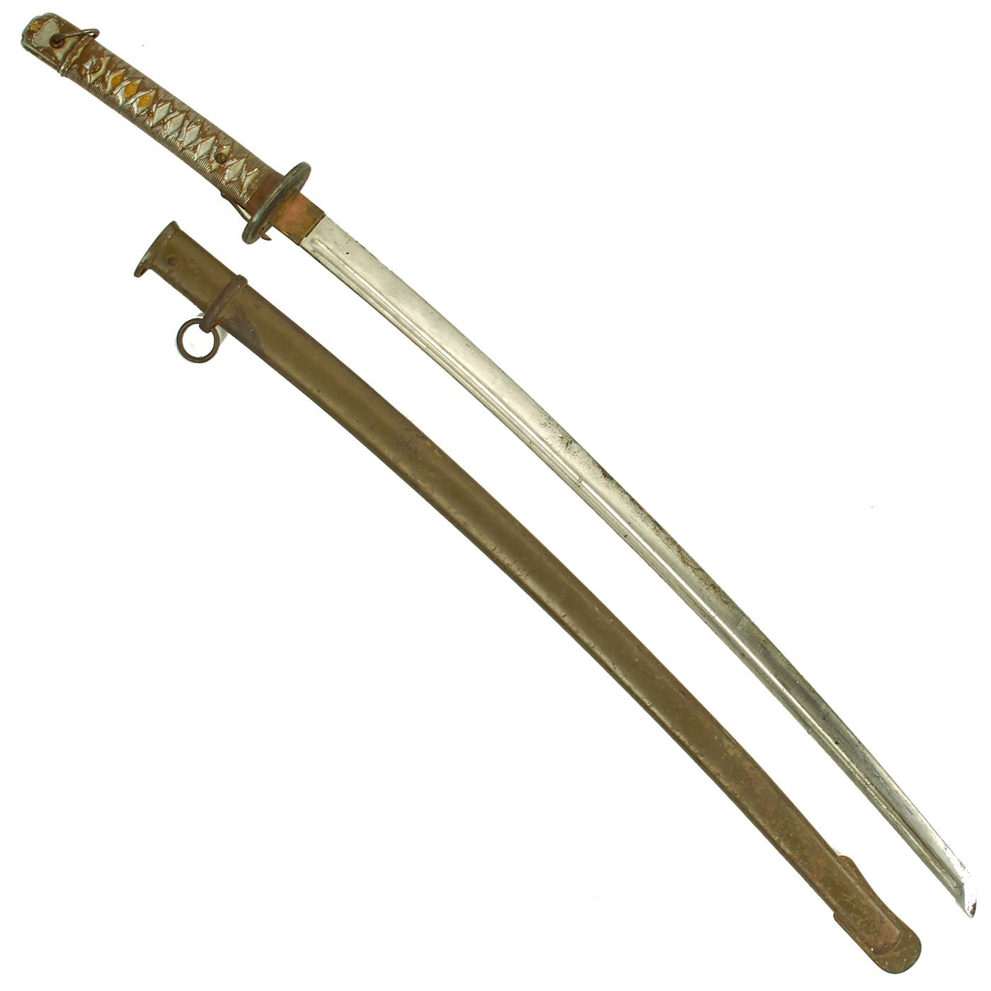 This service used example is a genuine WWII Japanese Type 95 NCO Samurai Sword or katana, with aluminum handle construction and machine made fullered blade. Blade is 26 1/4 inches long, with an overall length of 36 1/4inches. The grip wrapping and menuki are cast-formed, and then painted to give the illusion of fabric wrappings and gilt menuki.