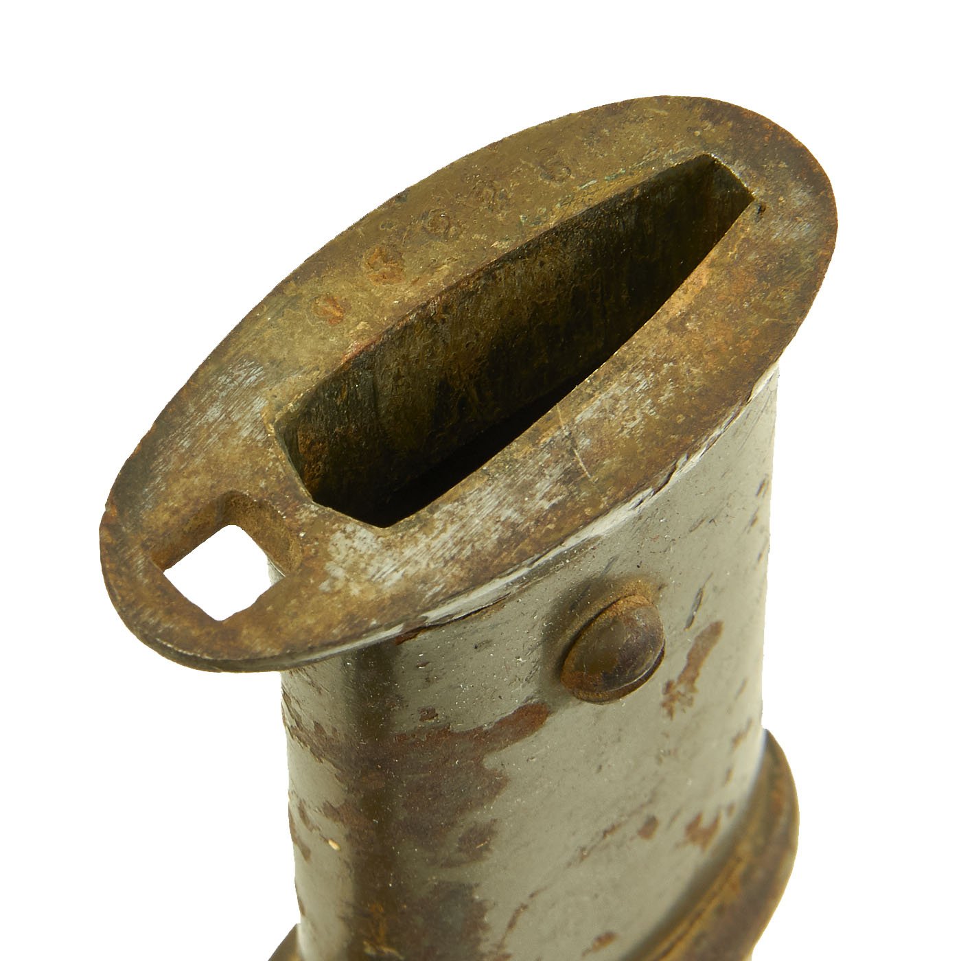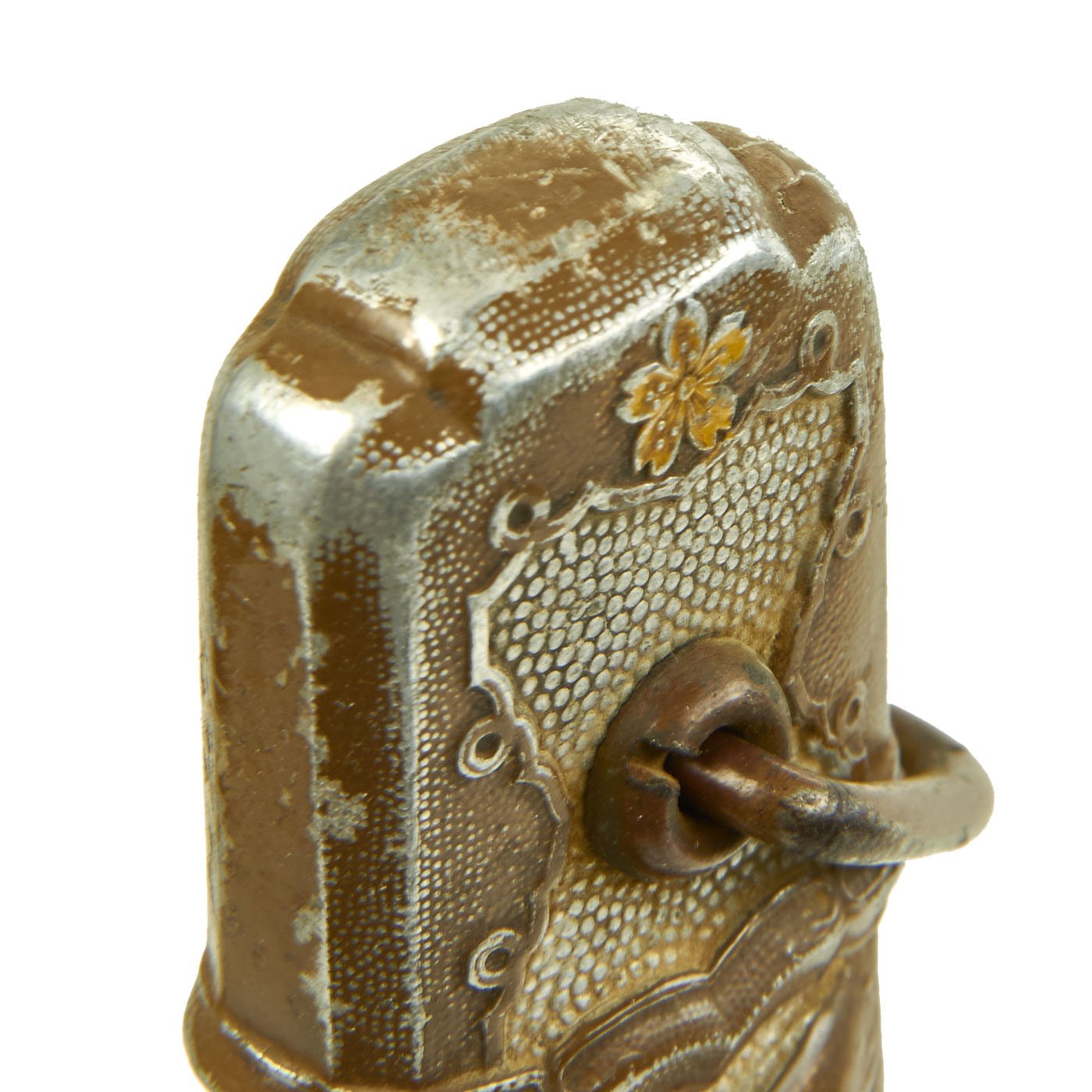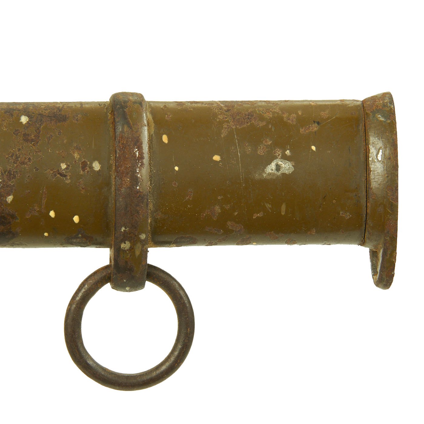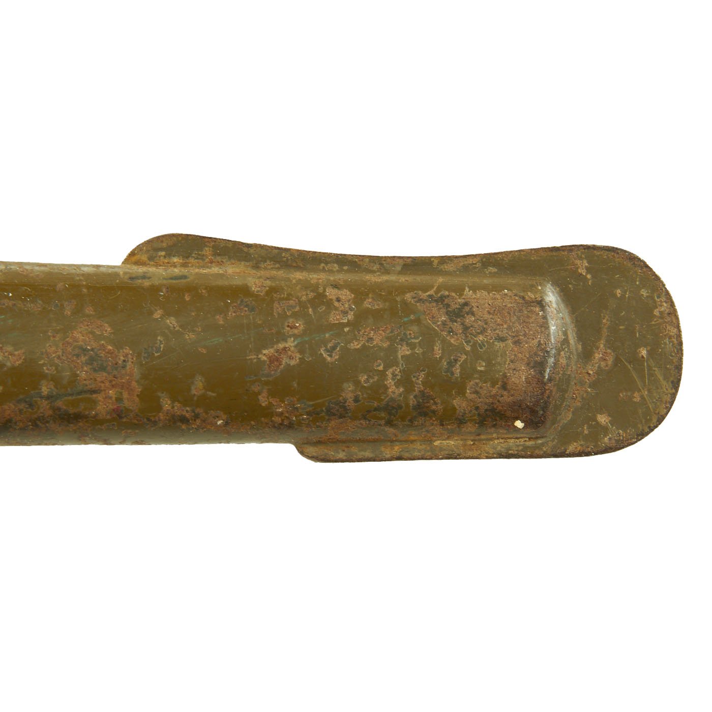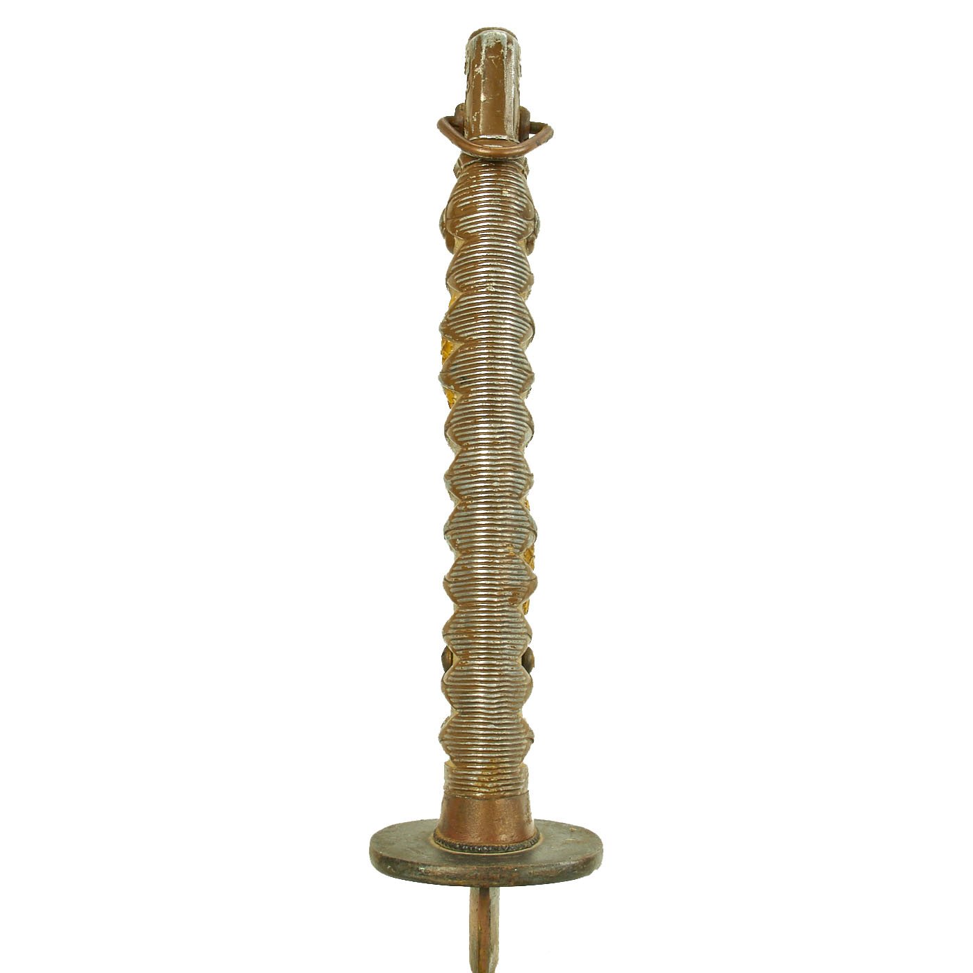 This service used example is a genuine WWII Japanese Type 95 NCO Samurai Sword or katana, with aluminum handle construction and machine made fullered blade. Blade is 26 1/4 inches long, with an overall length of 36 1/4inches. The grip wrapping and menuki are cast-formed, and then painted to give the illusion of fabric wrappings and gilt menuki.