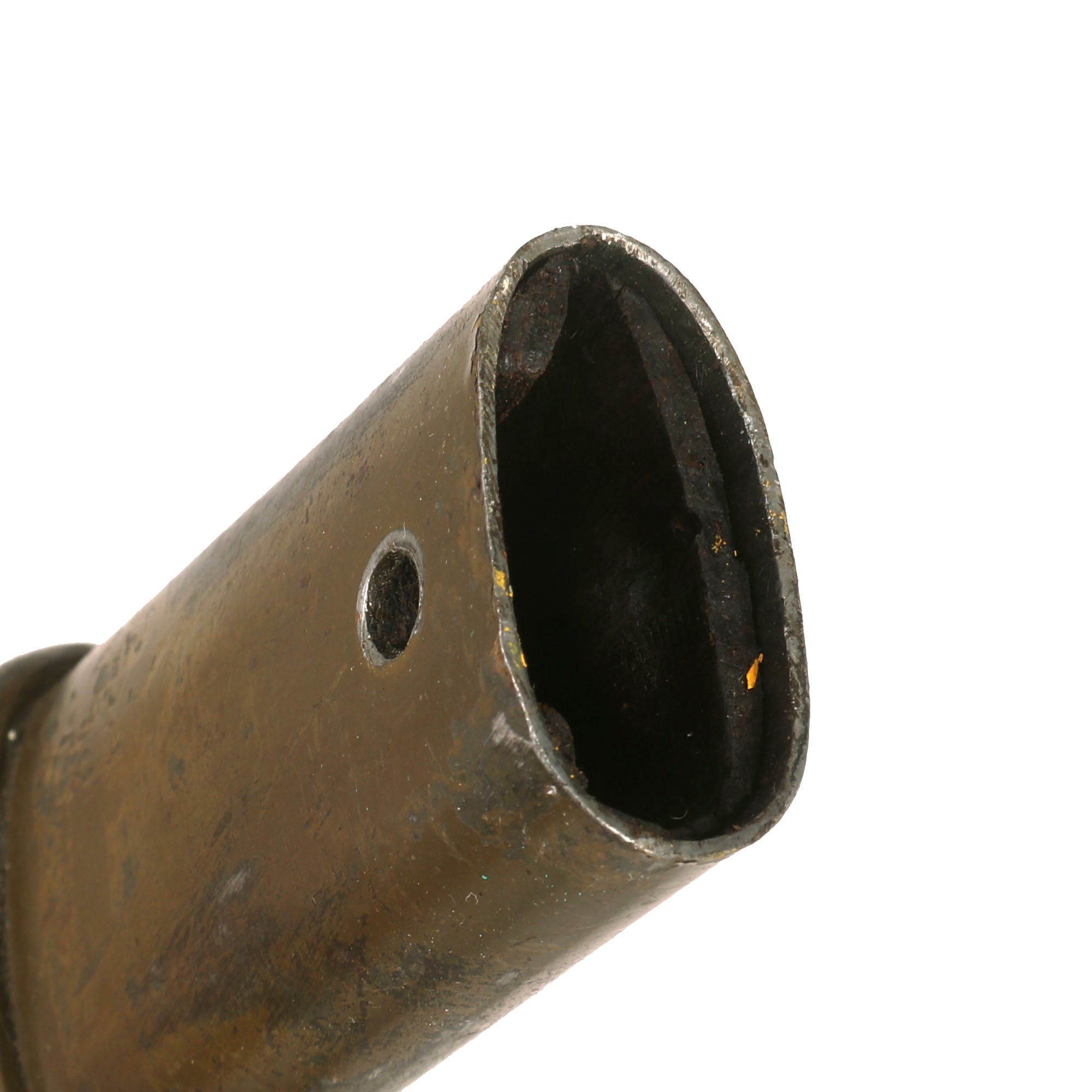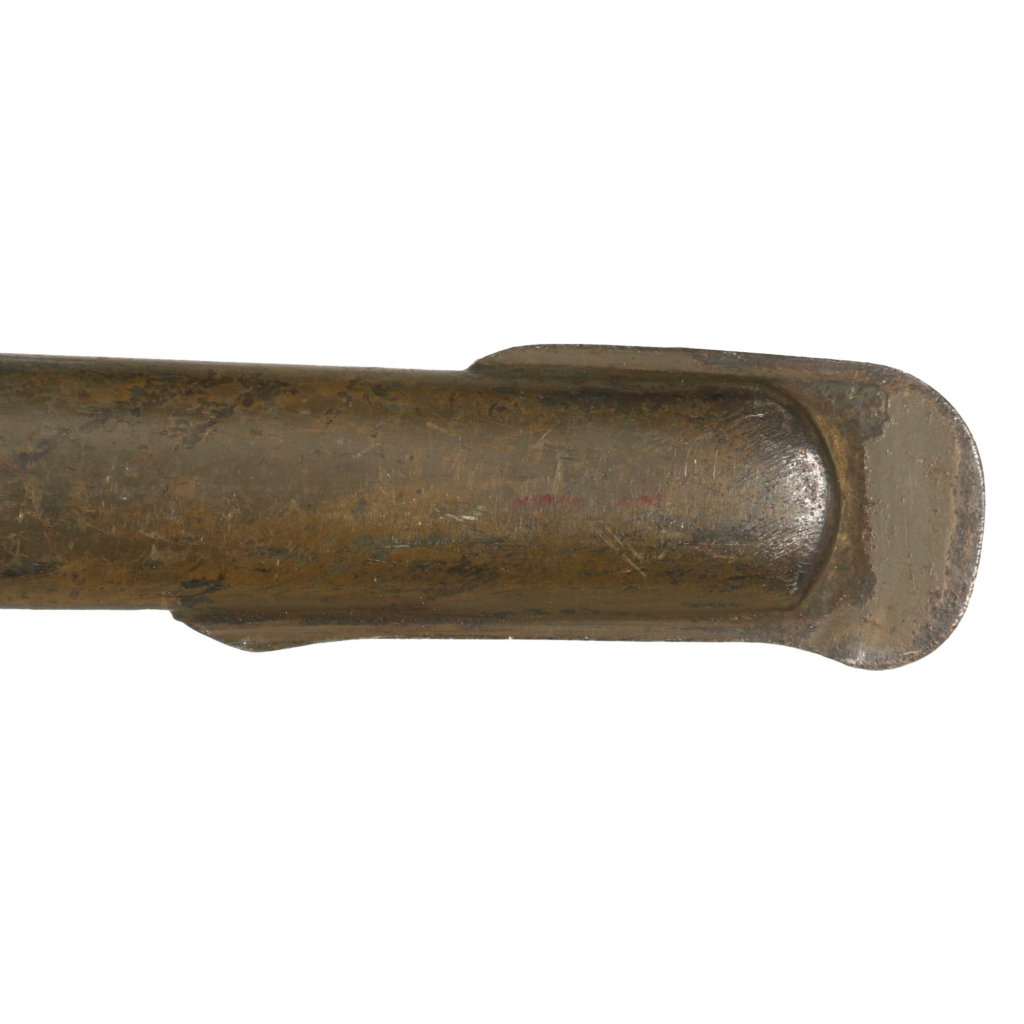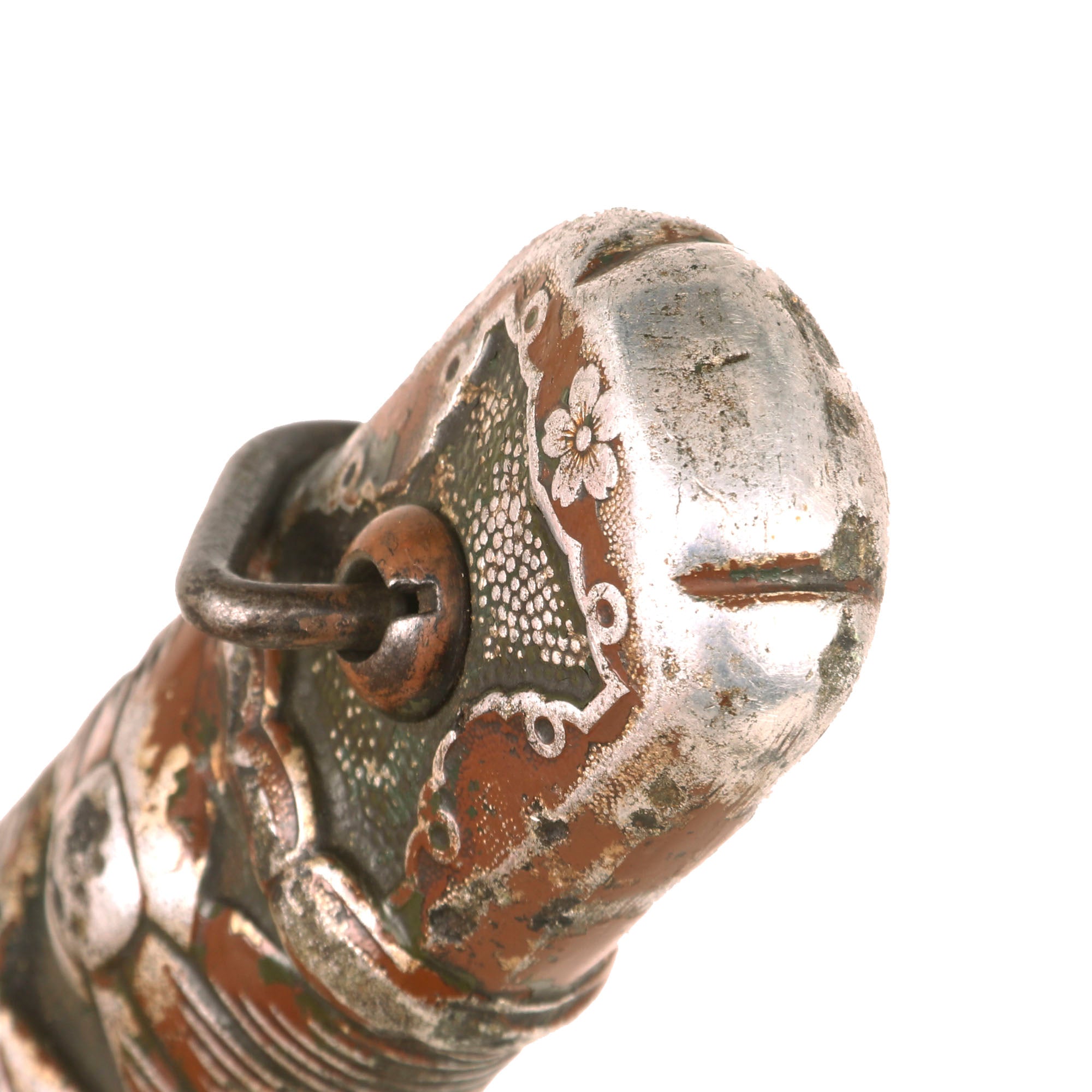 The hilt looks to have had the original brown paint mostly worn away, and we can see some pitting and other damage to the aluminum material. The yellow highlights on the cast in cherry blossoms are completely gone. The tsuba (crossguard) is the early-mid war brass MOKKO GATA (quince) shape, with holes in both sides to reduce weight. Later swords would be fitted with simple iron round tsuba. The blade collar (habaki) is the standard brass. The scabbard still has the original paint, though it has also suffered wear and and loss of the throat, as shown.
