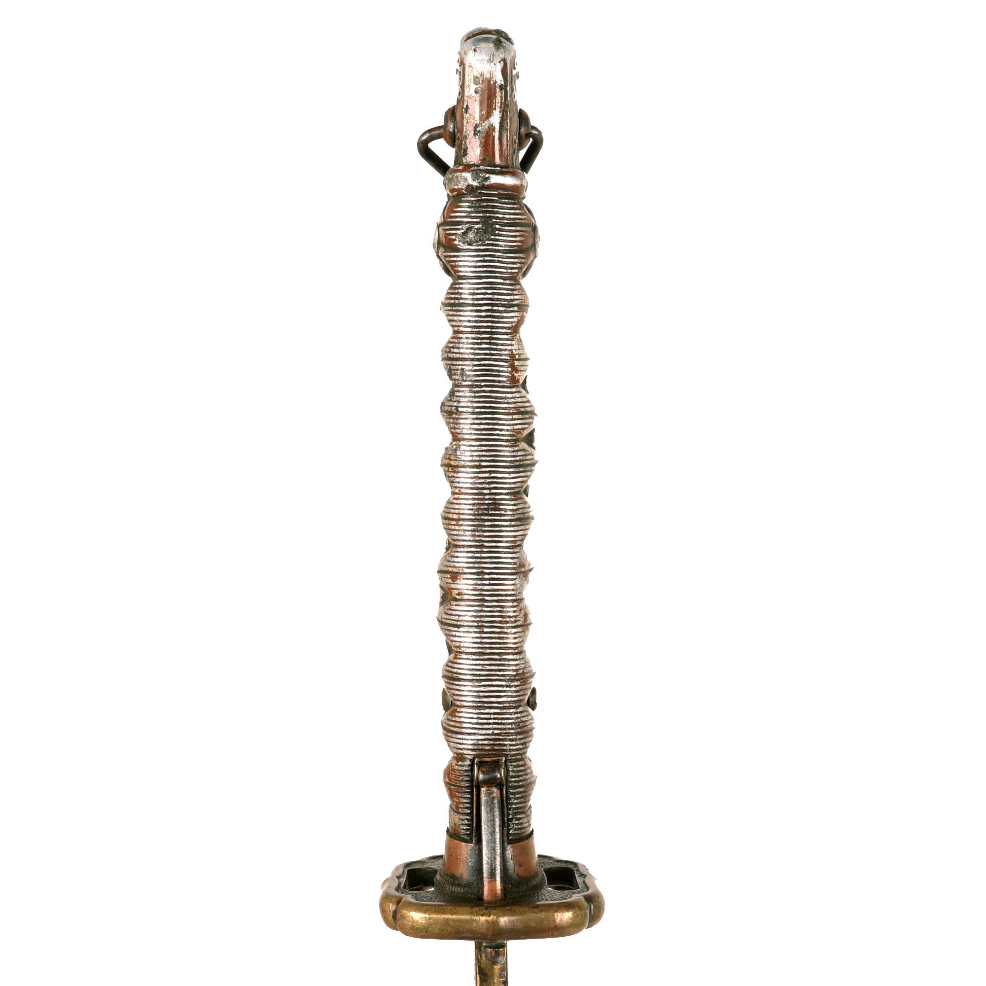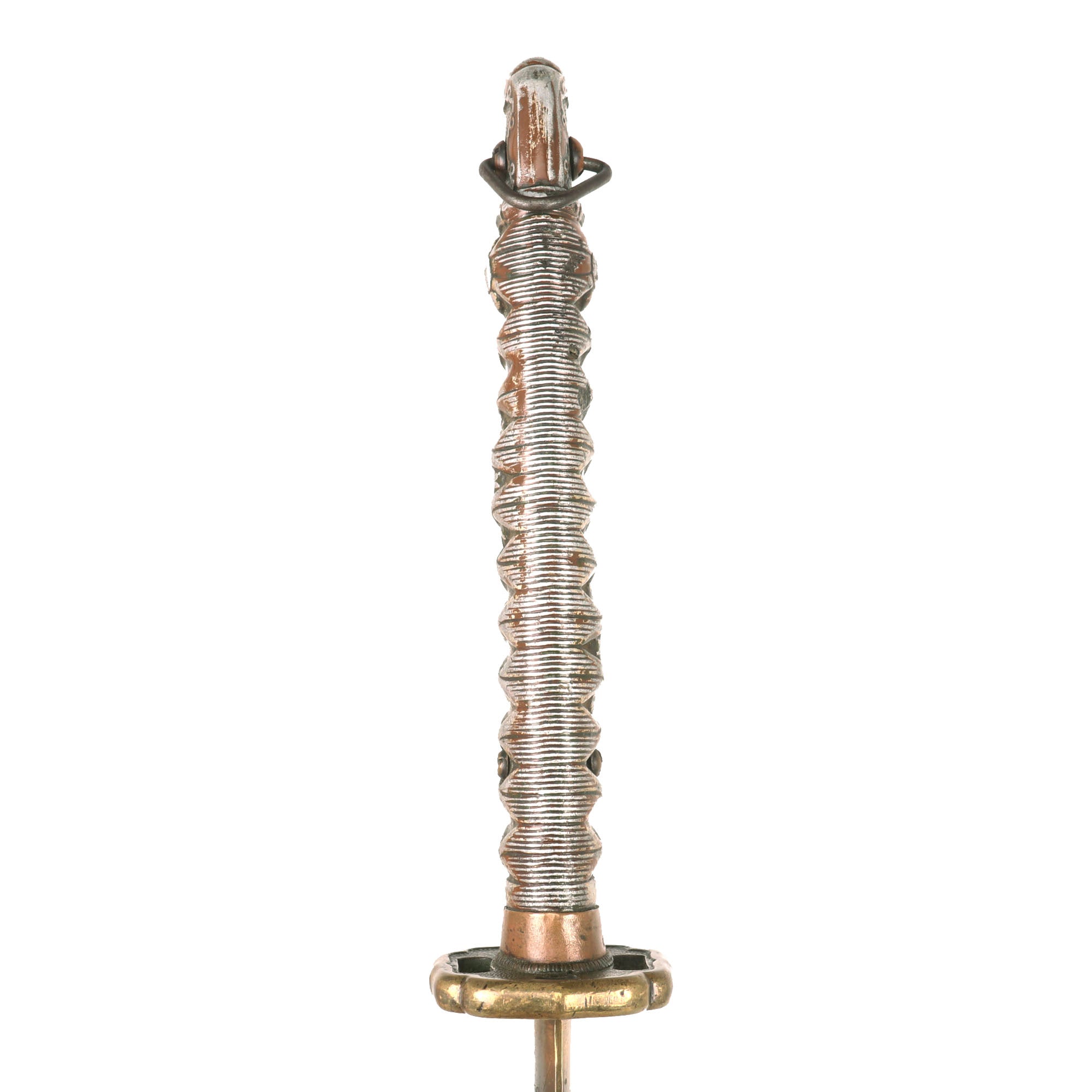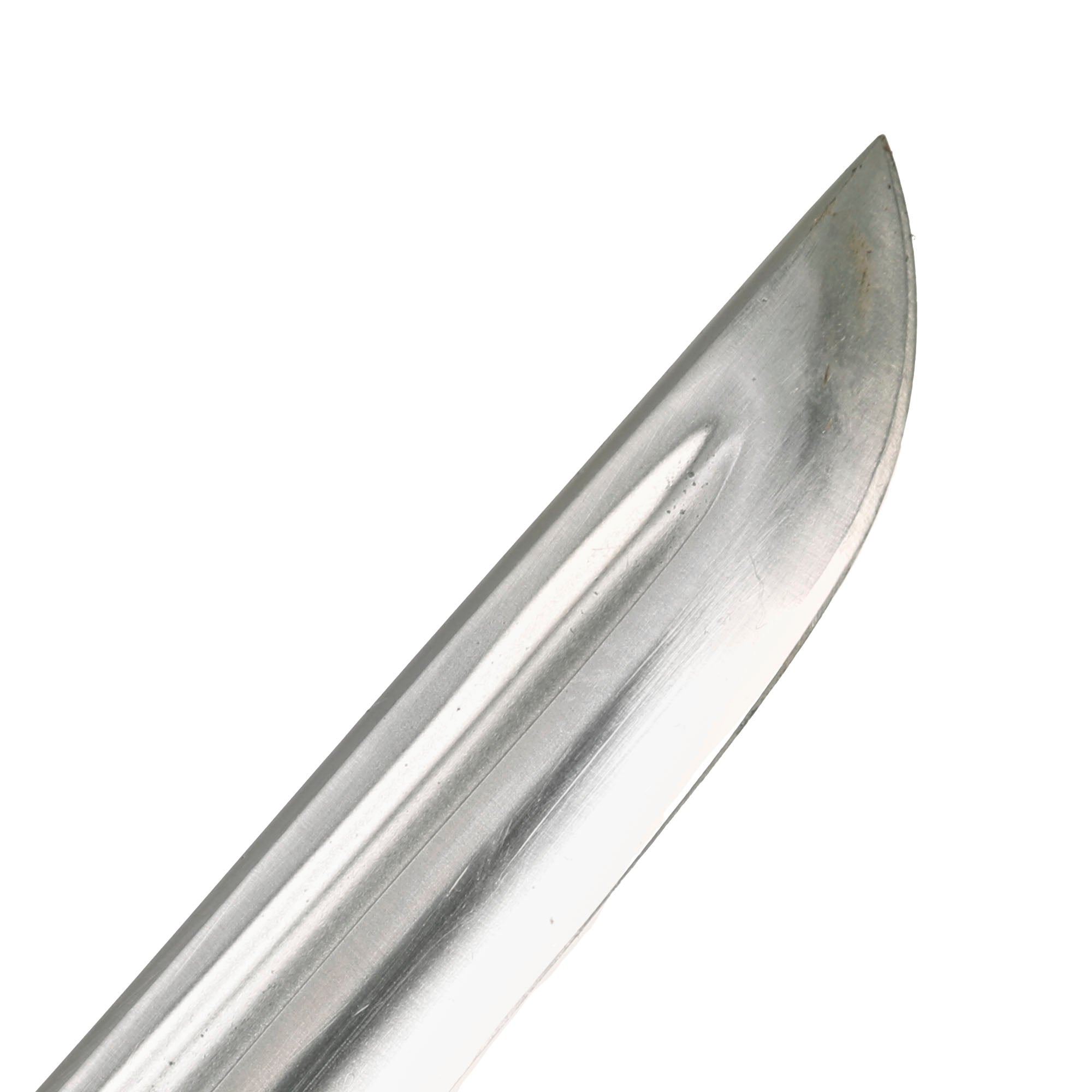 The sword is complete with the metal locking spring tab that secures the blade to the scabbard, however as the scabbard has no throat, it no longer locks into place. This would normally prevent the sword from falling when the soldier is running. Traditionally this function is assigned to the Habaki (blade collar). But machine made swords like this one do not have the accuracy of manufacturing that enable the Habaki to perform such a function.