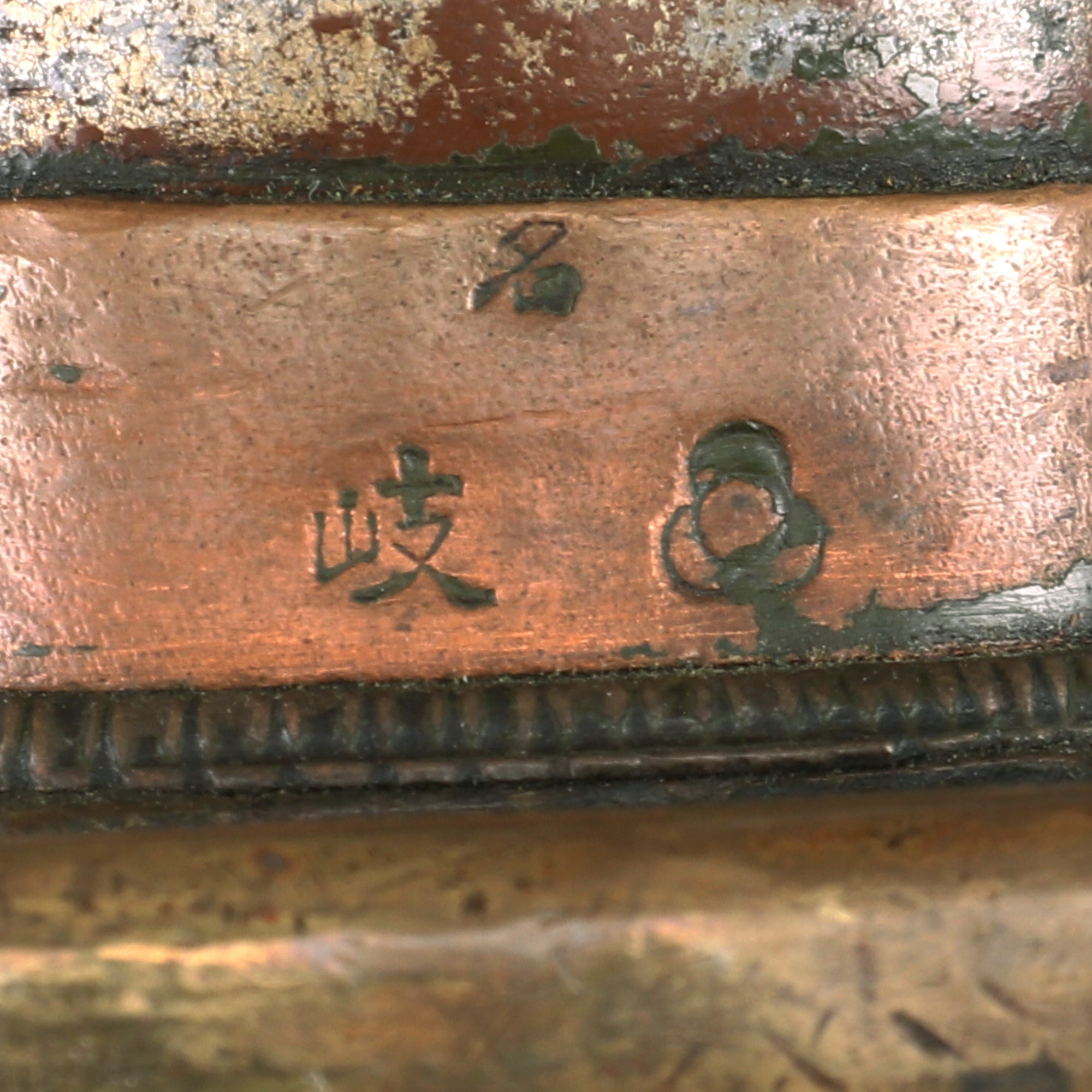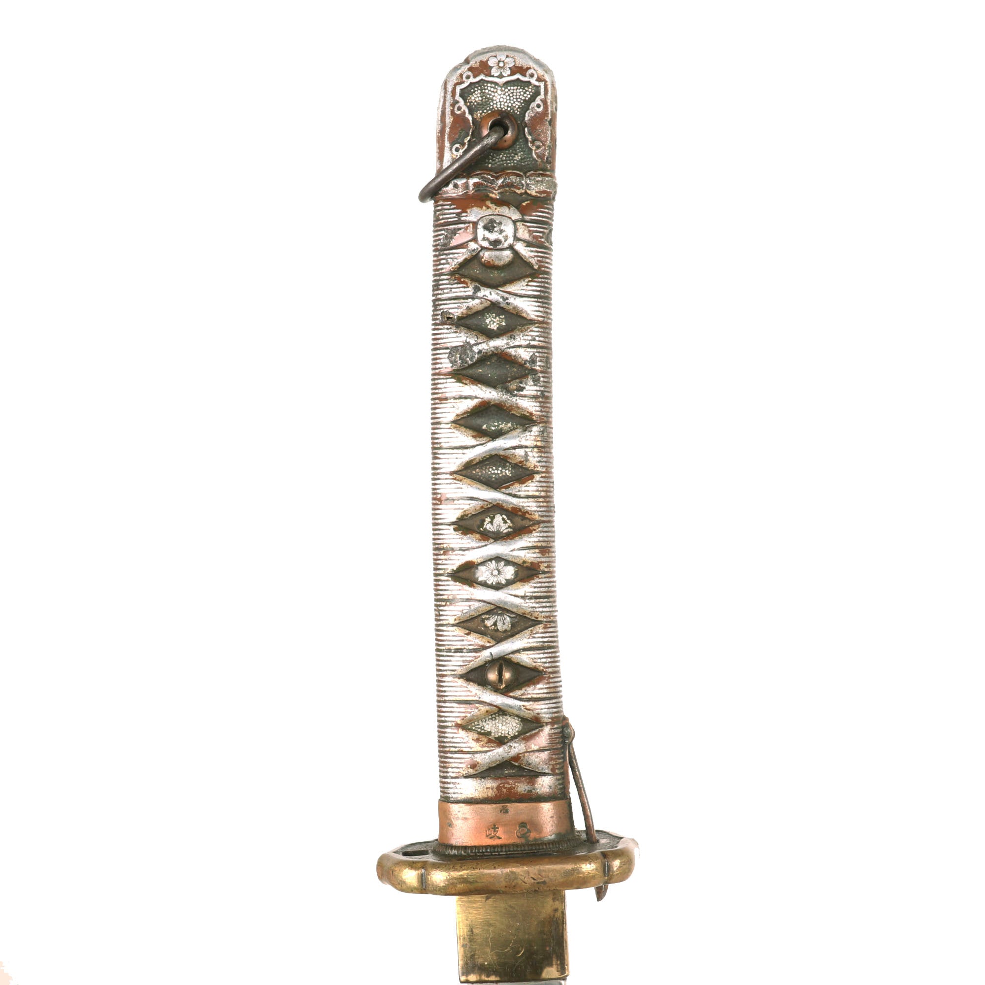 The Fuchi (grip collar) of the sword is marked with information related to the swords production and inspection. While holding the sword hilt up, the first character on the left is 岐, for manufacture by the Gifu sword company, and to the right of that is 名 for inspection by Nagoya arsenal. All the way to the right is the "stacked cannonball" logo of Kokura arsenal, where the sword was put into arsenal for issue.
