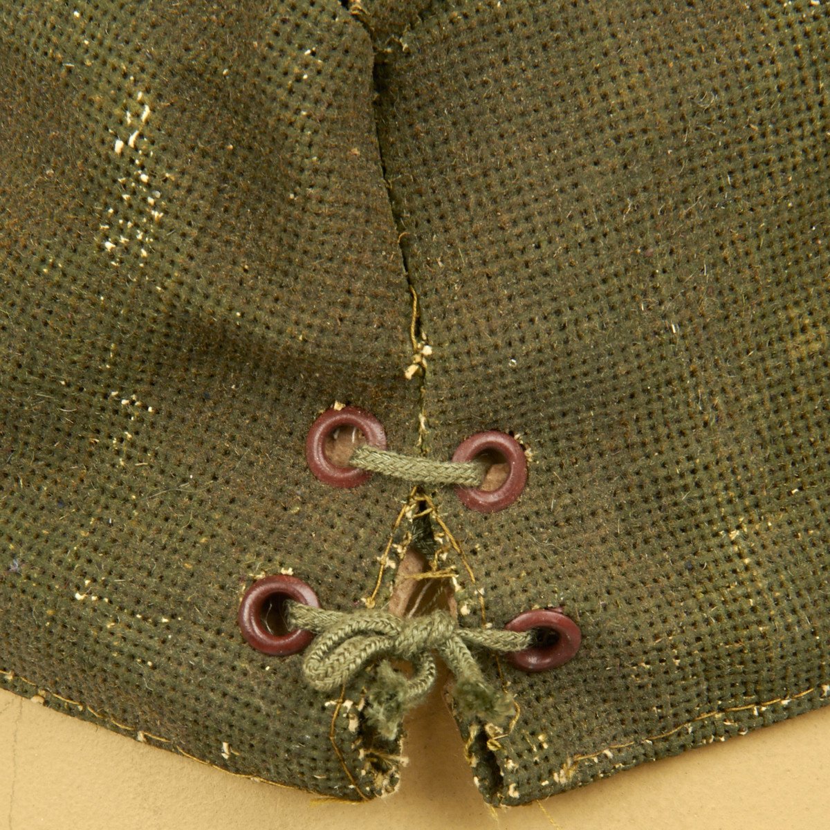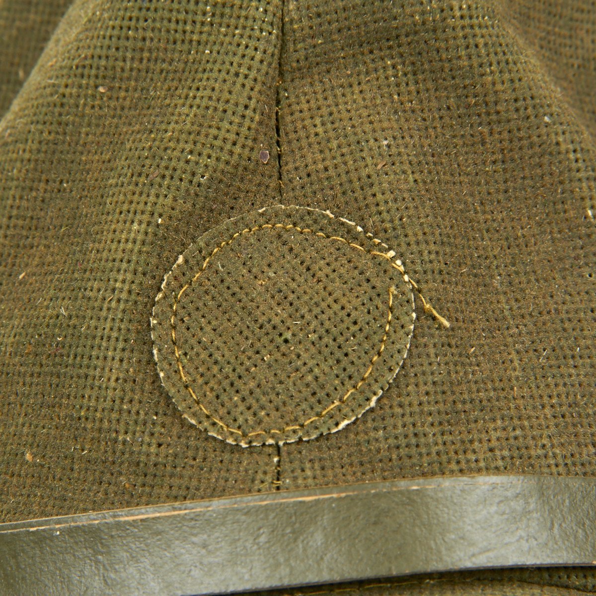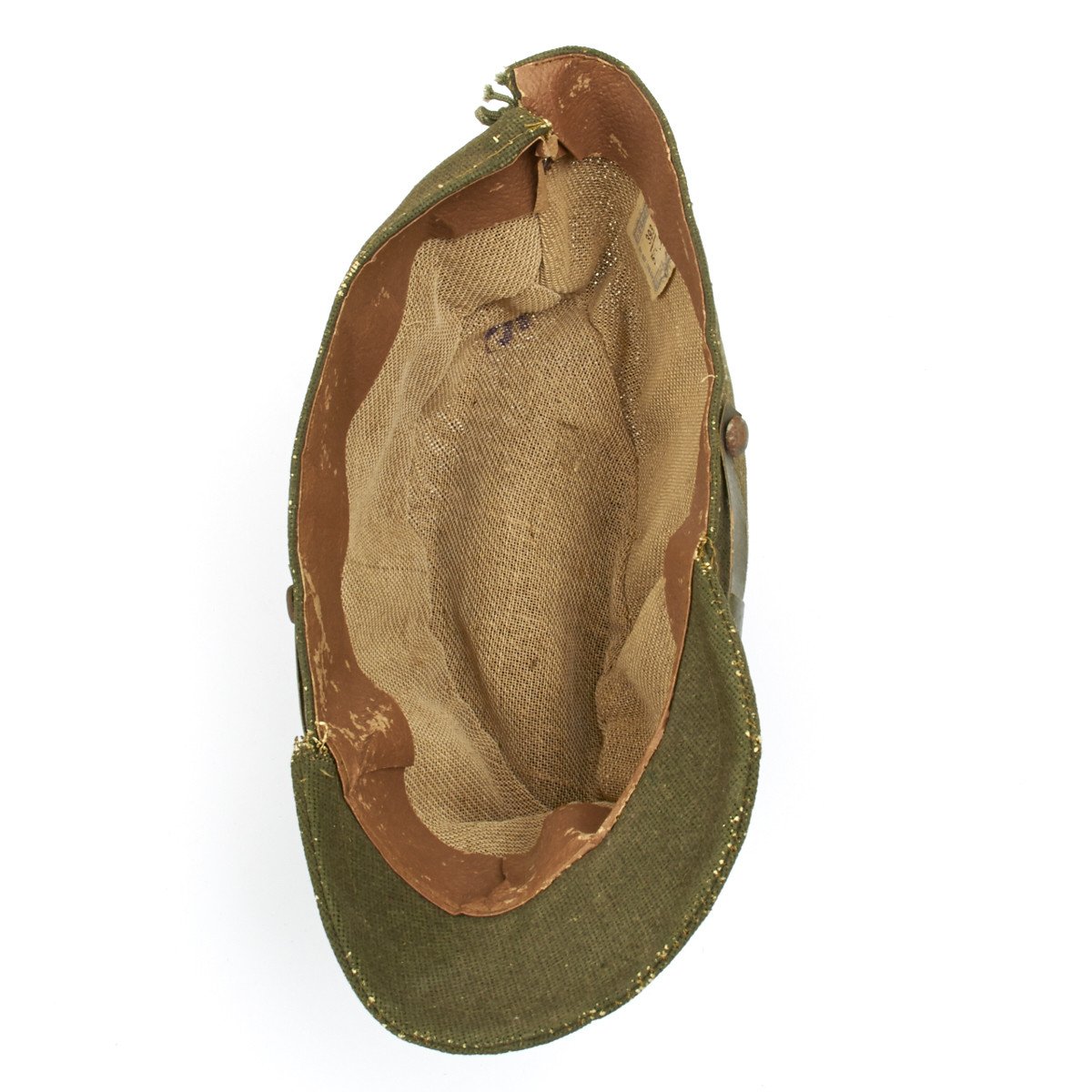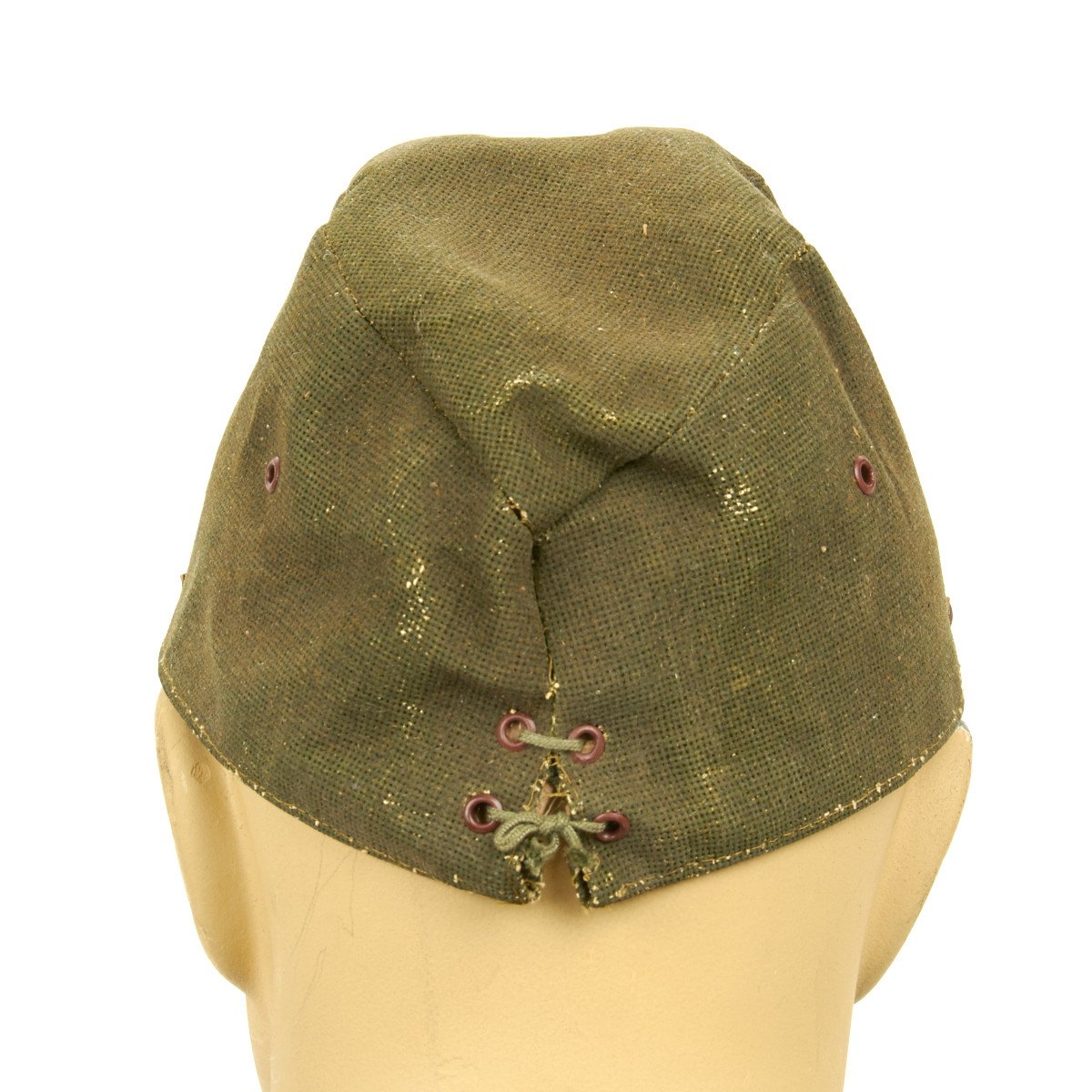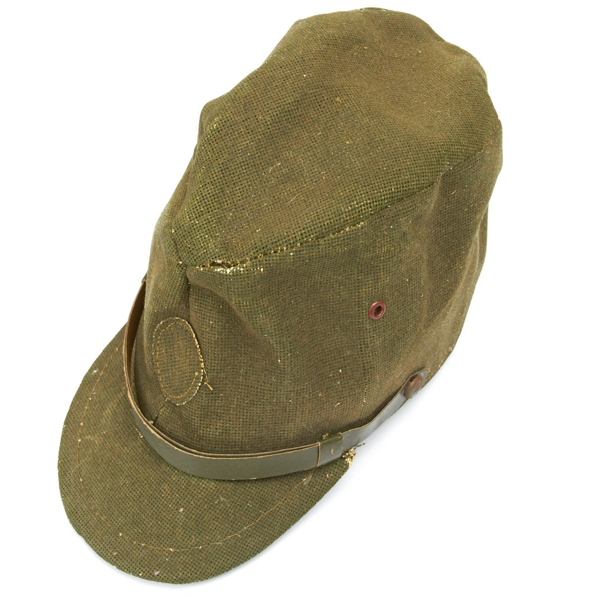 Campaign cap -- Sen-bou -introduced in 1938; manufactured in various materials, it was the most characteristic headgear of the Japanese soldier. It always bears either the yellow star of the Army or the anchor of the Imperial Marines on the front. This example had the star removed and tightens at the rear by means of a lace it is constructed of a hessian' type material and comes complete with original paper label and leather chinstrap.