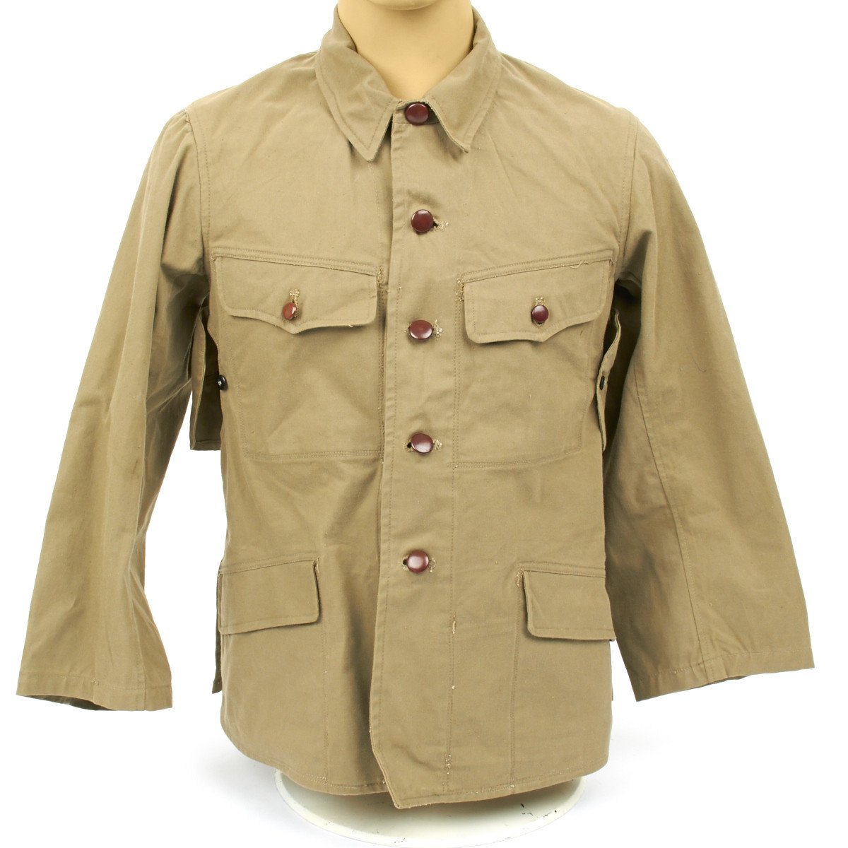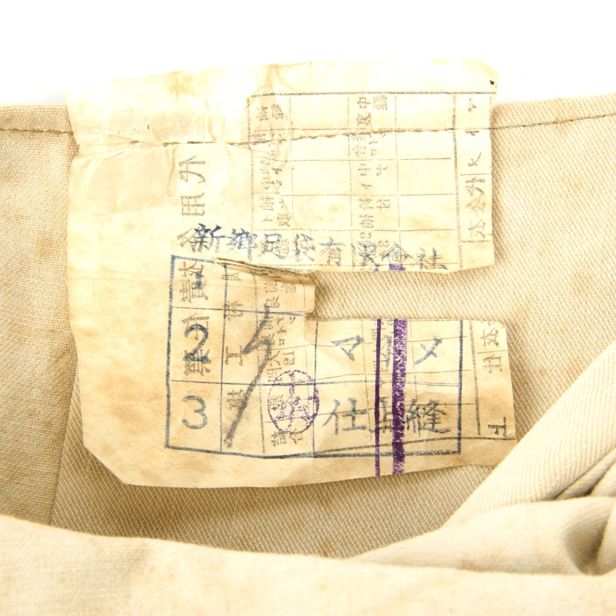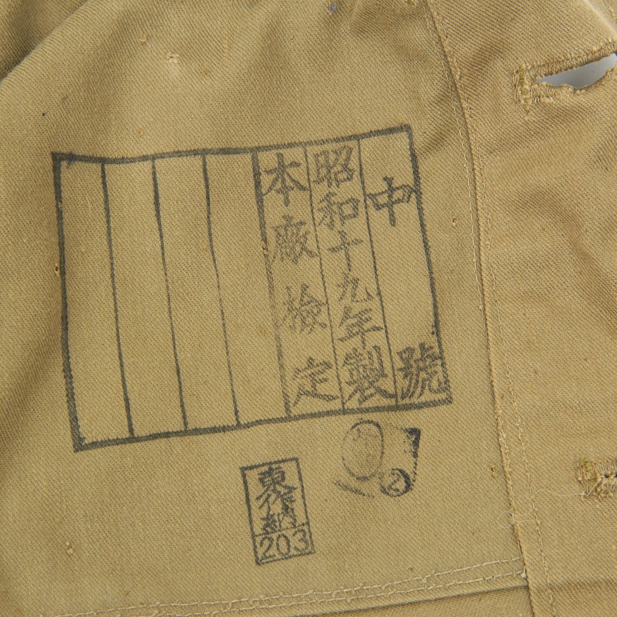 Cotton shirt -- Bousho Jyu-han -- normally worn under a tunic, but worn alone in hot climates; it buttons all the way down the front, and has two breast pockets and arm pit ventilation flaps. Offered in almost unissued condition with extensive markings on the inside under left breast pocket. Approximate size 30 inches.