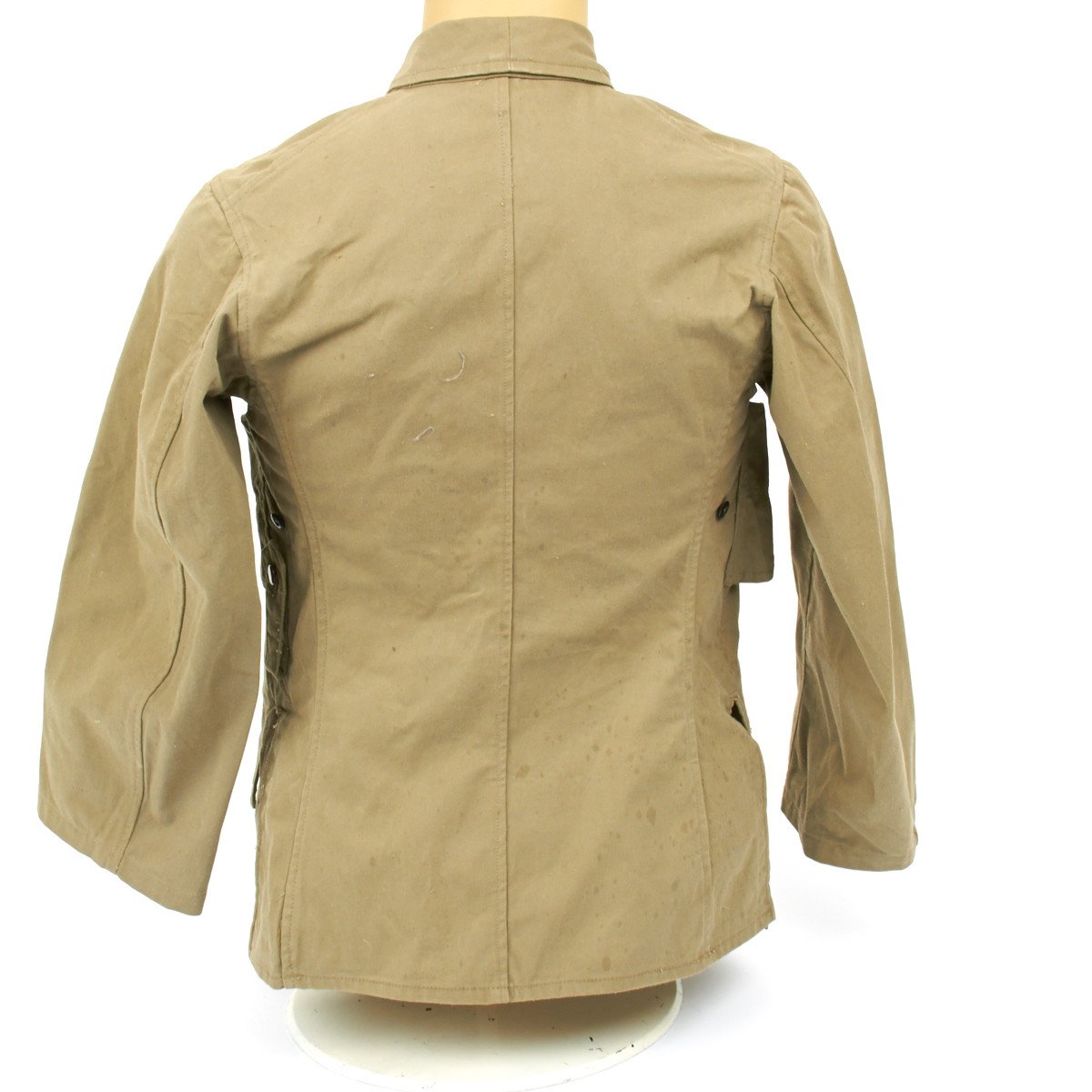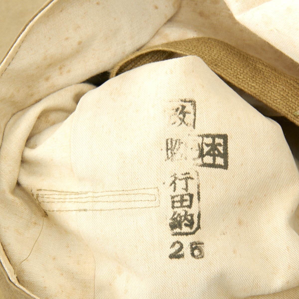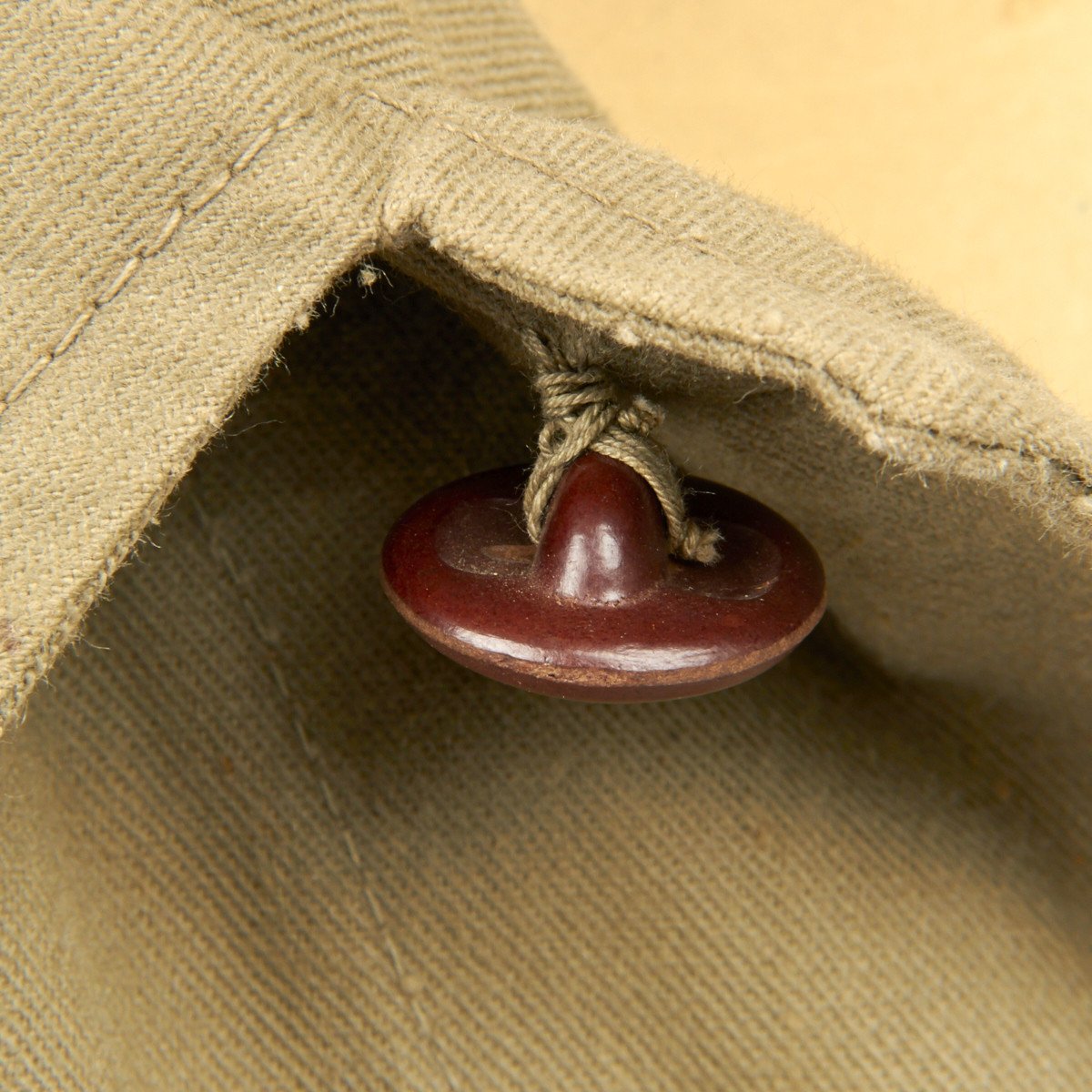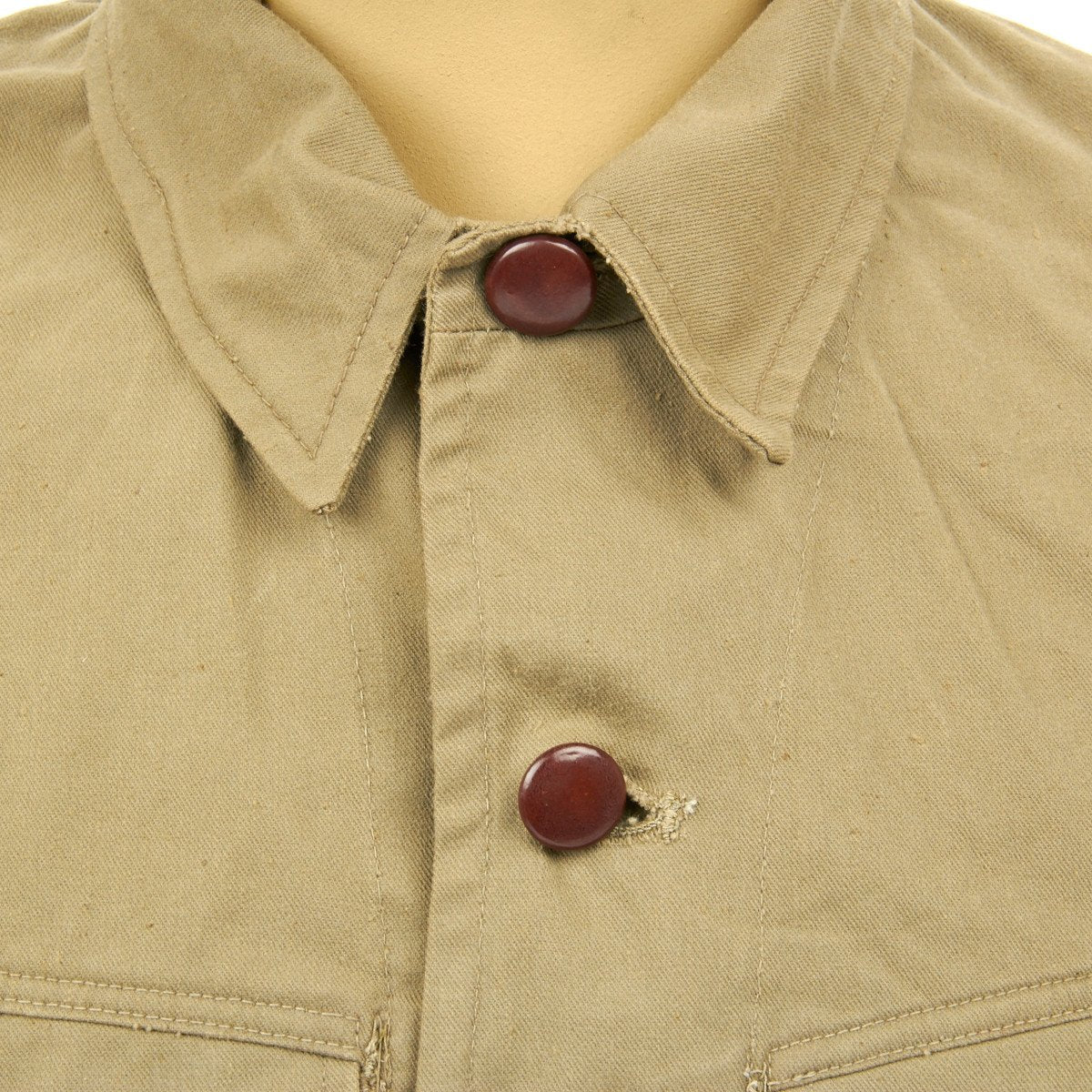 Cotton shirt -- Bousho Jyu-han -- normally worn under a tunic, but worn alone in hot climates; it buttons all the way down the front, and has two breast pockets and arm pit ventilation flaps. Offered in almost unissued condition with extensive markings on the inside under left breast pocket. Approximate size 30 inches.