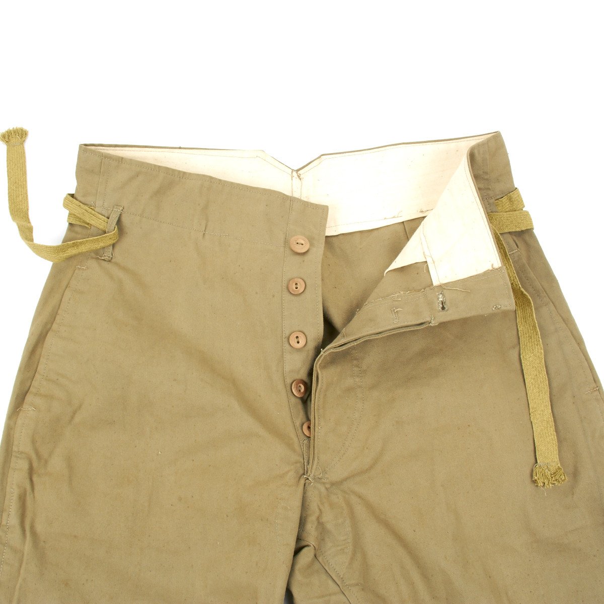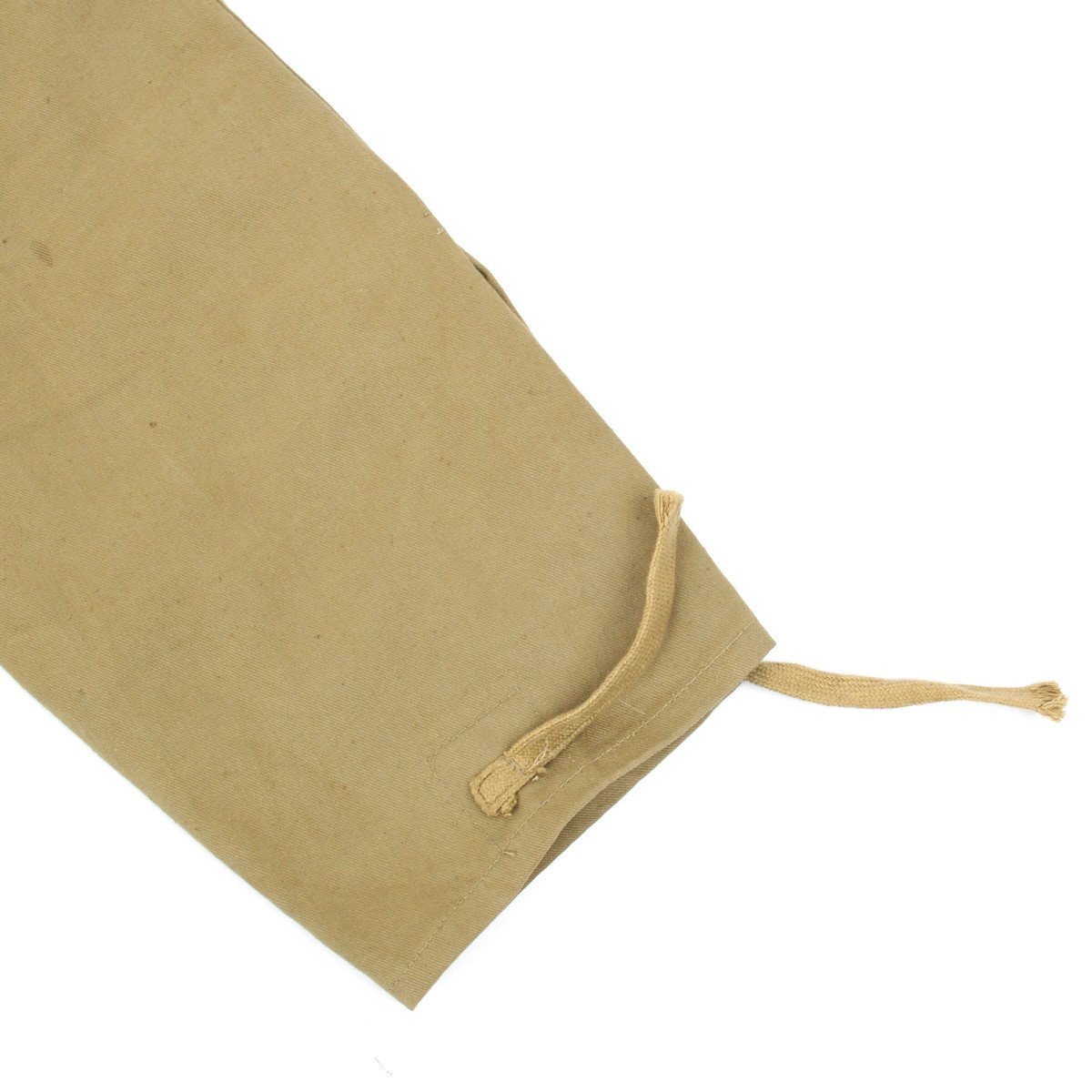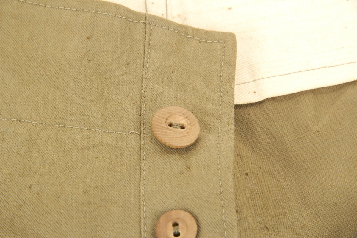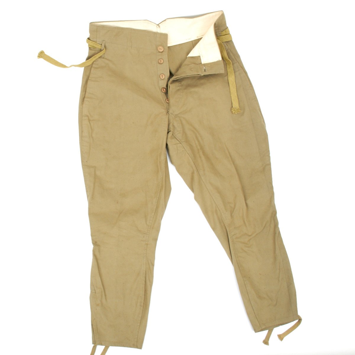 Cotton 'half-breeches' -- Bousyo-ko -- gathered at the ankle by buttons or laces. The outline of these trousers varied, from something resembling jodhpurs to a straighter 'plus-fours' shape. Offered in almost unissued condition with extensive markings on the inside. Approximate size 30 inches.