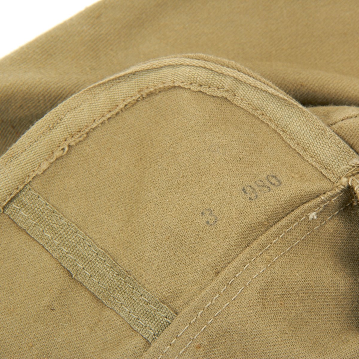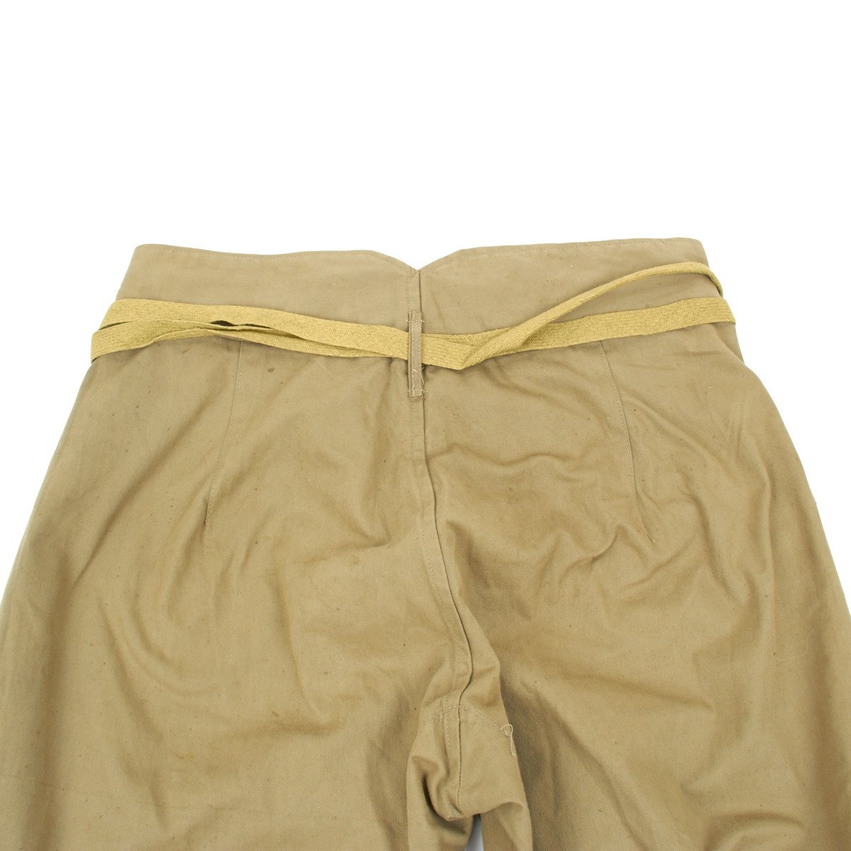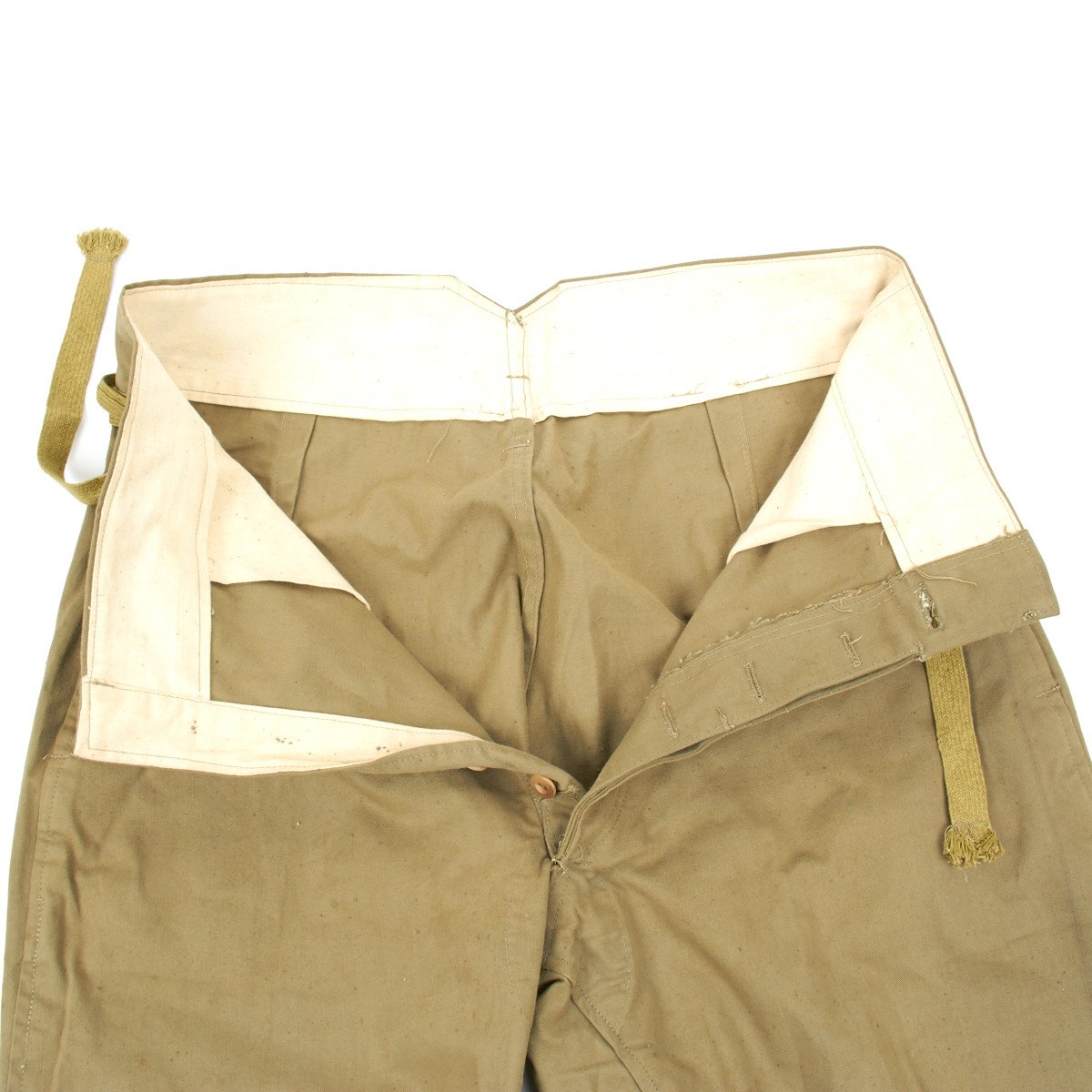 Cotton 'half-breeches' -- Bousyo-ko -- gathered at the ankle by buttons or laces. The outline of these trousers varied, from something resembling jodhpurs to a straighter 'plus-fours' shape. Offered in almost unissued condition with extensive markings on the inside. Approximate size 30 inches.