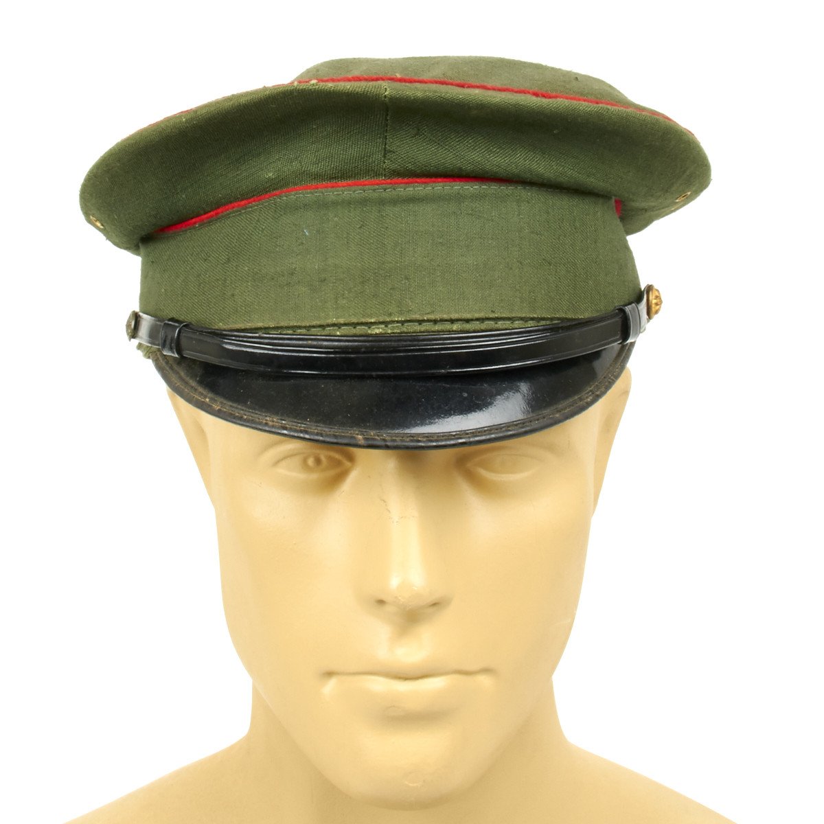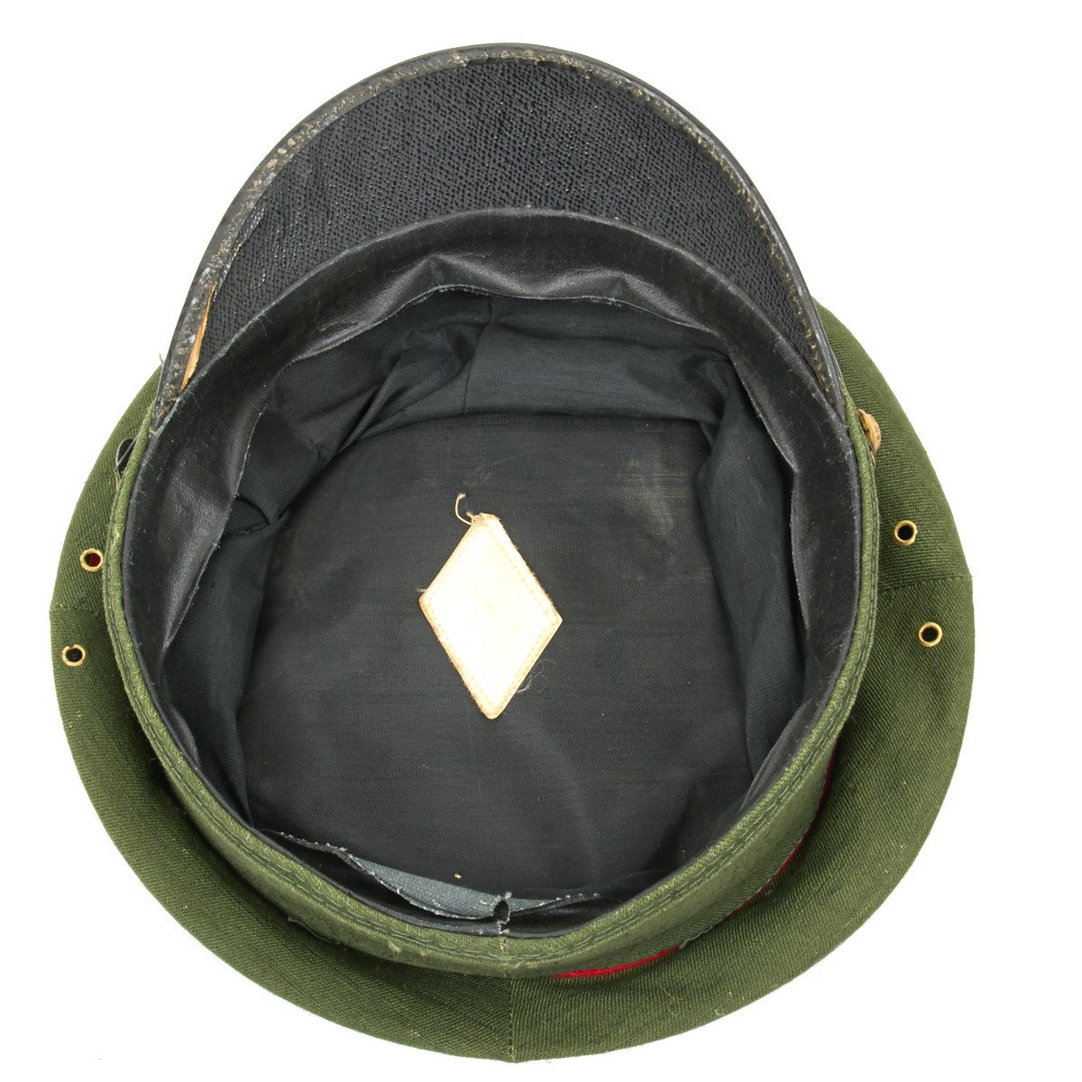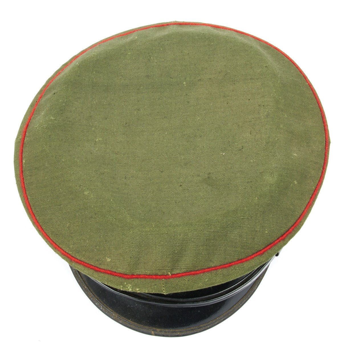 NCO visor cap without hat badge, wool construction, leather brim and chin strap, red piping, silk lined, fair condition.