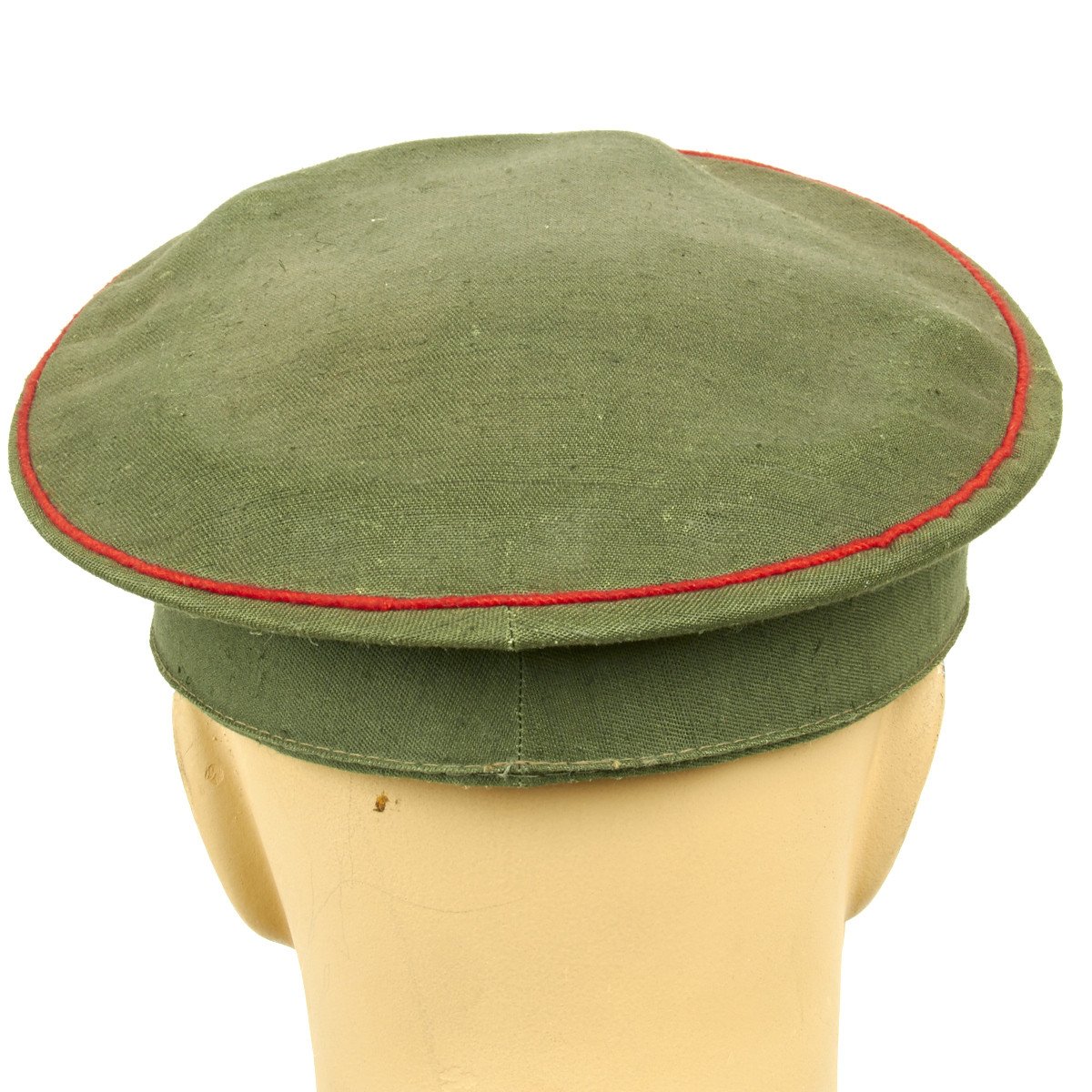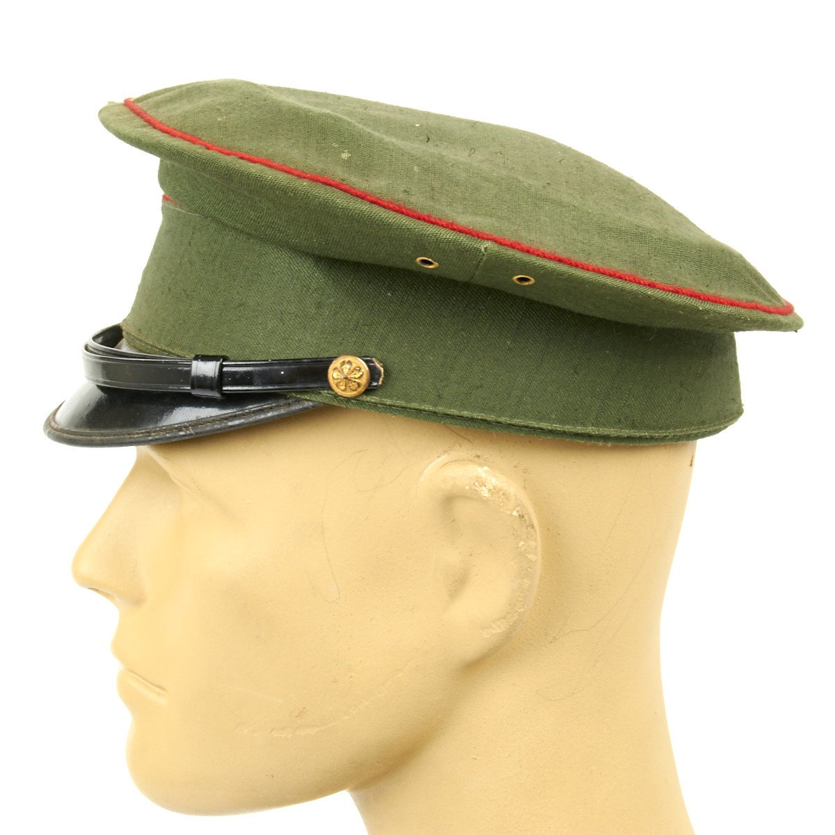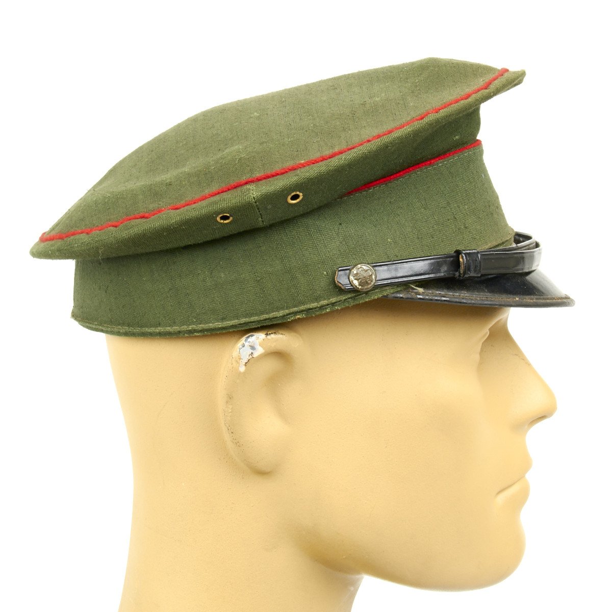 NCO visor cap without hat badge, wool construction, leather brim and chin strap, red piping, silk lined, fair condition.