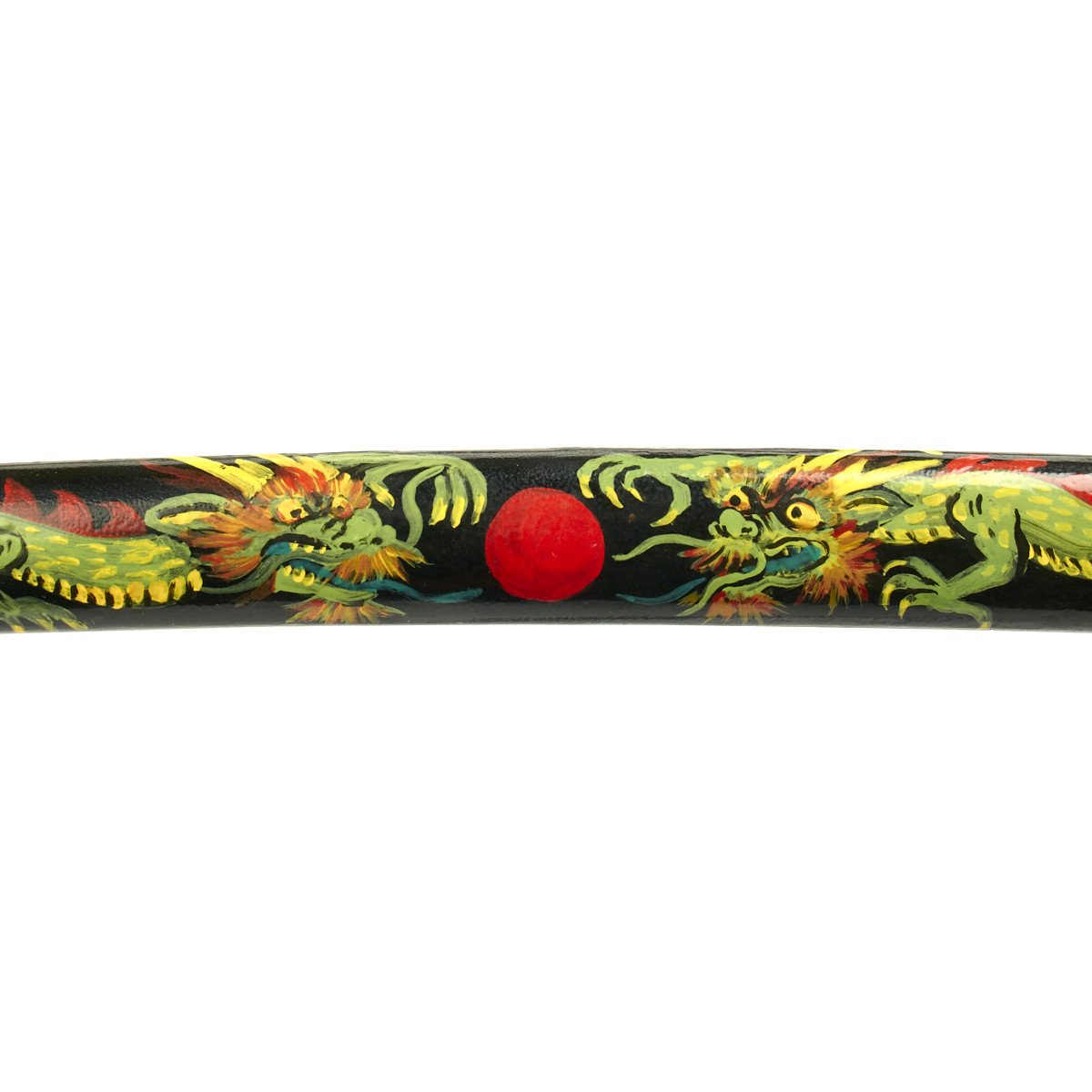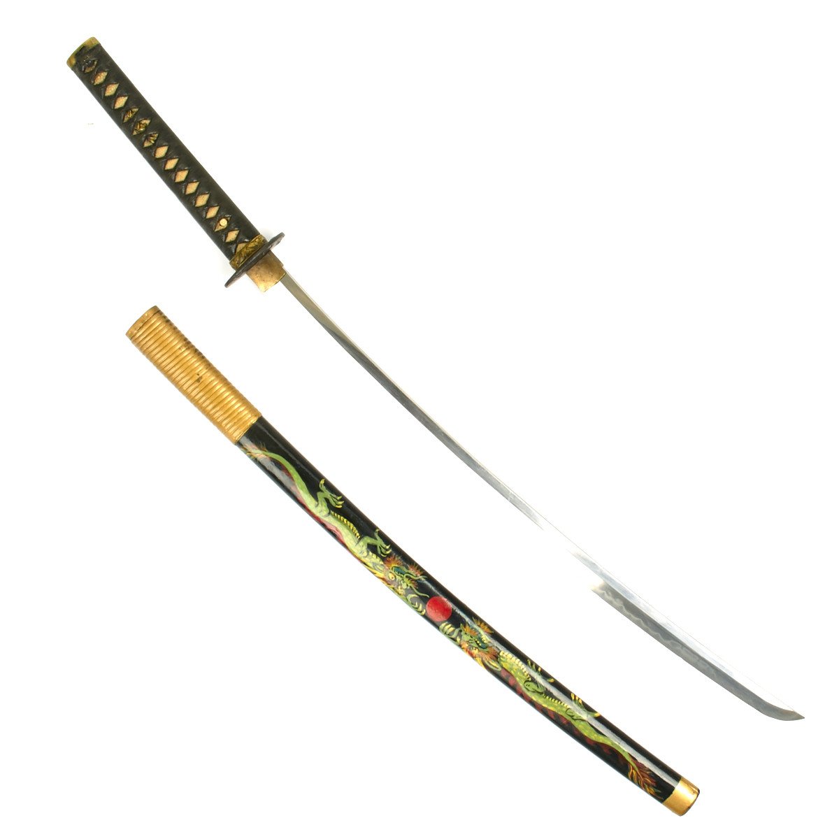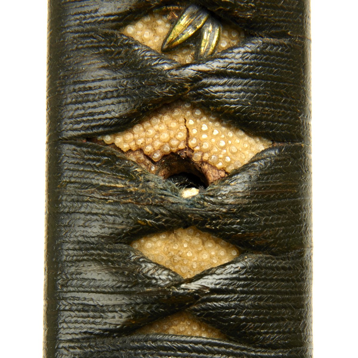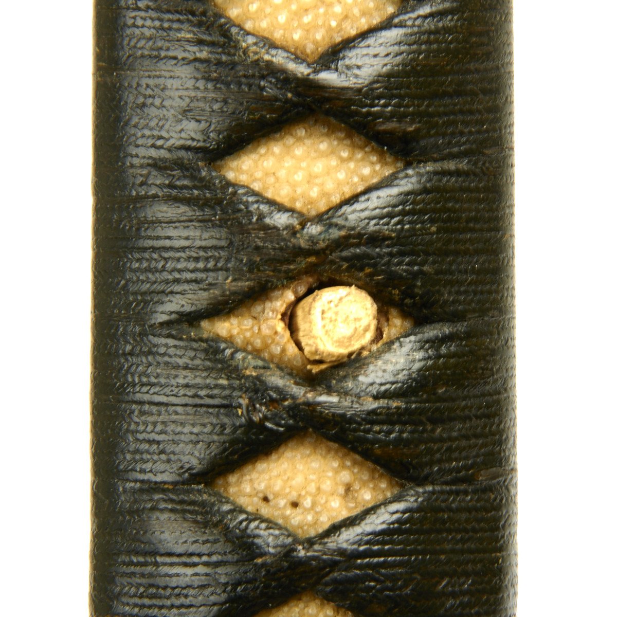 Round tsuba (cross guard) with menuki (grip decoration), and a nice Kashira (End Cap), one bamboo securing peg still present. Excellent faux stingray Sa-Me (grip) with complete Ito (cloth binding). The Scabbard (saya) is wood, hand painted with traditional Japanese dragons and in very nice condition with original period paint.