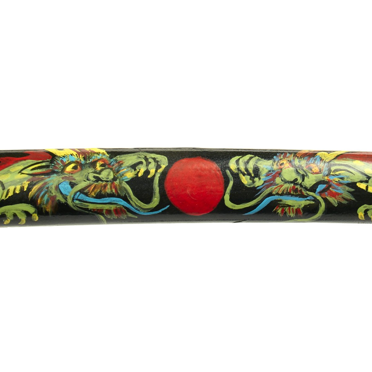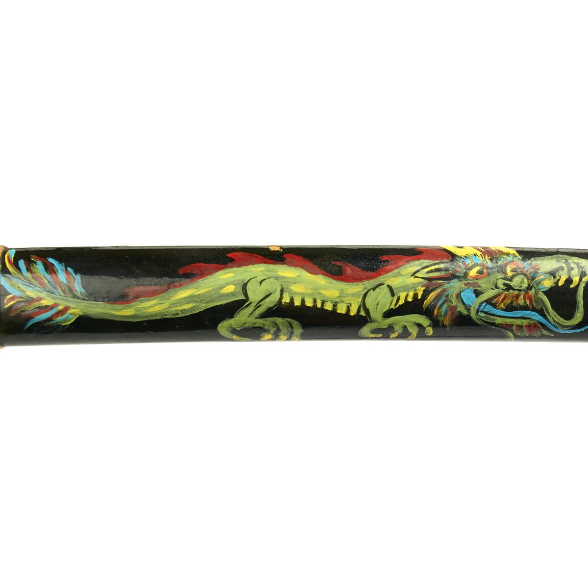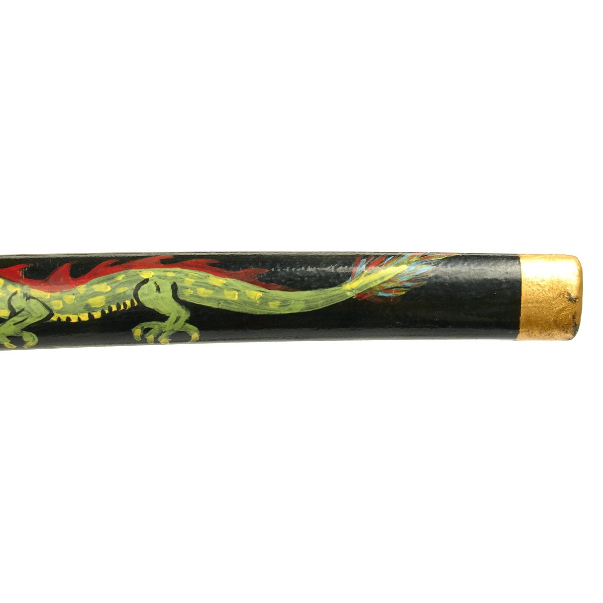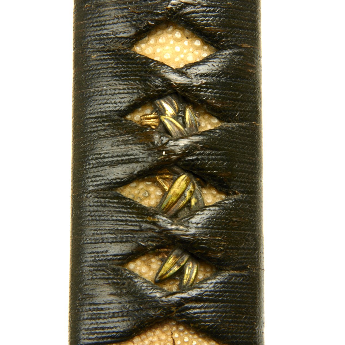 Round tsuba (cross guard) with menuki (grip decoration), and a nice Kashira (End Cap), one bamboo securing peg still present. Excellent faux stingray Sa-Me (grip) with complete Ito (cloth binding). The Scabbard (saya) is wood, hand painted with traditional Japanese dragons and in very nice condition with original period paint.