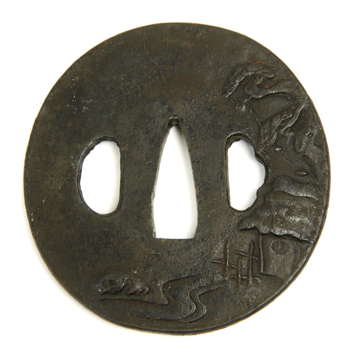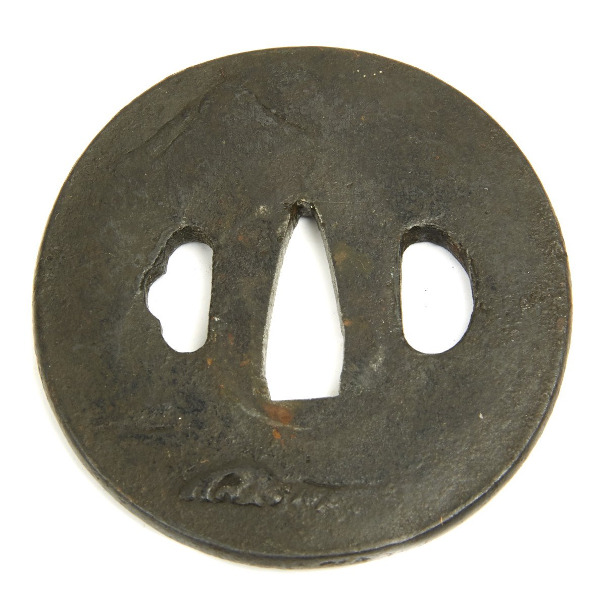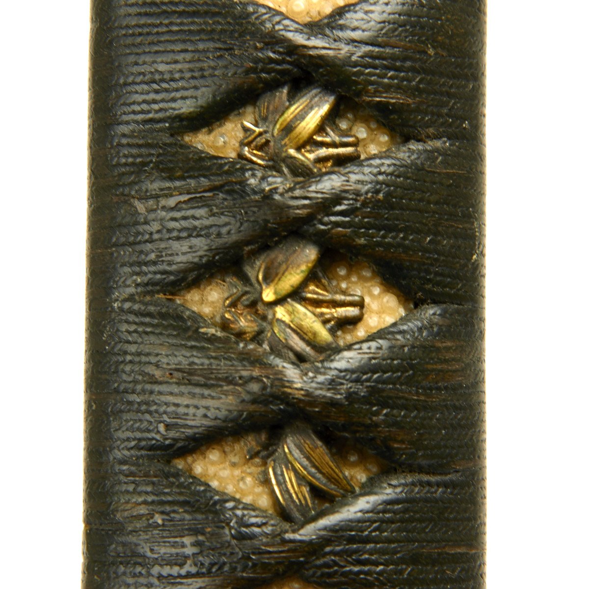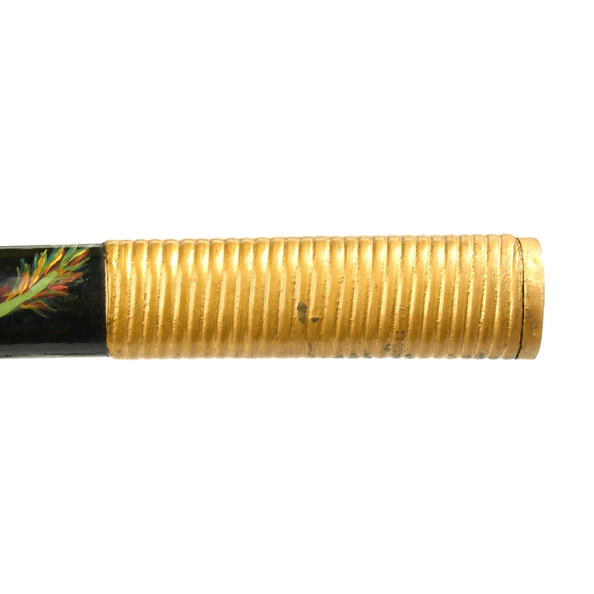 Round tsuba (cross guard) with menuki (grip decoration), and a nice Kashira (End Cap), one bamboo securing peg still present. Excellent faux stingray Sa-Me (grip) with complete Ito (cloth binding). The Scabbard (saya) is wood, hand painted with traditional Japanese dragons and in very nice condition with original period paint.