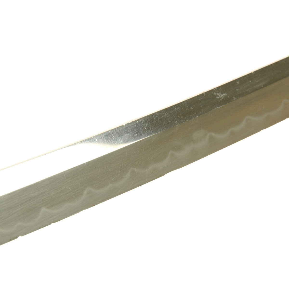 Offered in very good condition with an incredible temper line, it is still razor sharp and nearly nick free. Blade length is approximately 26" and overall length 36". Handmade blade, with one mounting hole in the Iriyamagata (asymmetrical pointed) tang.