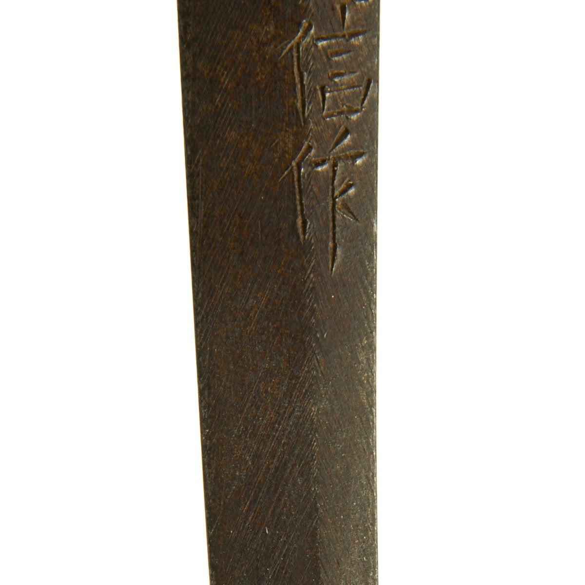 The tang of the blade is signed by the maker: 濃州 住 亮信 作 - NOSHU JU SUKENOBU SAKU. This roughly translates to "Sukenobu made this in Mino Province (noshu)". This smith is listed in the Seki Tanrensho Booklet printed in 1939. Their real name was 土岐 雄一 - Toki Yuuichi. There is also a 昭 (SHOWA) arsenal stamp on the tang.