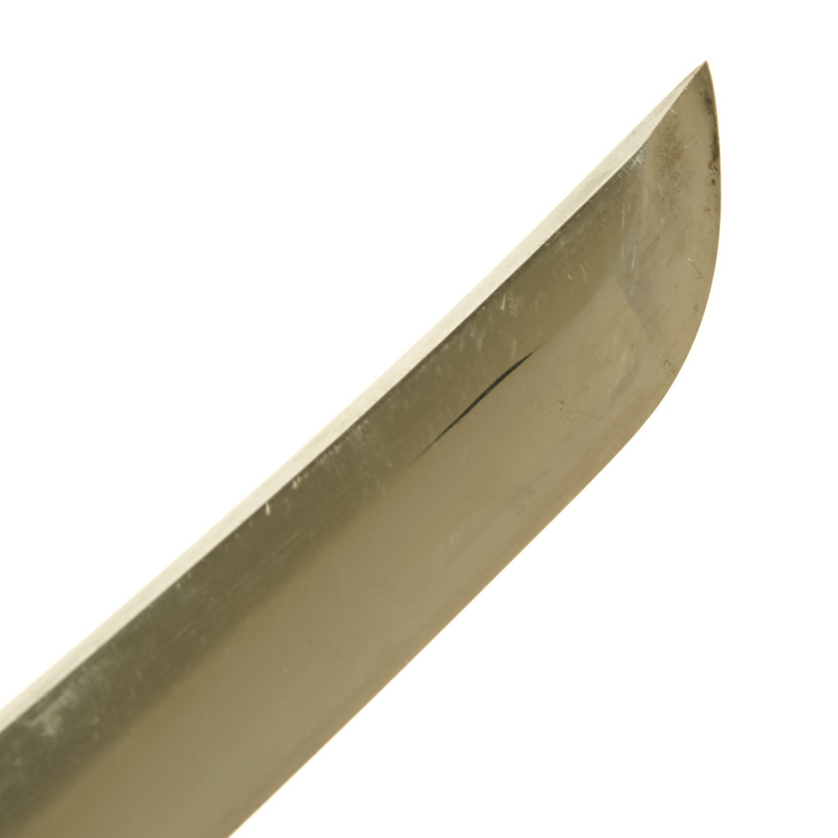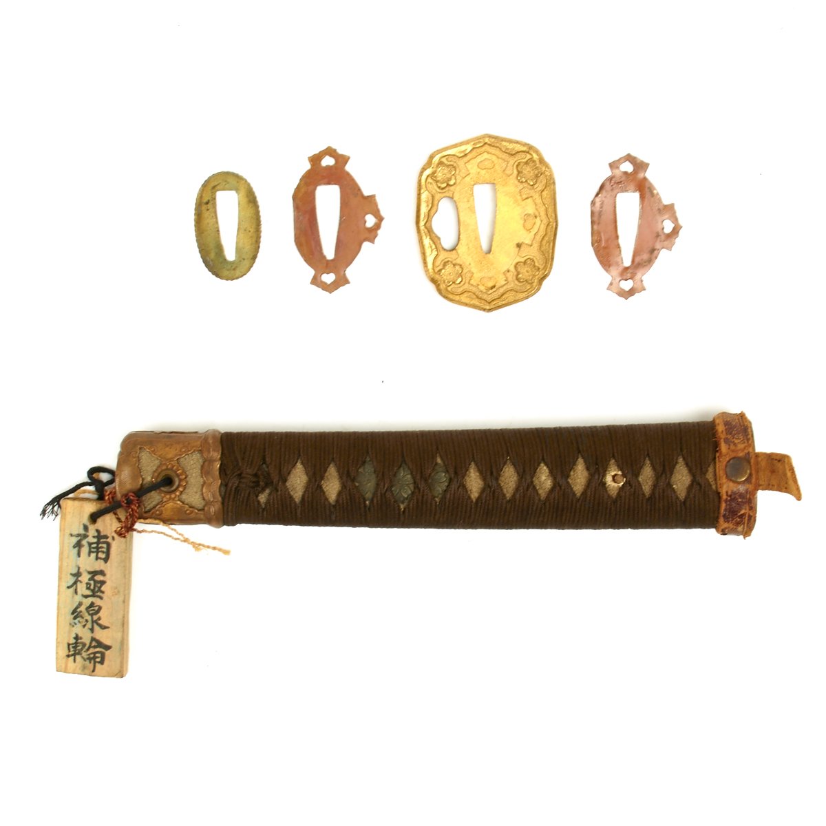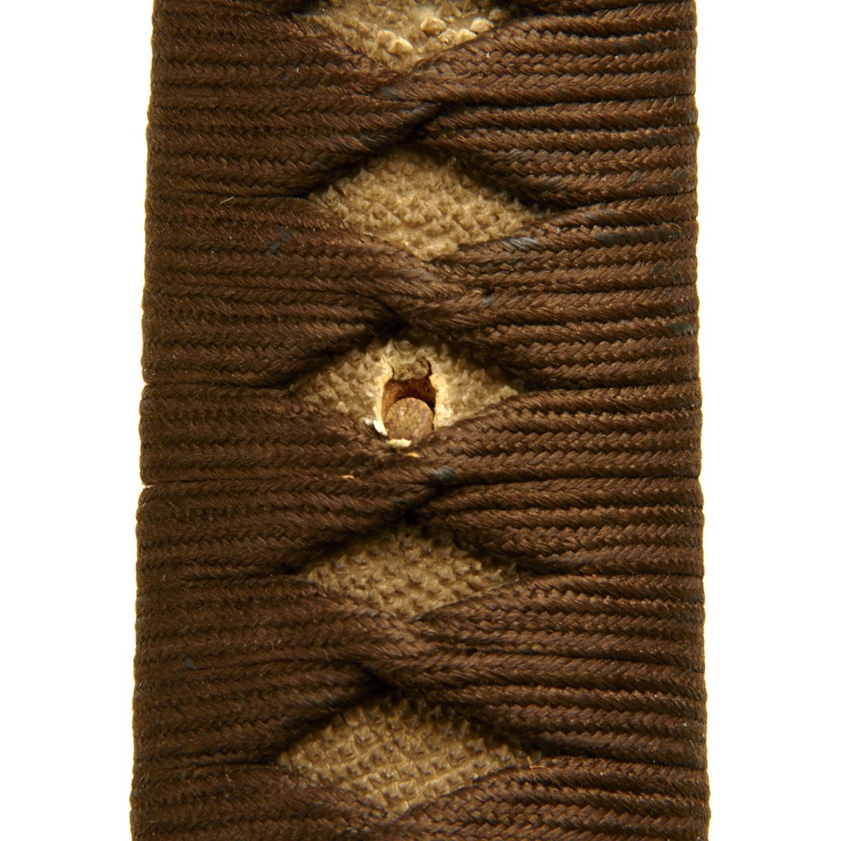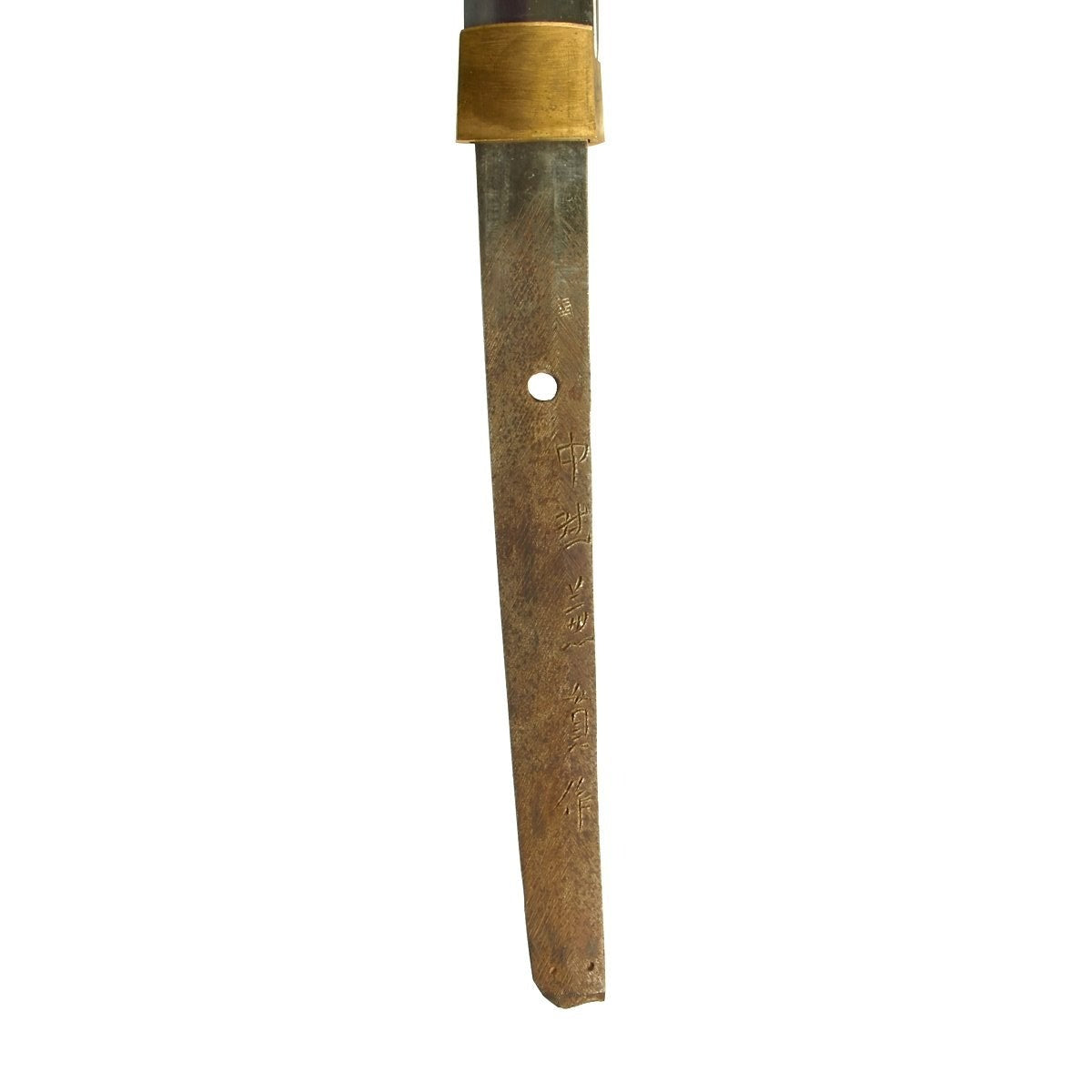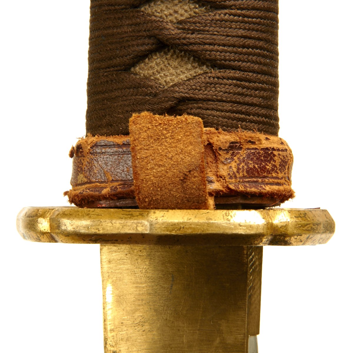 Round tsuba (cross guard) with menuki (grip decoration), and a nice Kashira (End Cap), one bamboo securing peg still present. Excellent sharkskin Sa-Me (grip) with complete Ito (cloth binding). The Scabbard (saya) is wood, with Japanese WWII leather cover. Of particular note is a wood "surrender tag" which identifies the original owner was used by the Japanese when they turned in "fighting implements" including swords to the U.S. after the war. There is also a leather strap, sadly broken, that originally would have secured the hilt to the scabbard.