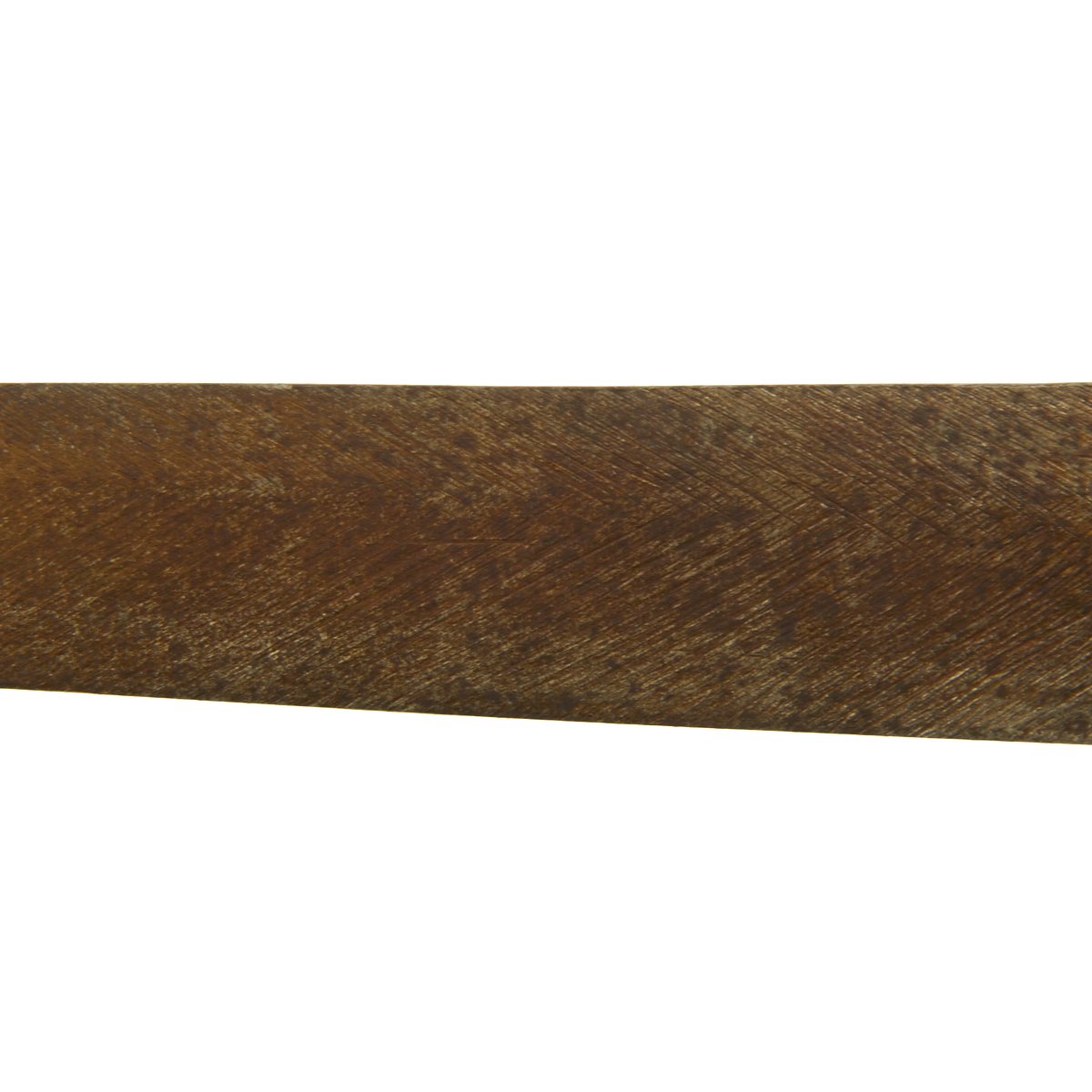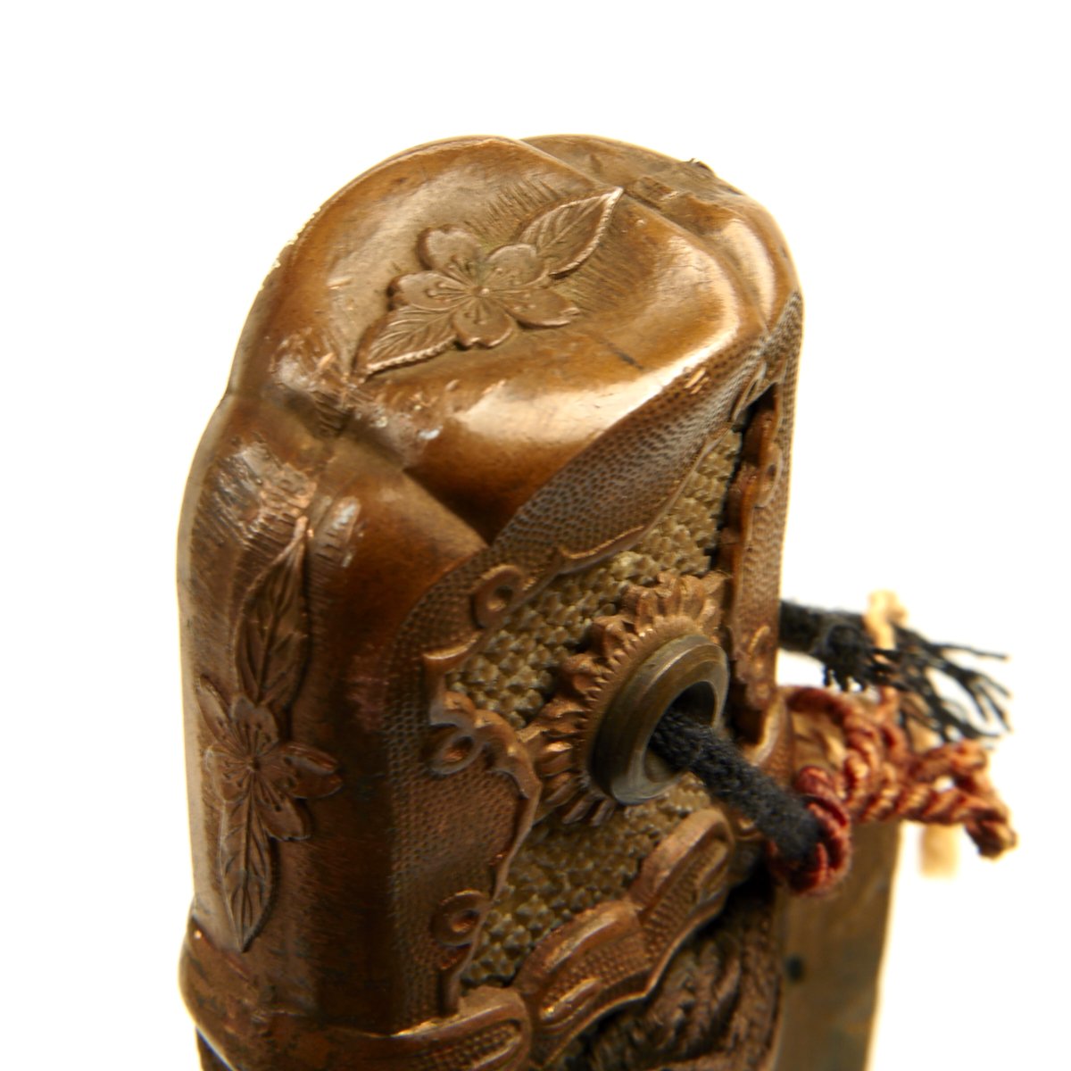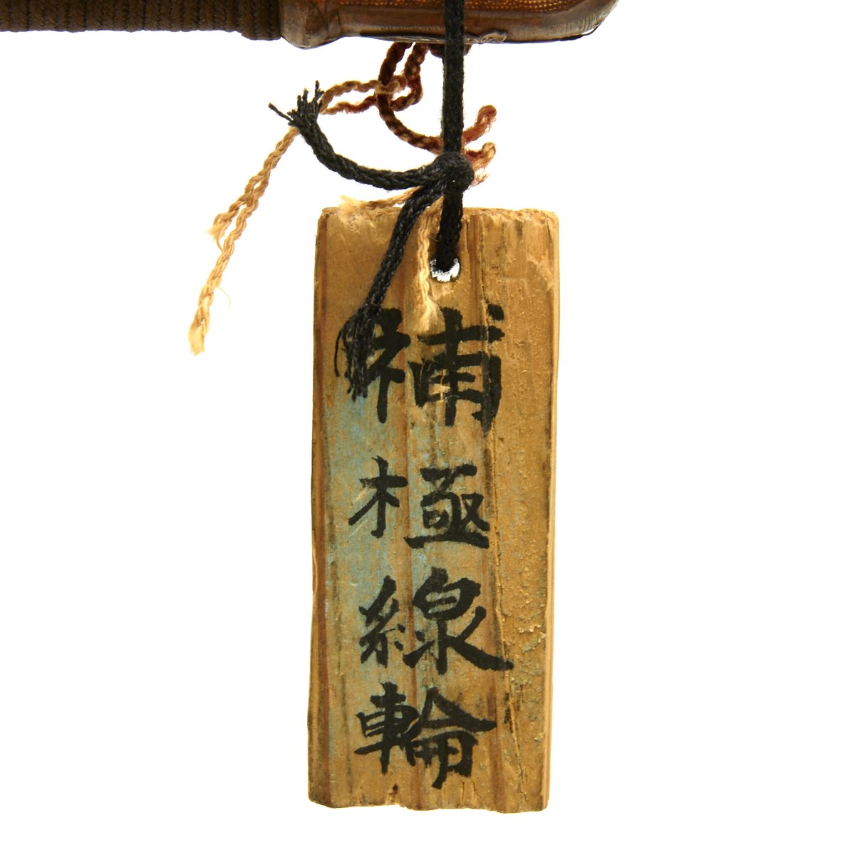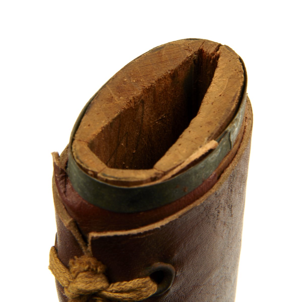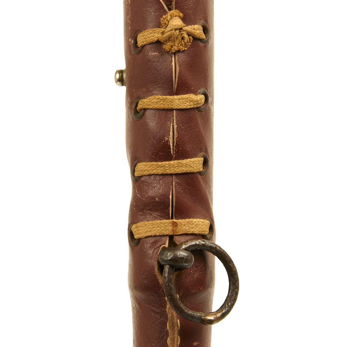 Round tsuba (cross guard) with menuki (grip decoration), and a nice Kashira (End Cap), one bamboo securing peg still present. Excellent sharkskin Sa-Me (grip) with complete Ito (cloth binding). The Scabbard (saya) is wood, with Japanese WWII leather cover. Of particular note is a wood "surrender tag" which identifies the original owner was used by the Japanese when they turned in "fighting implements" including swords to the U.S. after the war. There is also a leather strap, sadly broken, that originally would have secured the hilt to the scabbard.