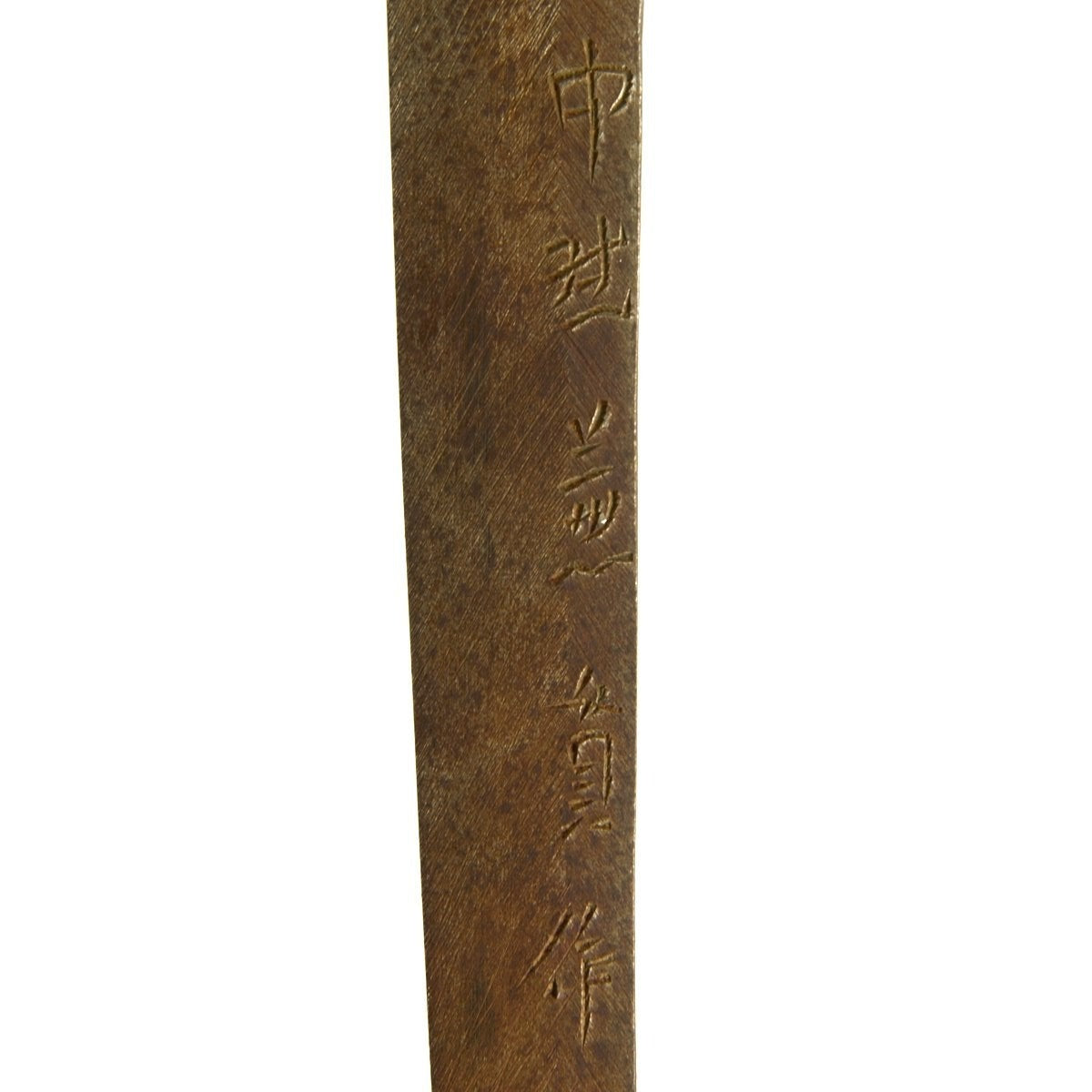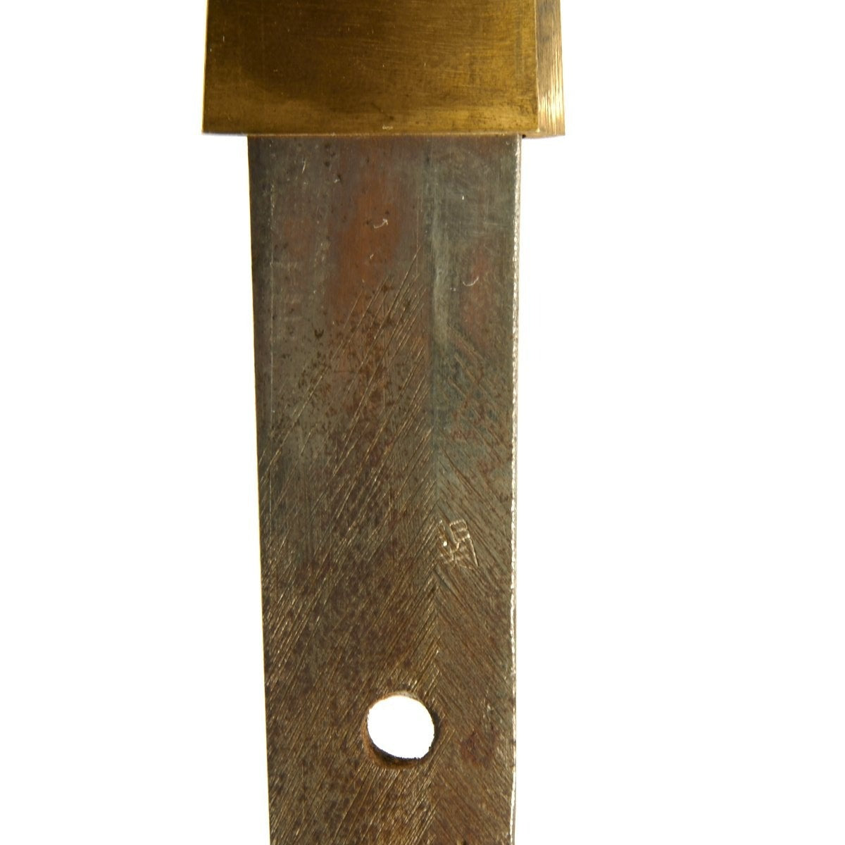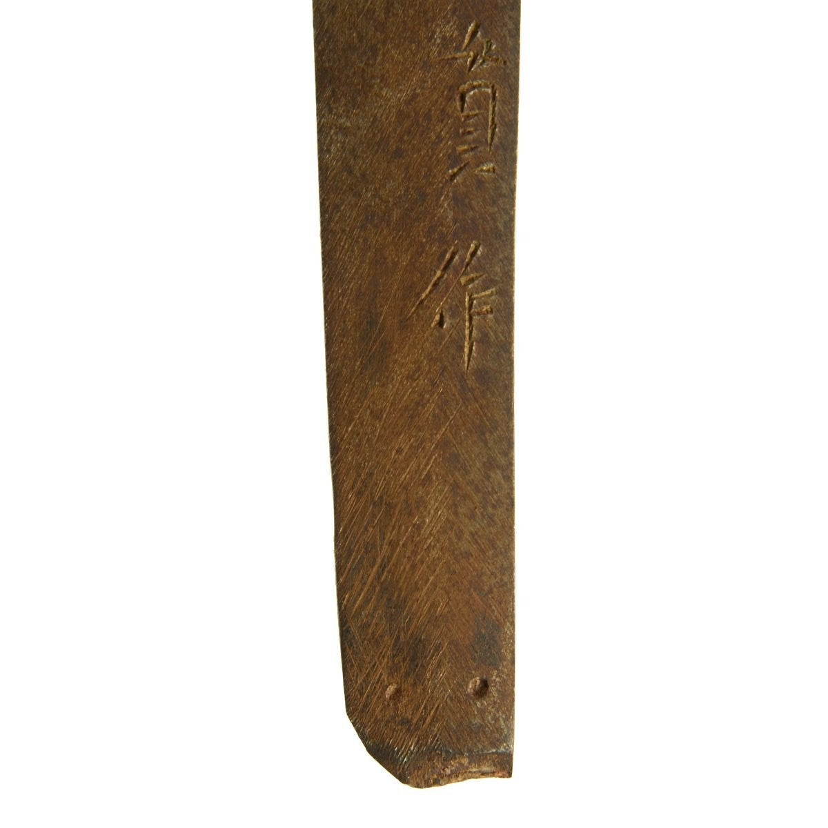 One side of the tang bears the makers name: 中 野 兼 貫 作, which is read NAKANO KANETSURA SAKU, or "Kanetsura Nakano Made this". Kanetsura is listed in the Seki Tanrensho Booklet printed in 1939. Their real name was 中野 栄三 - Nakano Eizou. It was common for smiths to use part of their real name in their "swordsmith" name. There is also a 関 SEKI arsenal stamp on the blade.