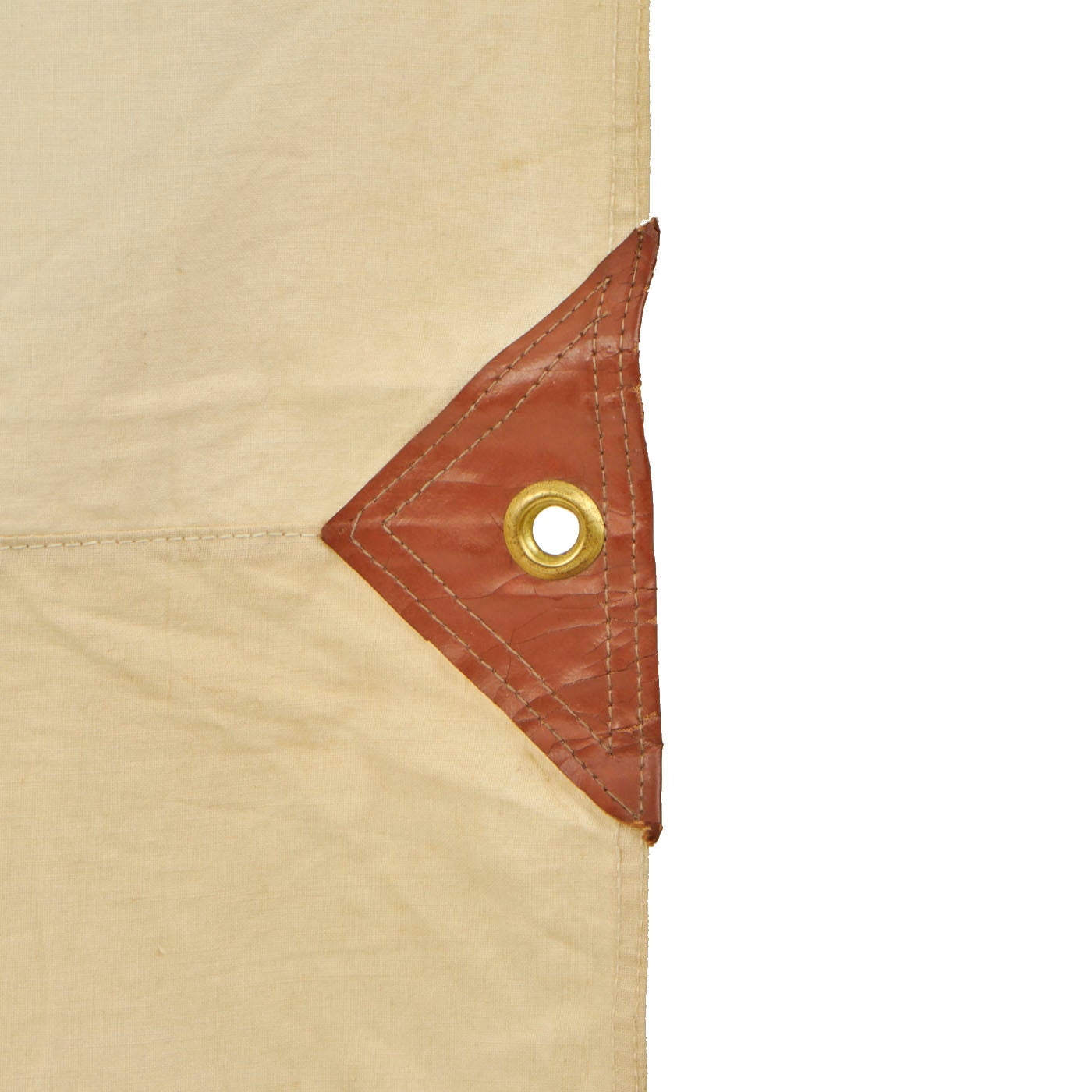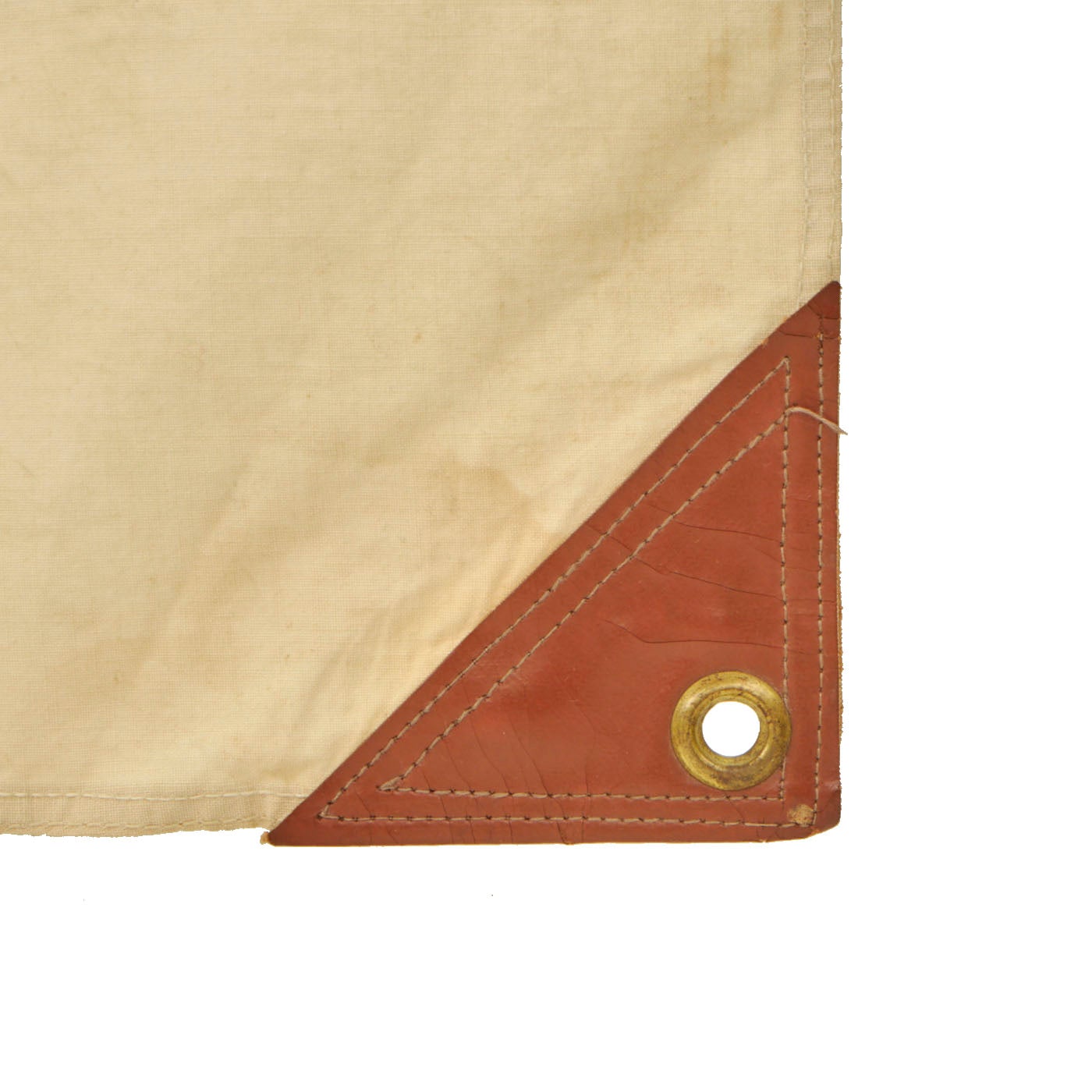 The flag is in really good condition without damage, but there is minor staining and aging present to the white cotton. The flag is a two piece design with the red center stitched into the white. All three leather reinforcements are in great shape with original grommets.
