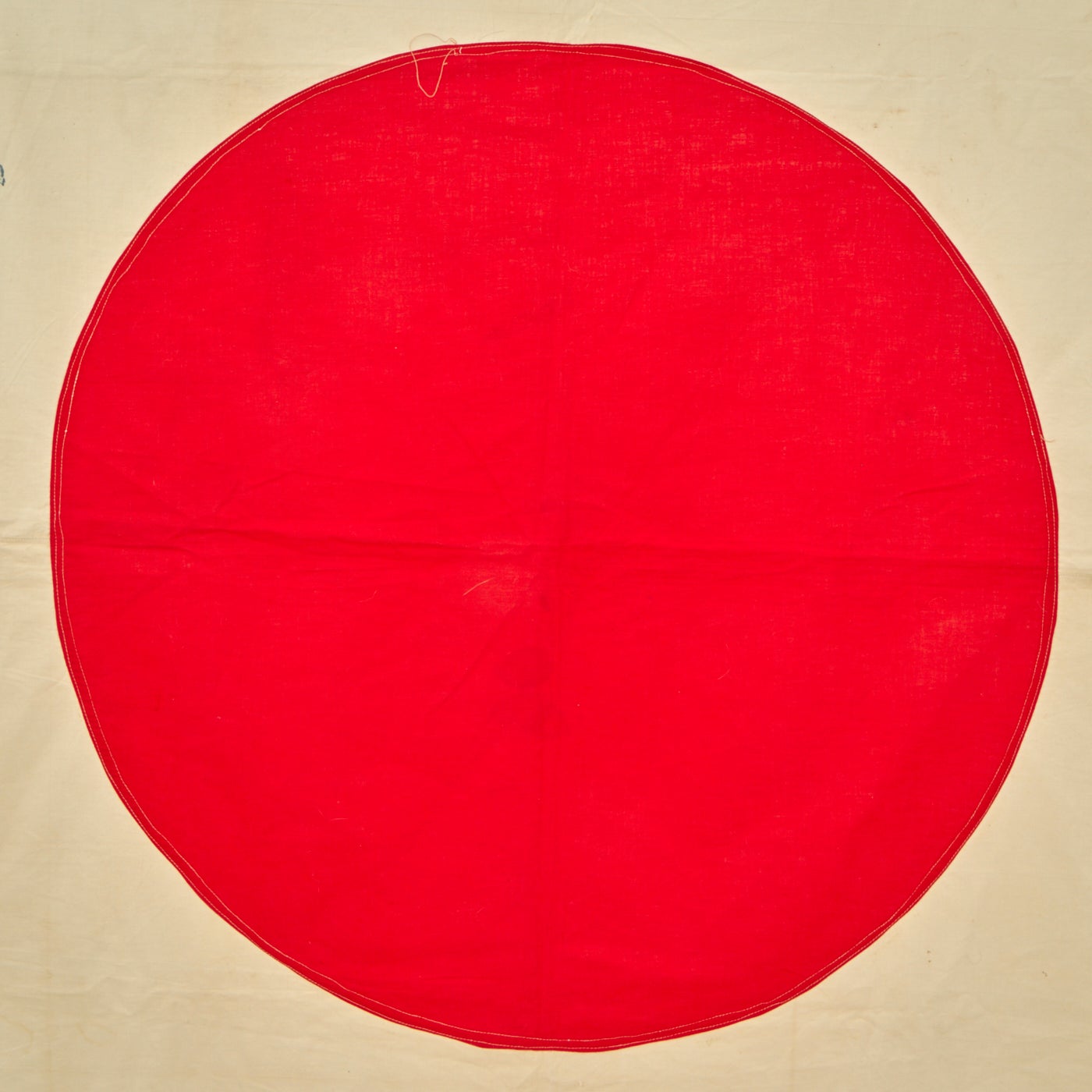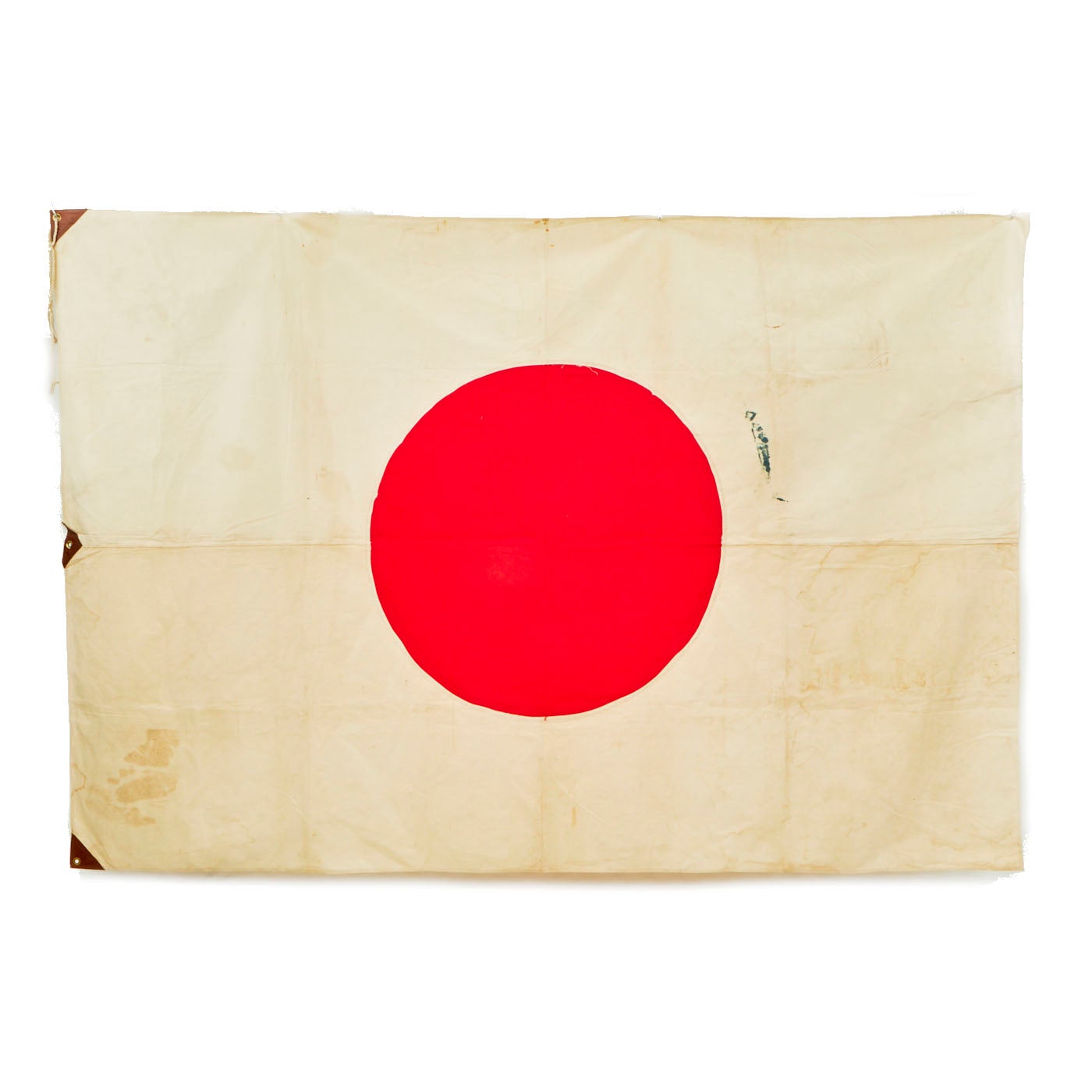Original Item: Only One Available. This is one of the largest flags we have ever received here at IMA! This flag measures approximately 86” x 58” and is complete with not only leather reinforced corners but there’s a third one in the middle, all still retaining their original brass grommets. We believe that this flag is possibly a Naval used flag due to paint splatter that is very similar in color to the paint used on ships by the Maizuru Naval Arsenal.