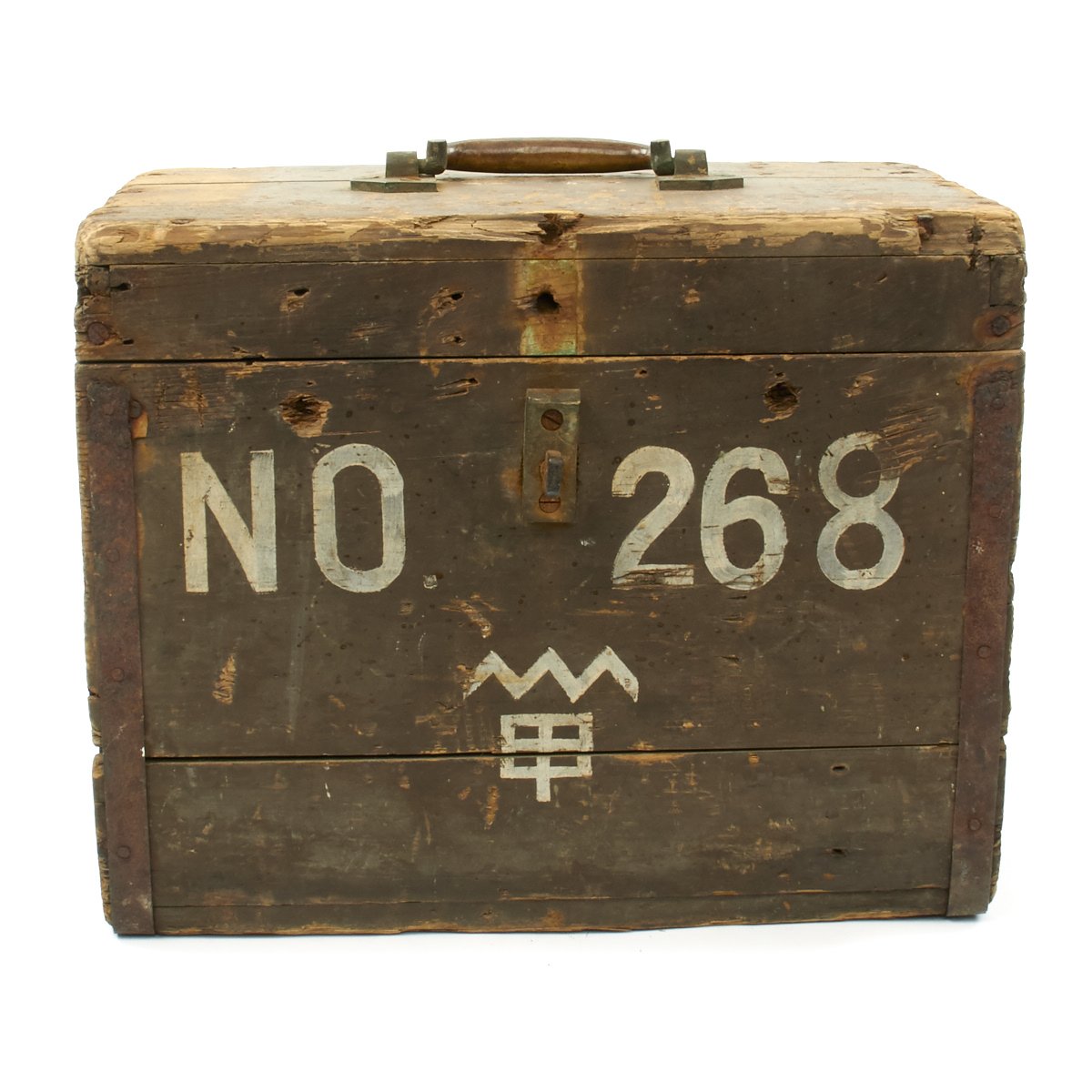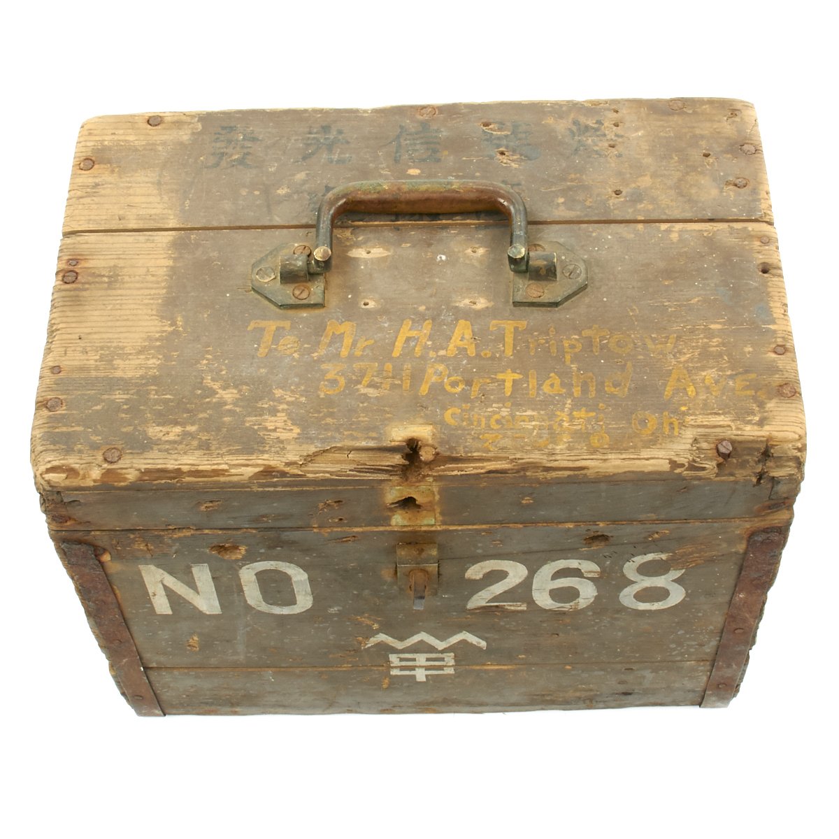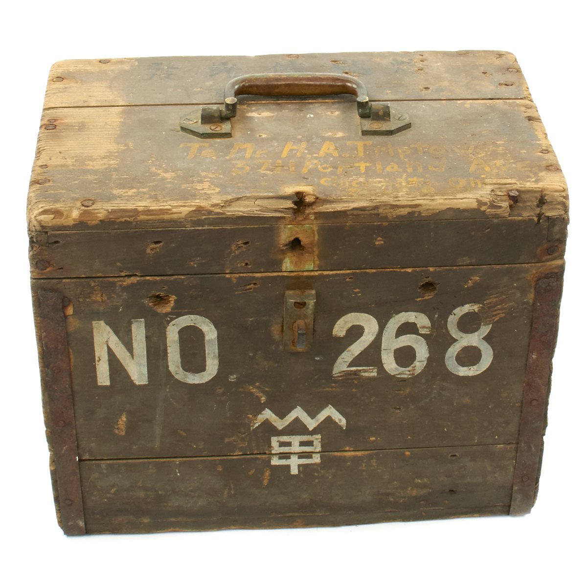 The wooden transit chest measures 13 3/4 inches wide, 11 inches tall and 8 3/4 inches deep. The top and outside bear Japanese markings, as well as the address of the soldier it was sent back to: