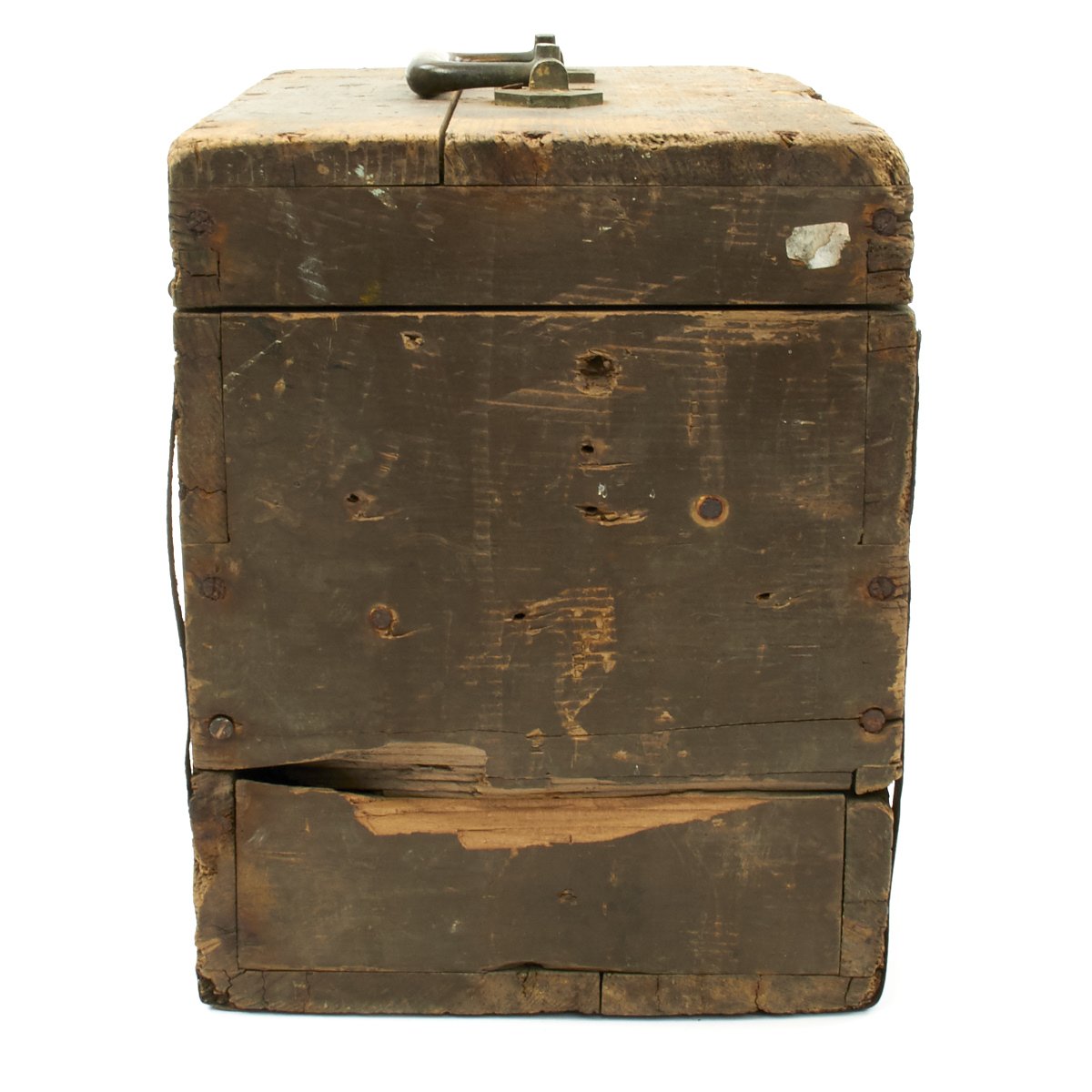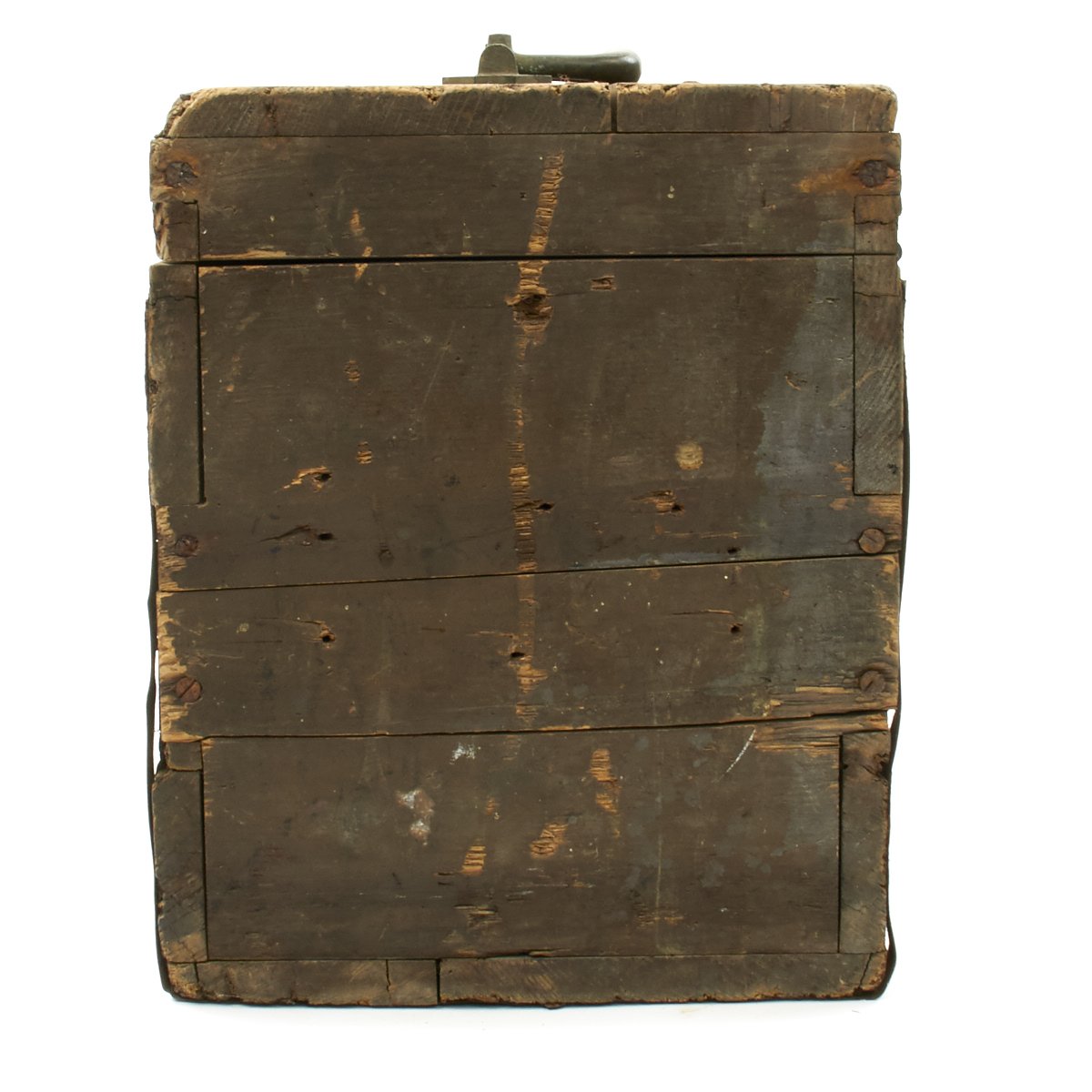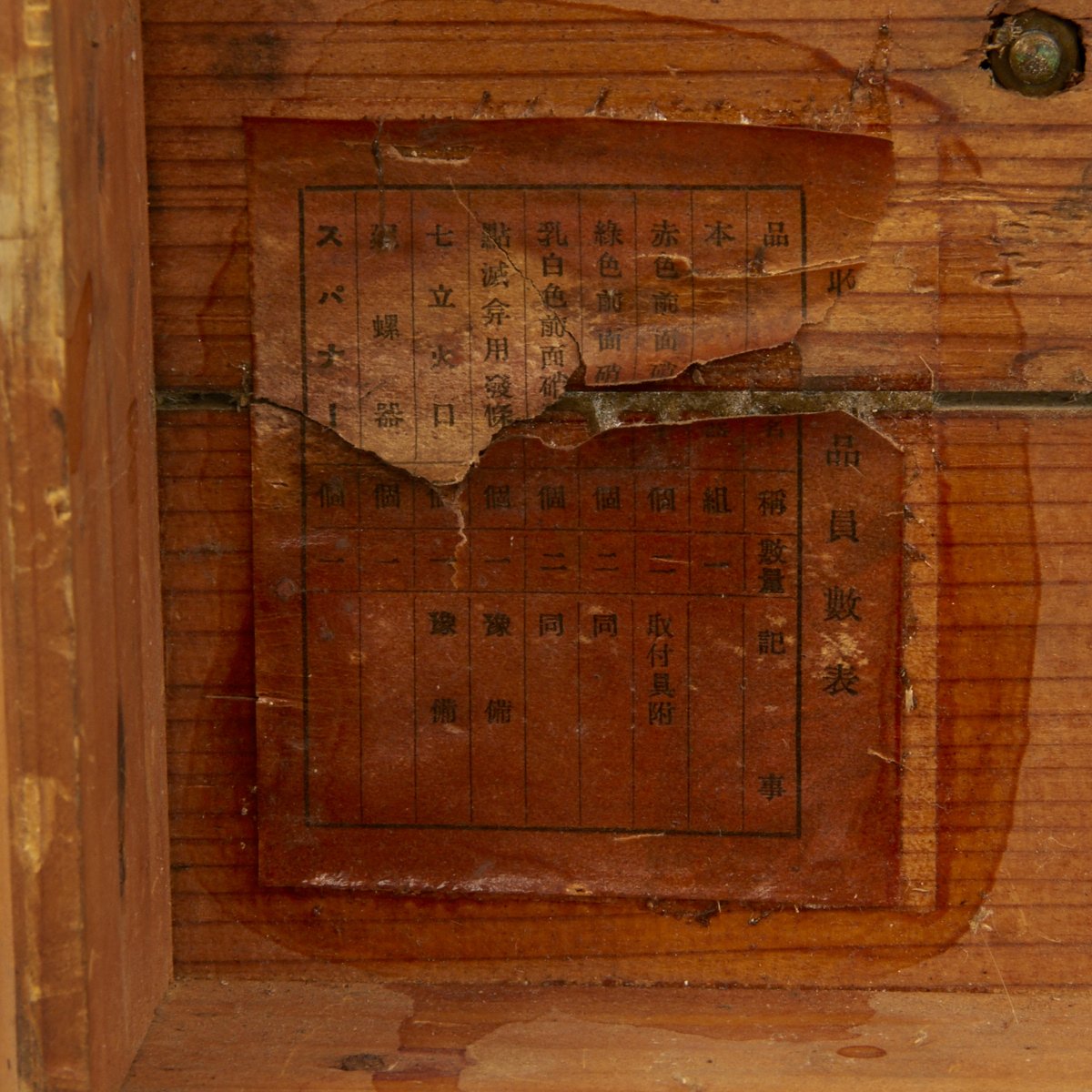 The wooden transit chest measures 13 3/4 inches wide, 11 inches tall and 8 3/4 inches deep. The top and outside bear Japanese markings, as well as the address of the soldier it was sent back to: