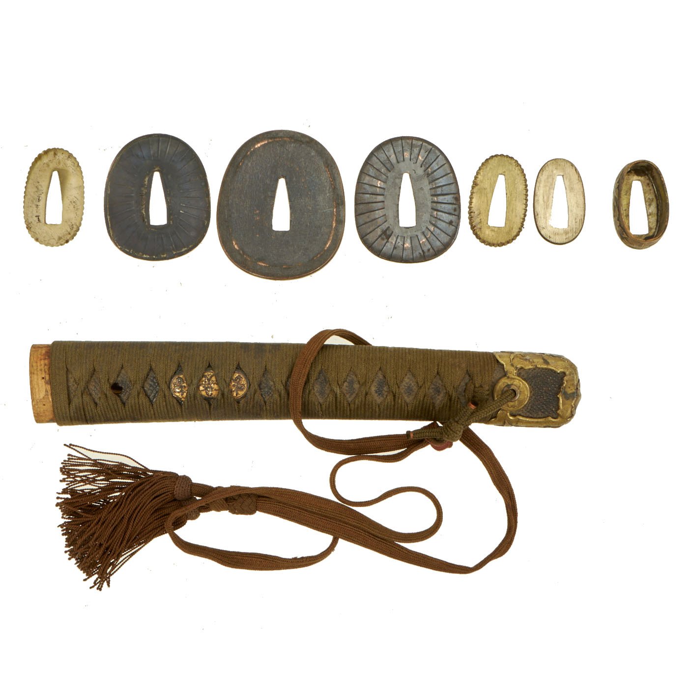 The Wood scabbard has a standard black lacquer finish, and has all brass fittings, with much of the original gilding. The fittings are just a bit loose due to age, but they are still held in place party by the original glue. Condition is very good, with only a few small chips and dents. It does not have a koiguchi (scabbard mouth" fitting, but does not look like it was removed, so it may have never had one. The tsuba, tsuka, both O-Seppa and all 4 of the smaller Seppa (spacers) are stamped with western number 1 4 4. This matches the number 144 (faint) inside the scabbard itself. This indicates that this set of KOSHIRAE (fittings) were all made for this specific blade.