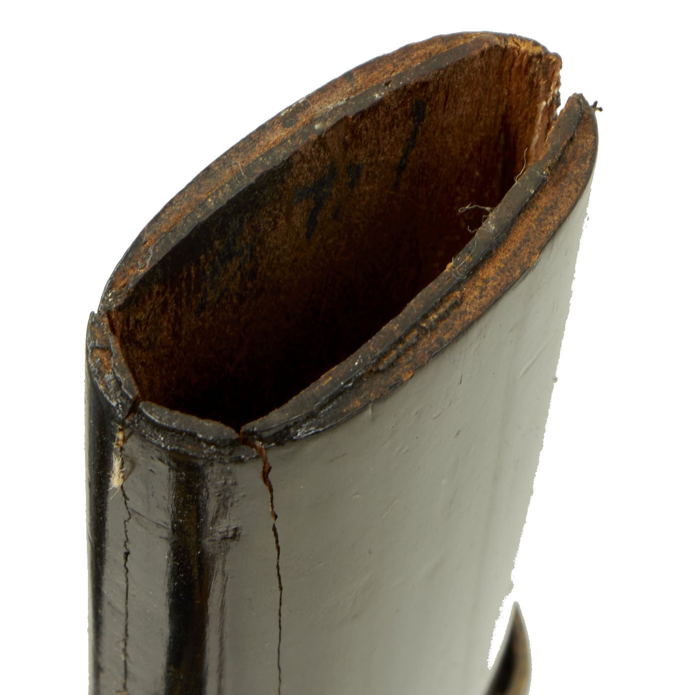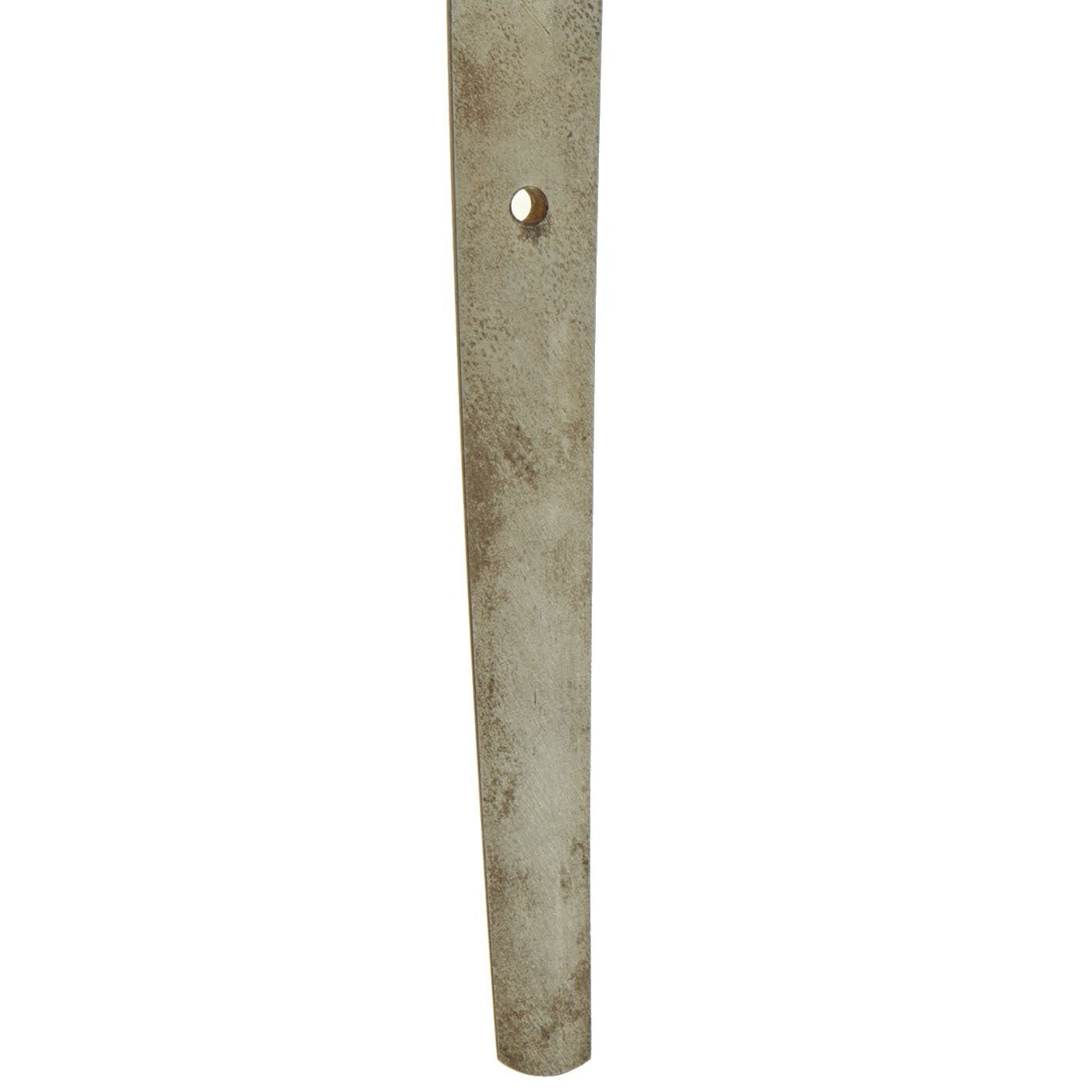 The blade is very good condition, showing only light wear, with a few small dents and dings on the edge. There is a small chip on the blade tip. There are areas of oxidation "tracks", when a bit of water or debris moves along the surface, leaving squiggly lines of oxidation. Most of these are on the left side of the blade, so it was probably resting on that side in the wooden scabbard. Blade length is 25 1/4 inches and overall length 36 1/4 inches. Unlike most Kai-Gunto swords we see, this example has a hand-made traditionally made blade, complete with a vibrant temper line (hamon). It features a Futsu 普通 (regular) shaped Nakago (Tang) with a Haagari (asymmetrical rounded) nakago-jiri (tang tip).
