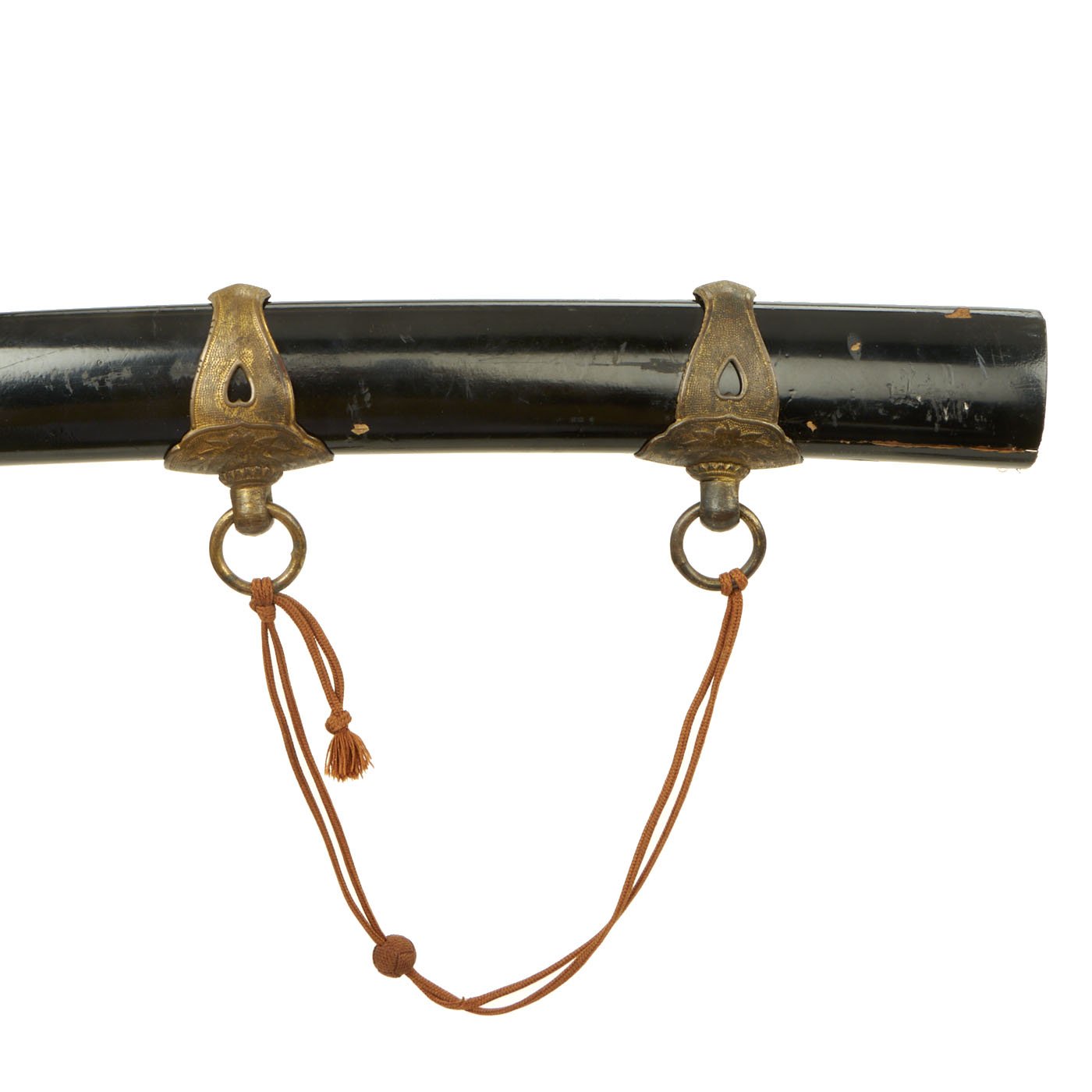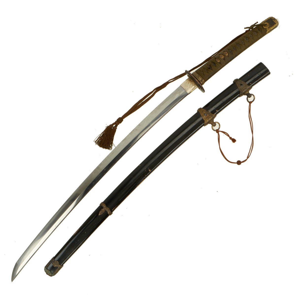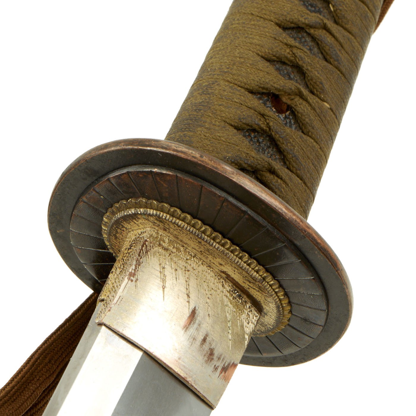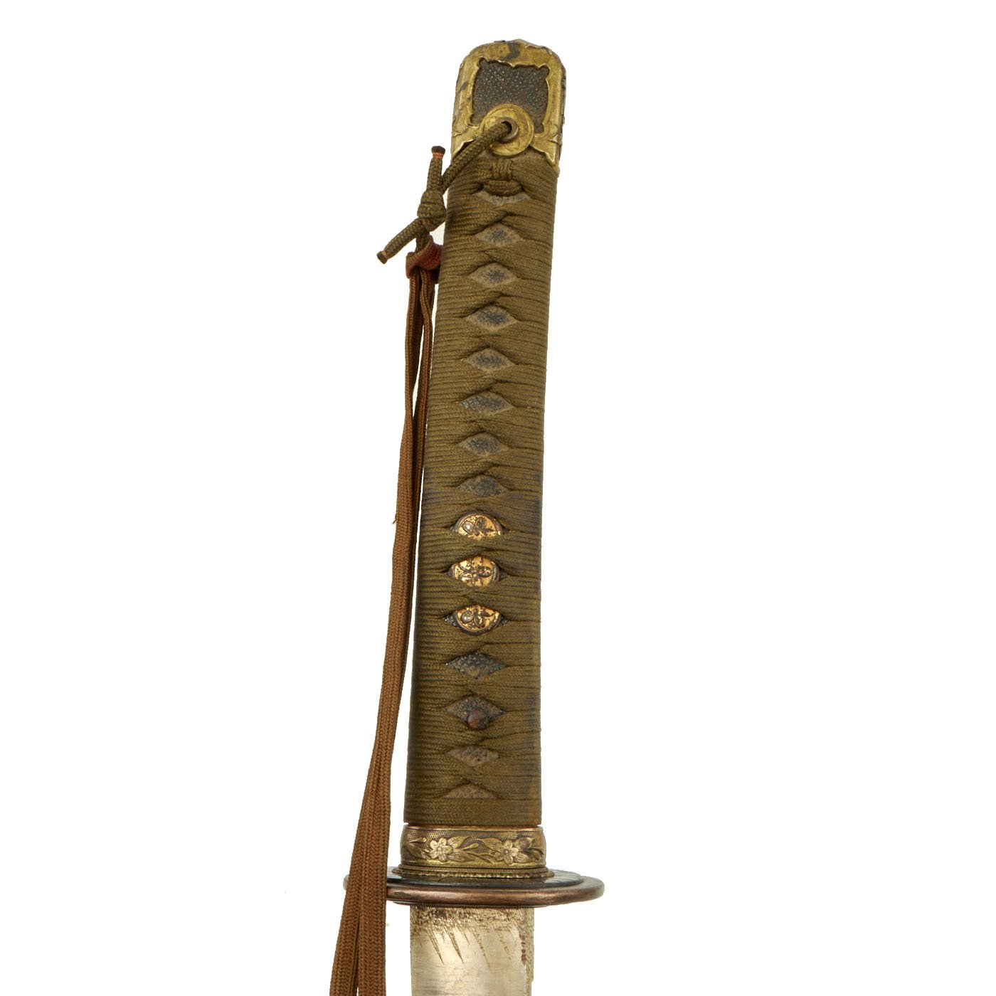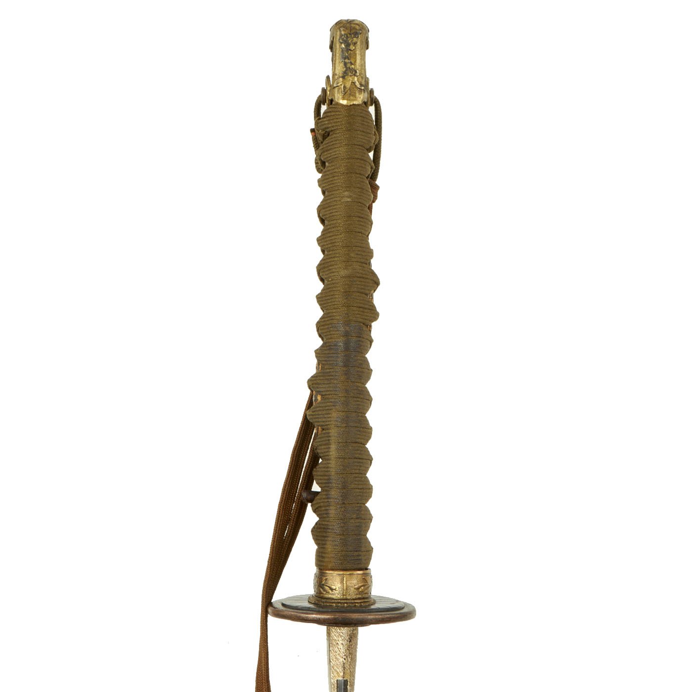 Original Item: Only One Available. Purchased recently from a private auction, this is a very nice wartime High Grade Japanese Naval officer Katana in the Pattern 1937 Kai-Gunto setting. A Kai-Guntō (海軍刀, naval sword) is a weapon and symbol of rank used by the Imperial Japanese Navy during the WWII Period. This is a very nice example, and features a traditionally made and maker signed blade, something we rarely see in Naval fittings. It still has the original brown tassel, which was used for all Naval officer grades.