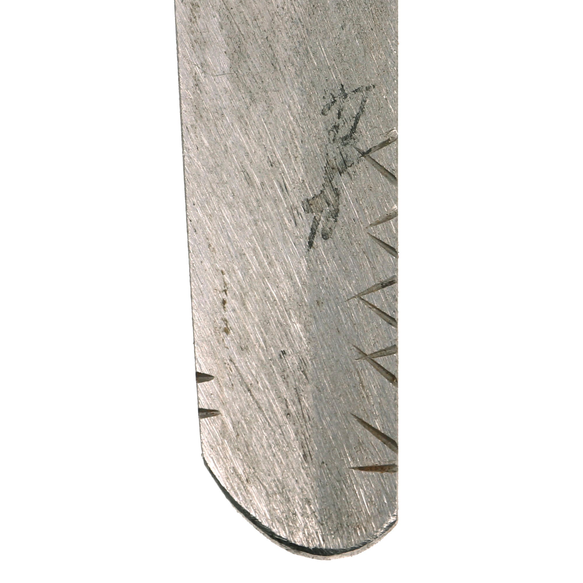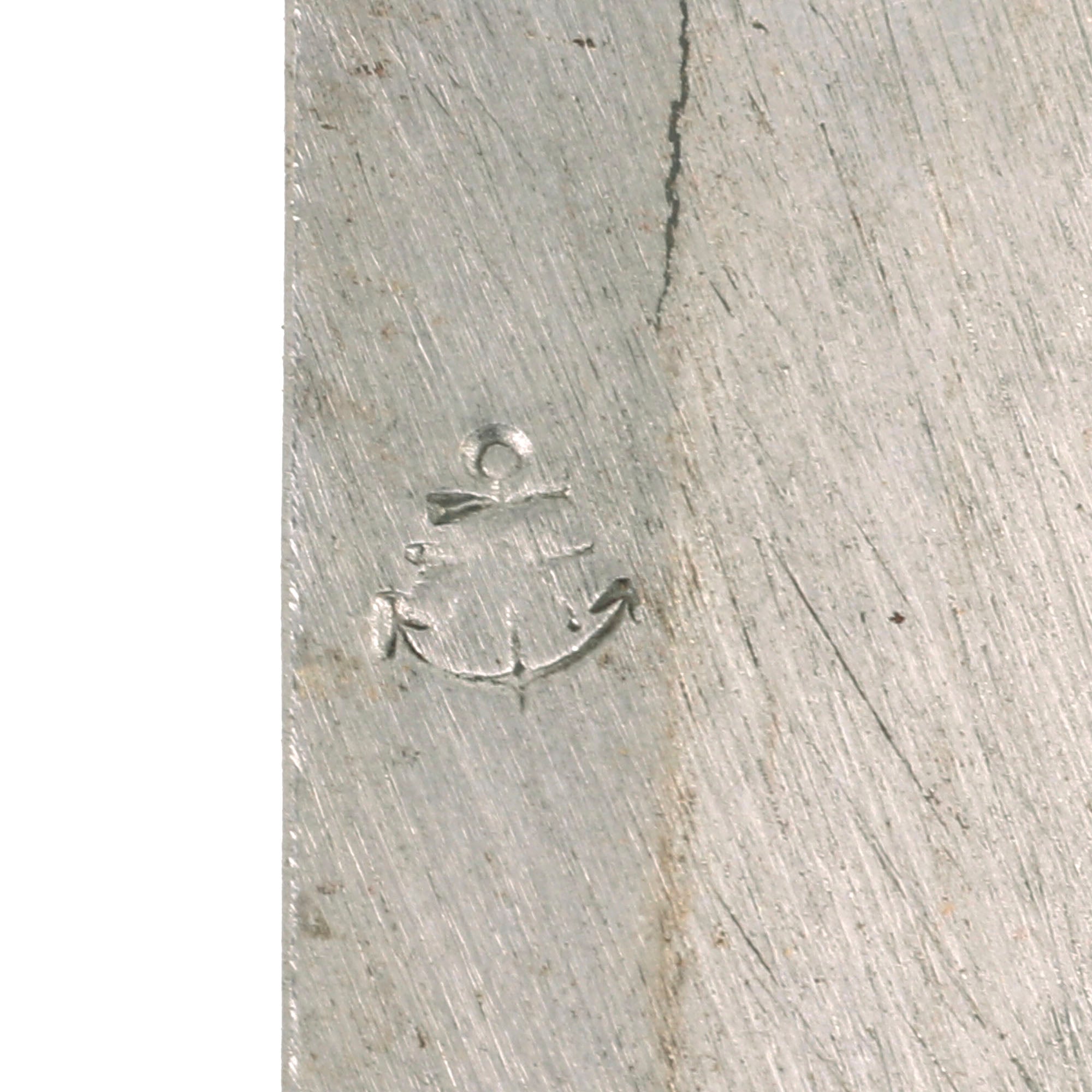The tang itself is marked a Naval ANCHOR stamp, however there is no circle around it, and the style is not the usual that we see. Research indicates that this is the anchor stamp specifically used by Tenshozan Tanrenjo. This was a small forge and shrine set up within the precincts of the Komyo-ji temple in Kamakura. It is on the Yokosuka peninsula and in the eastern part of Sagami Bay. The forge made anti-rust and stainless steel swords (kaigunto) for the Navy. The working group was quiet small so production was limited. Typically these blades have a stamp of a single ikari (anchor) on the nakago, as with these example. Fore more information please see JAPANESE NAVAL SWORDS WW 2 Swordsmiths & Workshops, compiled by Malcom E. Cox, pages 3, 81-87. Blades by this maker are definitely quite rare compared to the usual Naval Arsenal produced examples, and this may be the first example we have had.