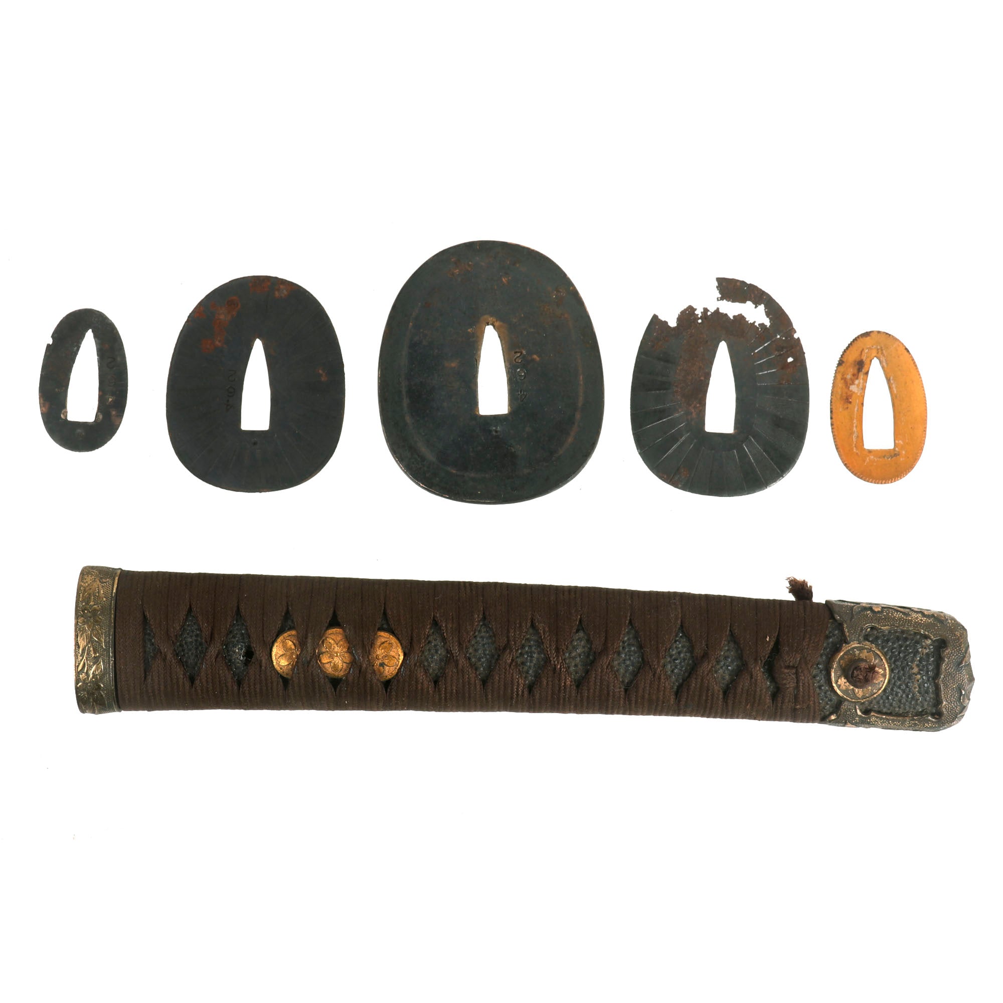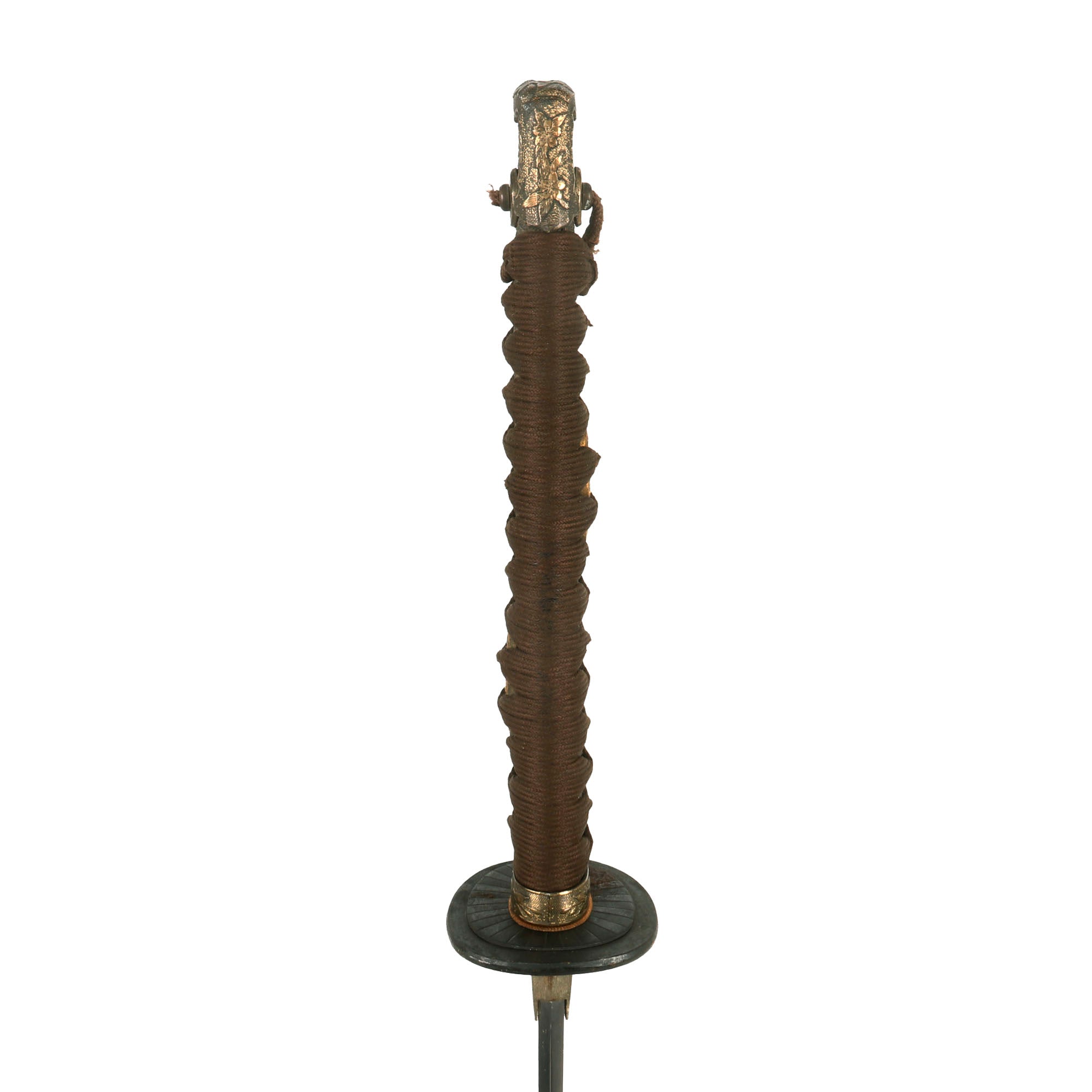 It has a heavy round brass tsuba (cross guard), with two plated steel Seppa (spacers) and two blacked copper plated steel O-Seppa (Large spacers) around the tsuba. These are large and highly stylized, correct for the Kai-Gunto pattern. The tsuka (handle) has two gold highlighted Cherry-Blossom menuki (grip decorations), and a nice brass Kabuto-Gane (End Cap) with a broken cord through the end. There is a single bamboo securing peg still present, which looks to be a replacement. The grip has an excellent black Stingray Skin grip (Sa-Me) under the complete brown colored Ito (cloth binding) with fine brass decorative collar (fuchi). The crossguard is a bit loose on the handle when the handle is installed, probably due to the degradation of the O-seppa.