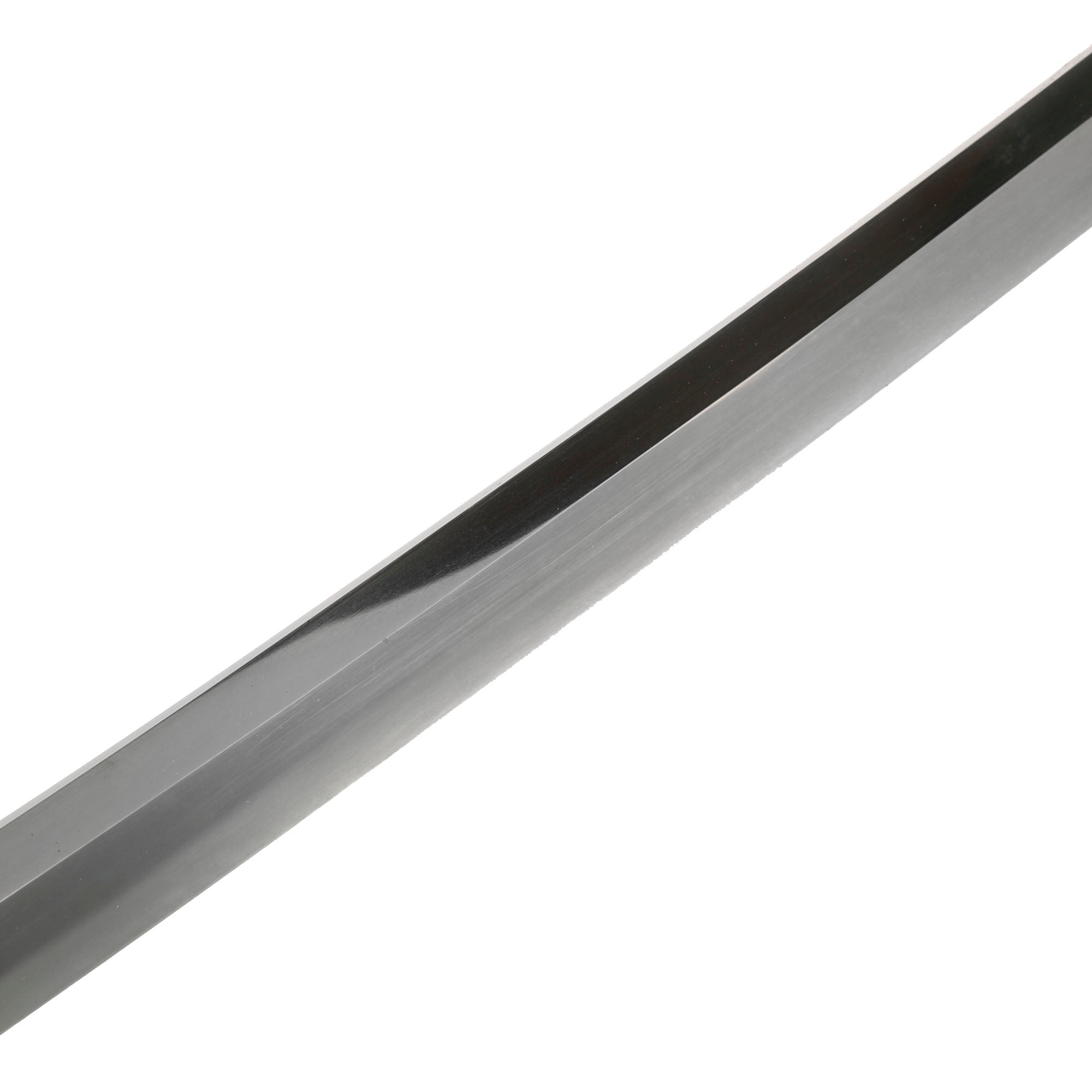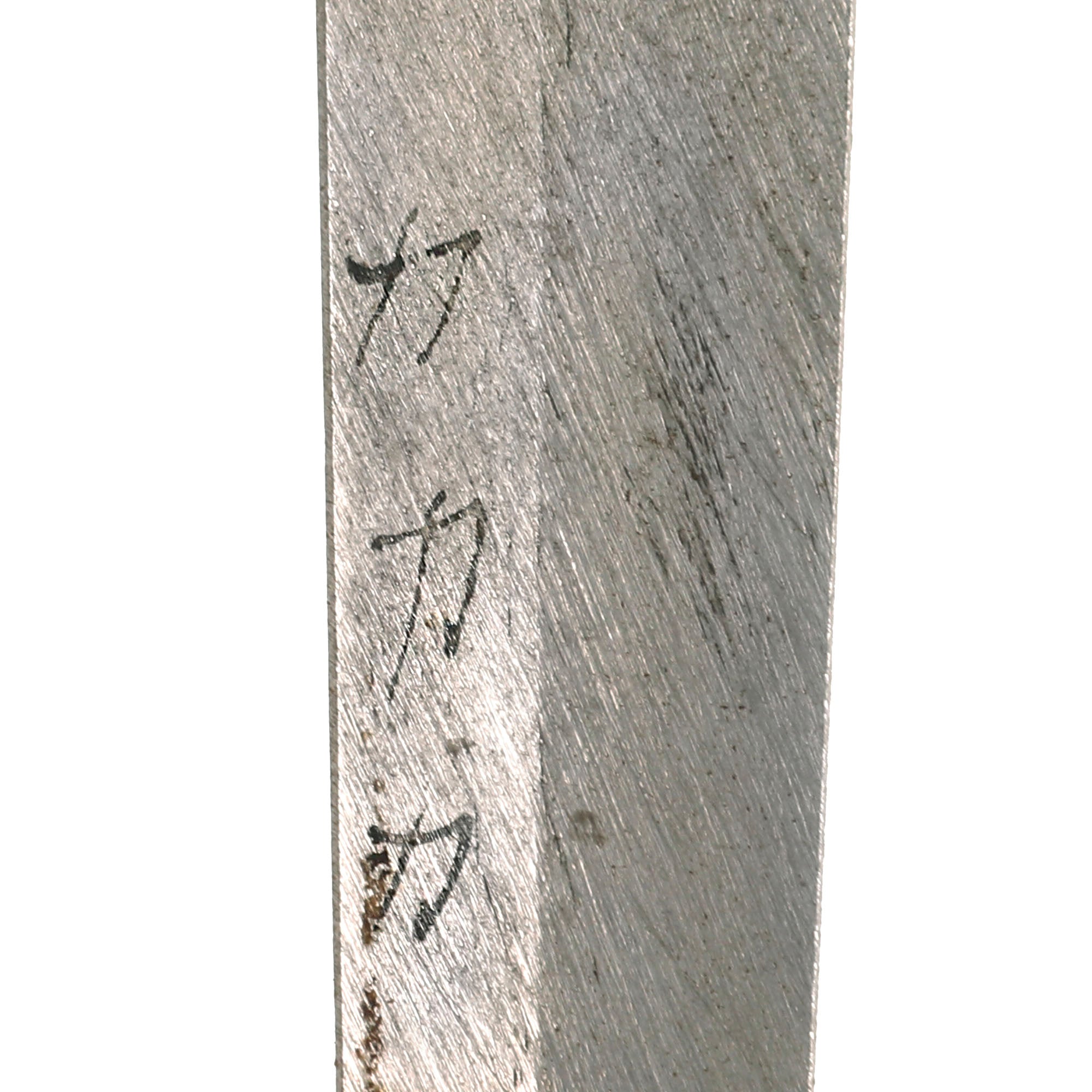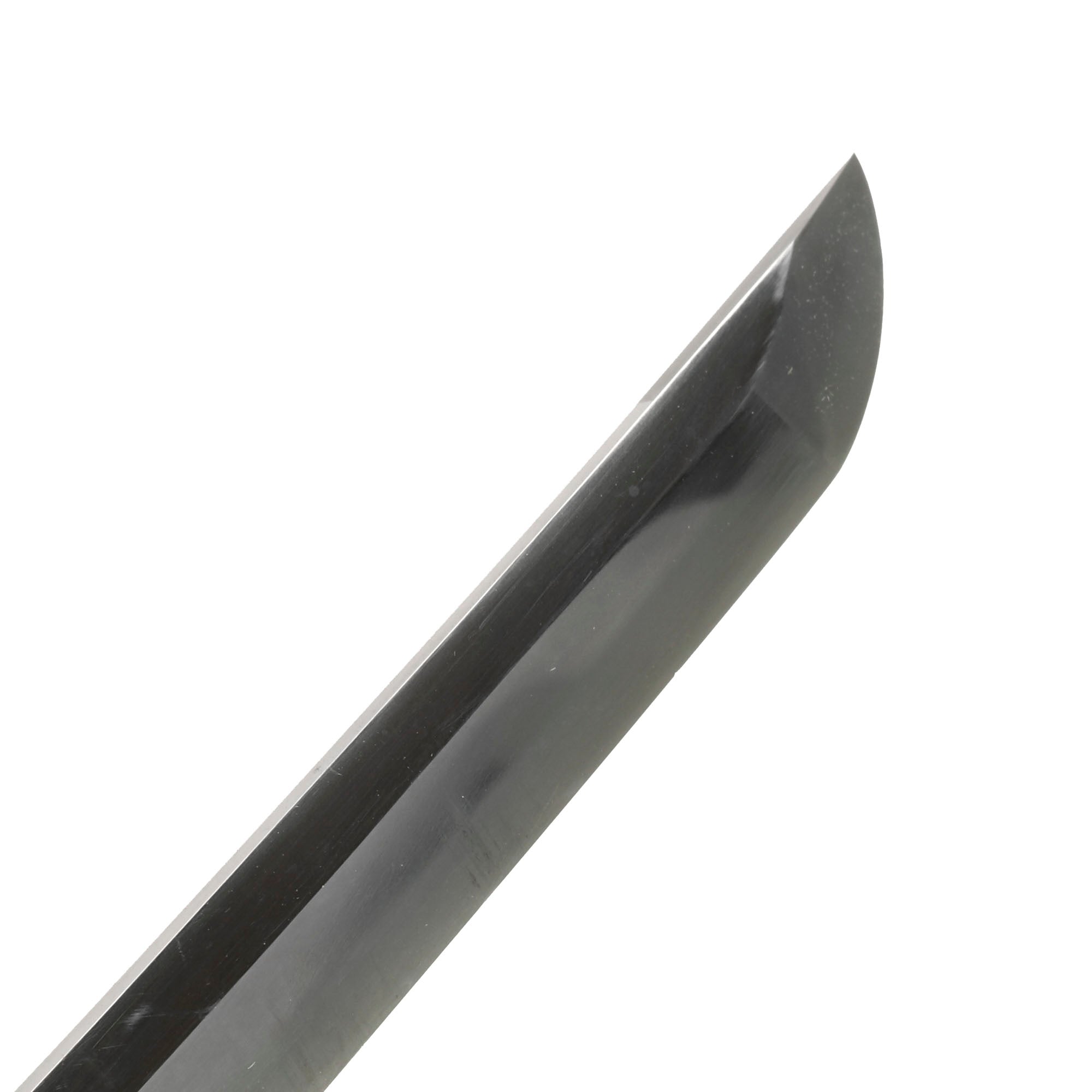 The blade is in excellent condition, with an edge that is still quite sharp. There are just a few scuffs and tiny edge bends keeping it from being MINT, and it is definitely one of the better examples we have seen lately. Blade length is 25 ¼ inches and overall length 35 ⅞ inches. It has a factory forged stainless steel blade, with a single mounting hole in the standard long Futsu 普通 (regular) shaped Nakago (tang) with a Haagari (asymmetrical rounded) nakago-jiri.