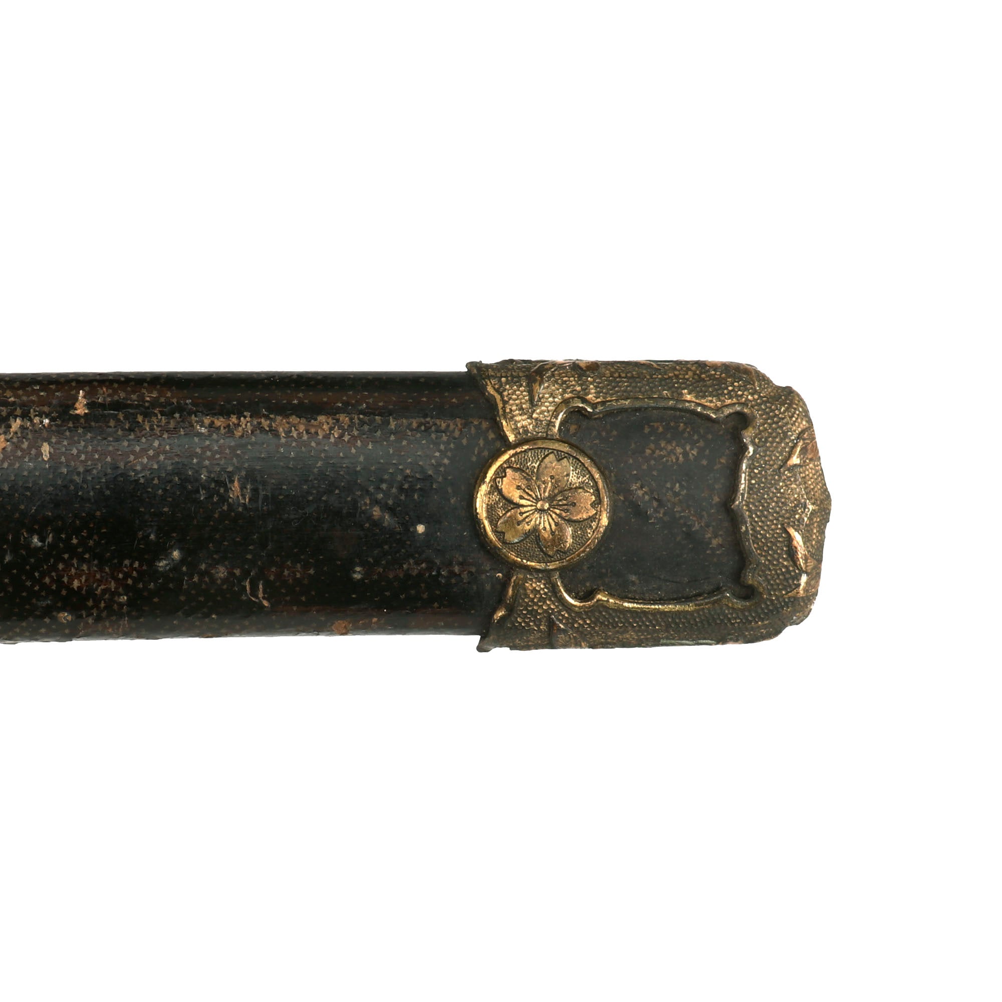 Condition of the blade, scabbard and fittings is very good, indicating light use. There is some light oxidation and plating loss on the various metal fittings. This is particularly true on the O-Seppa, which actually have rusted through in areas, particularly the one facing the blade. This could indicate exposure to sea water. As typical of the pattern, Cherry Blossom motifs appear on many of the fittings. The handle is tight to the blade, with secure spacers and no wobble in the tsuba. The Tsuba and all of the seppa are marked withy matching number 4 6 2, which is also stamped on the end of the tsuka and on the fuchi. This is also written on the inside of the saya (scabbard), and all of this matches the marking on the tang: 四 六 二 - 4 6 2. That means that this is the original set of fittings (koshirae) for this blade, made to fit it specifically.