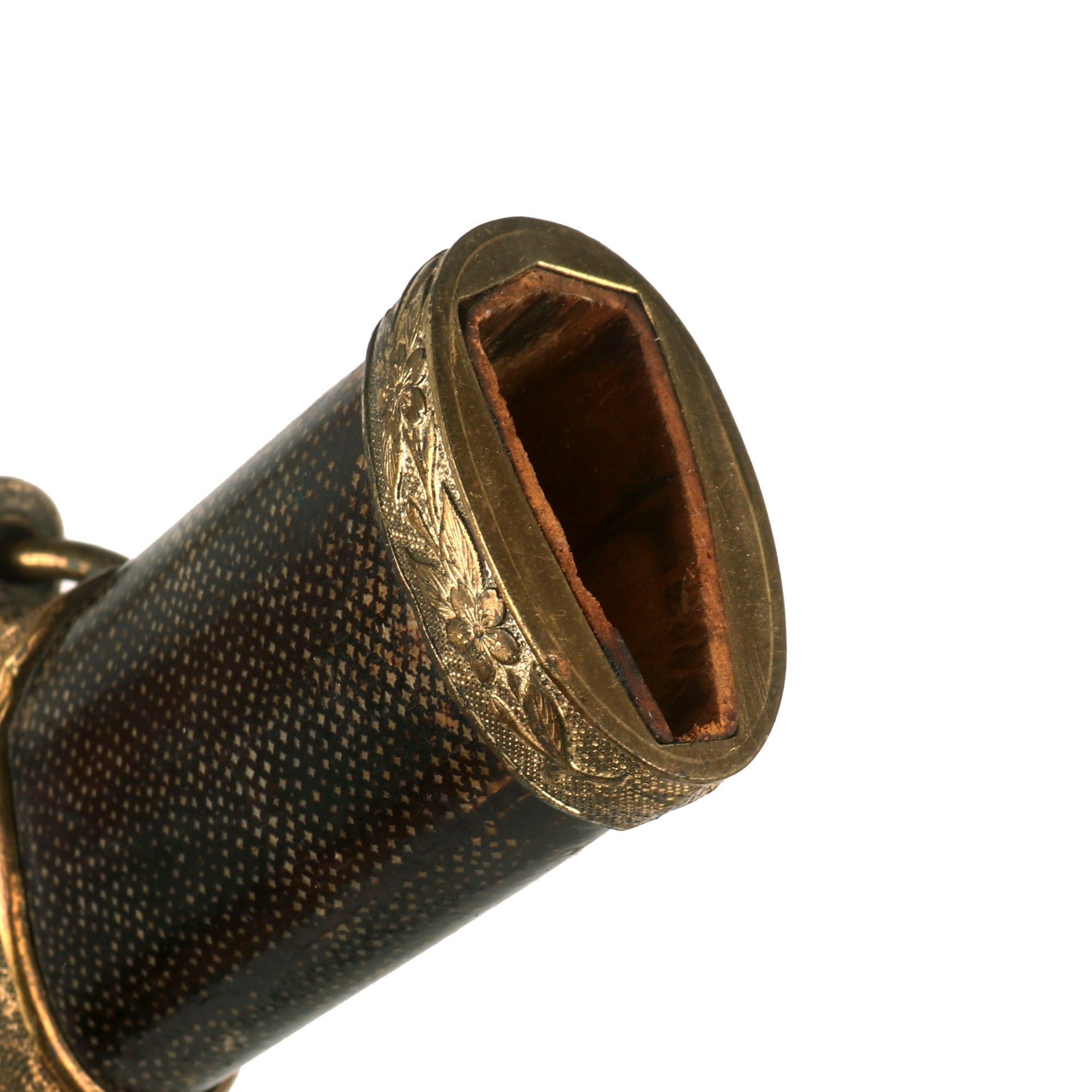 The Wood scabbard (saya) is wrapped in lacquered sharkskin shagreen, and has all plated brass fittings, which do show some wear and flaking of the plating. Unlike most we see, most of the fittings are still firmly in place on the scabbard, so the glue has not degraded over the years. The sharkskin covering is still in great shape, with almost all of the lacquer intact. There is no splitting along the seam, and this is definitely one of the best sharkskin covered scabbards that we have seen in some time. Both hanger rings are still present, making this a really great example of a high grade scabbard.