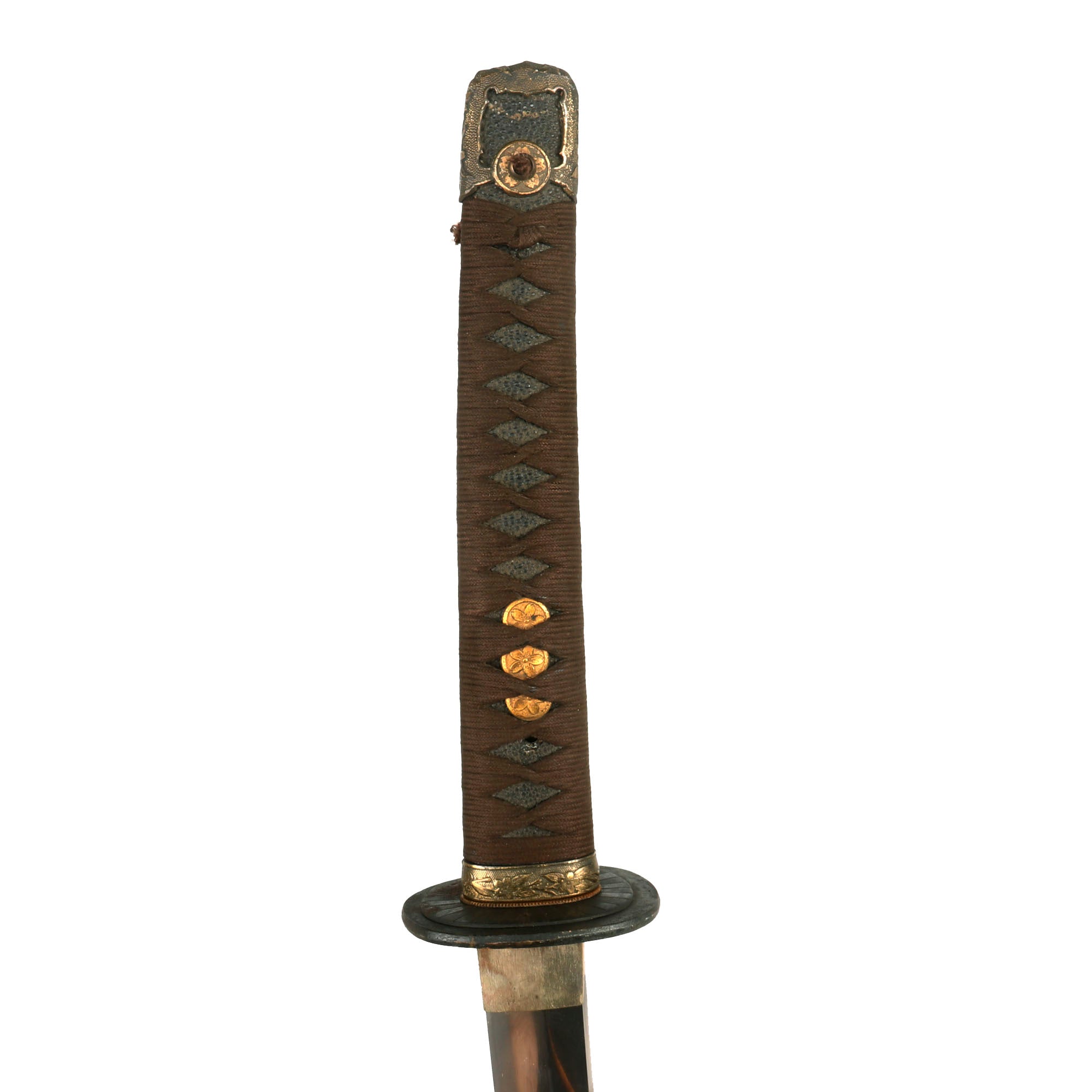 Original Item: Only One Available. Purchased recently at a large military show, this is a very nice wartime High Grade Japanese Naval officer Katana in the Pattern 1937 Kai-Gunto setting. A Kai-Guntō (海軍刀, naval sword) is a weapon and symbol of rank used by the Imperial Japanese Navy during the WWII Period. This is a great example, complete with a desirable sharkskin covered scabbard, and shows signs of light use.