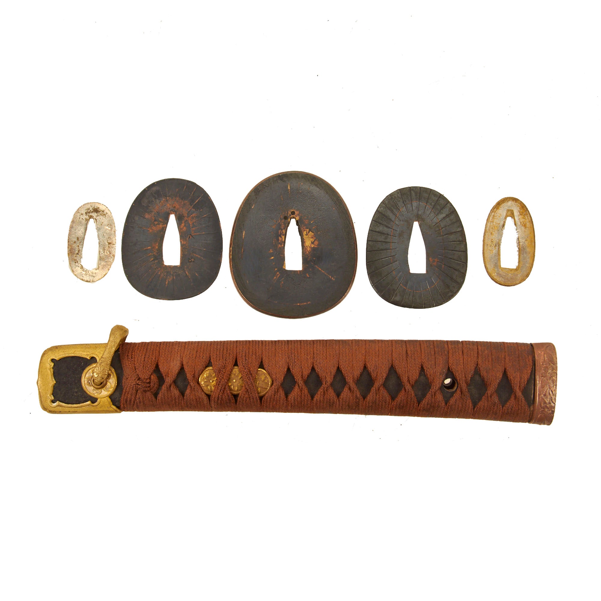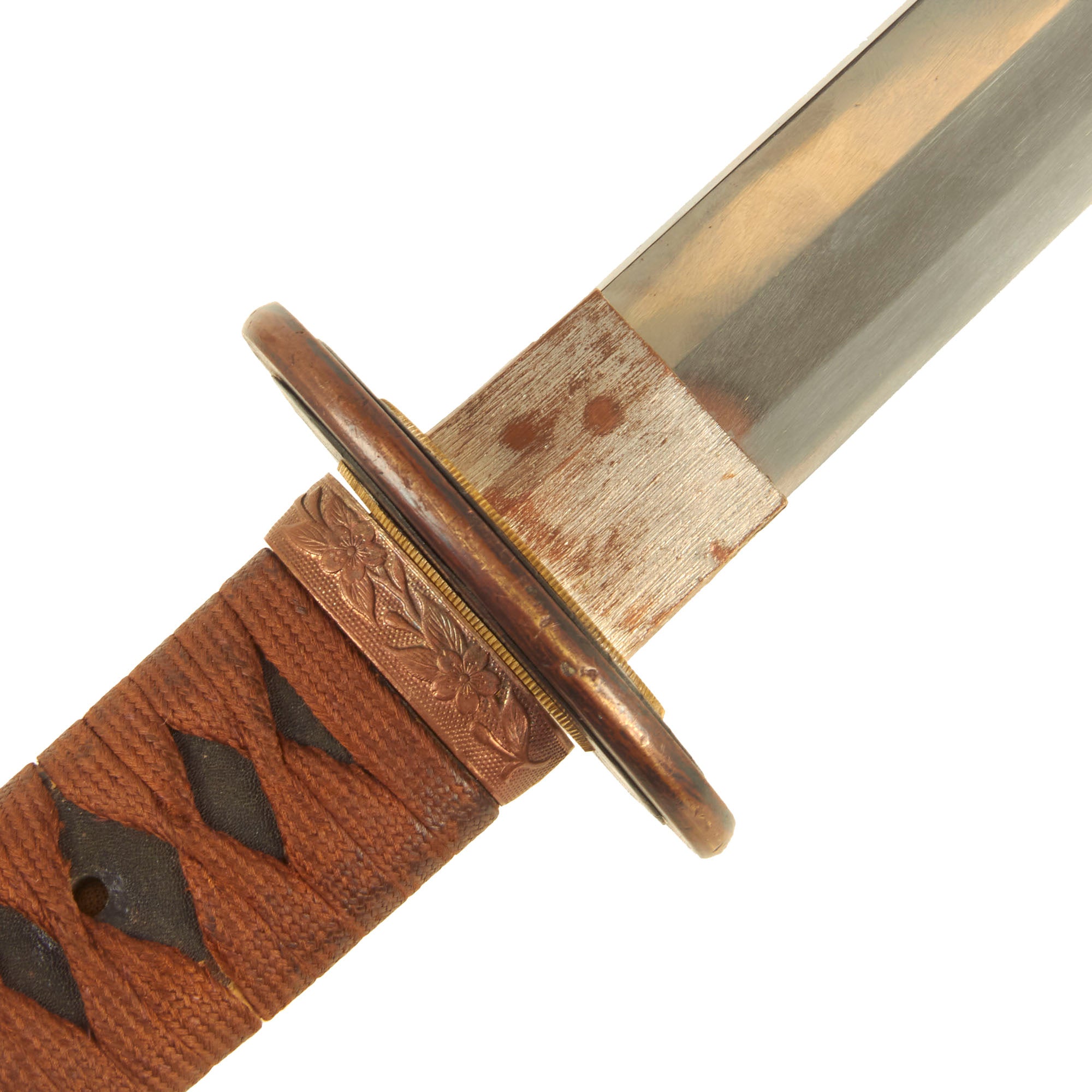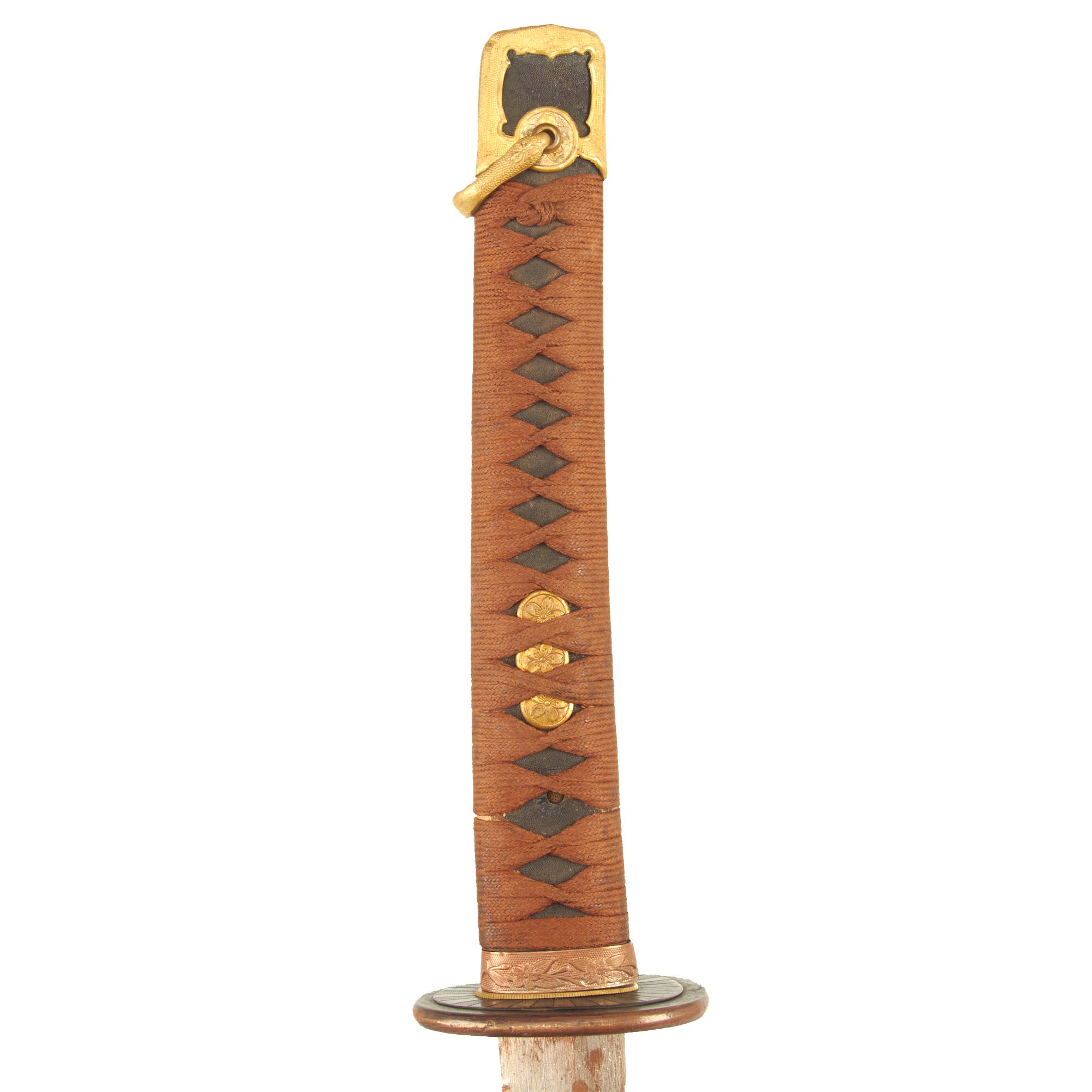 Condition of the blade, scabbard and fittings is very good, indicating light use, though the wrapping does show a bit of dirt and staining. There also is some light oxidation and plating loss on the various metal fittings. As typical of the pattern, Cherry Blossom motifs appear on many of the fittings. The handle is tight to the blade, with secure spacers and no wobble in the tsuba. The Tsuba and all of the seppa are marked withy matching number 5 7, while the end of the tsuka is marked 五 七 = 5 7. The fuchi is not matching, so it may have been replaced at some point. That means that for the most part this is the original set of fittings (koshirae) for this blade, made to fit it specifically.