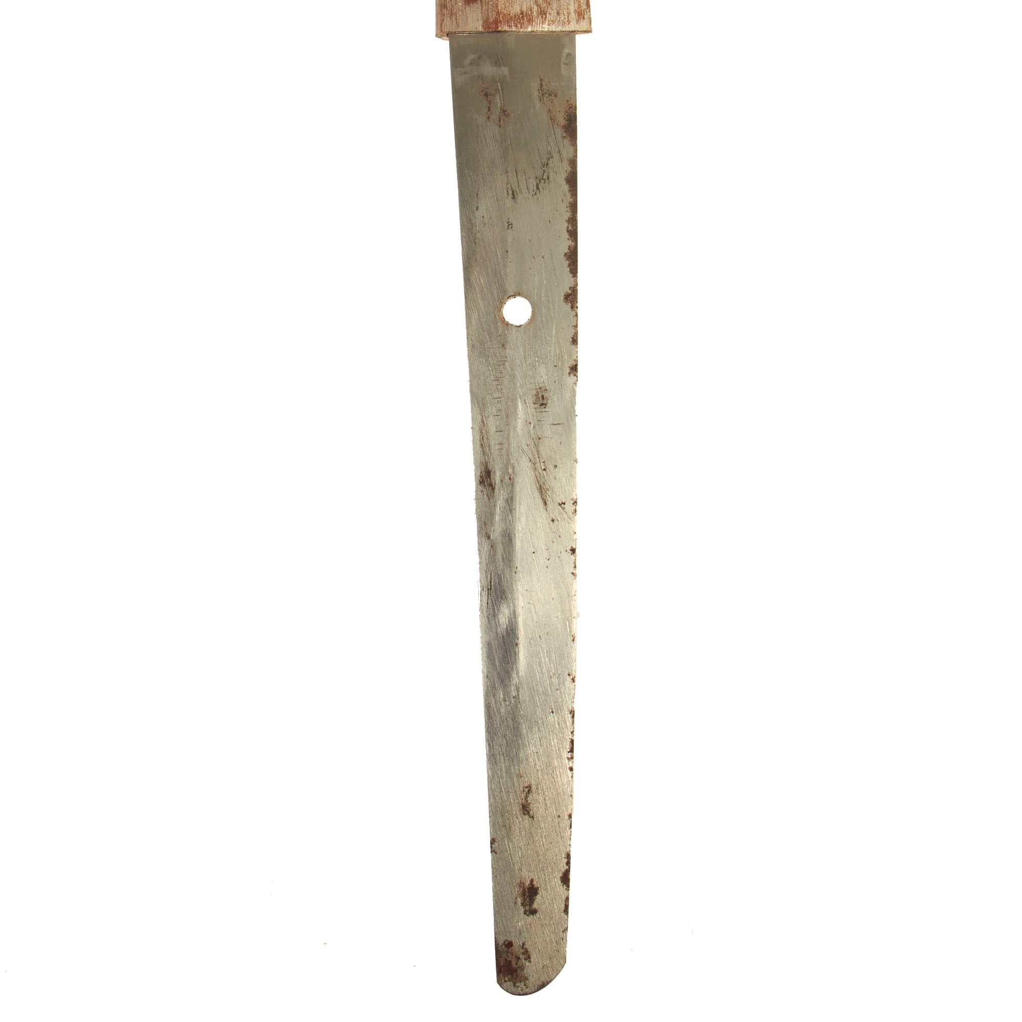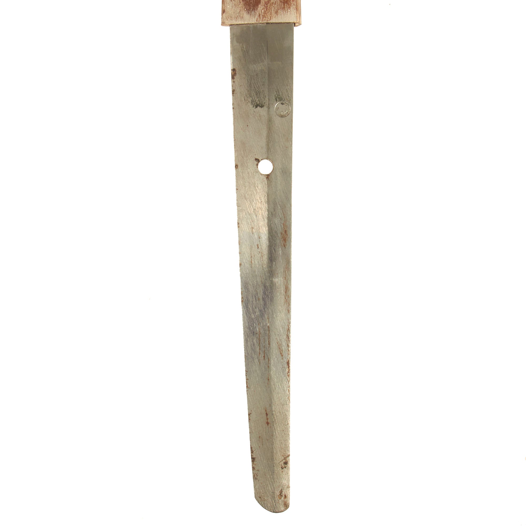 The blade is in excellent condition, with an edge that is still quite sharp. We can not see any dents or bends on the entire length of the edge, making it one of the best we have ever seen. Blade length is 26 inches and overall length 36 1/2 inches. It has a factory forged steel blade, with a single mounting hole in the standard long Futsu 普通 (regular) shaped Nakago (tang) with a Haagari (asymmetrical rounded) nakago-jiri. Most we see of these have a cut tang, but on this higher end katana they seem to have taken a bit more care. The tang itself is marked a Naval ANCHOR stamp, indicating manufacture at Toyokawa Naval Arsenal (豊川海軍工廠, Toyokawa kaigun kōshō). There is no signature (MEI), as is usual for later war pieces.