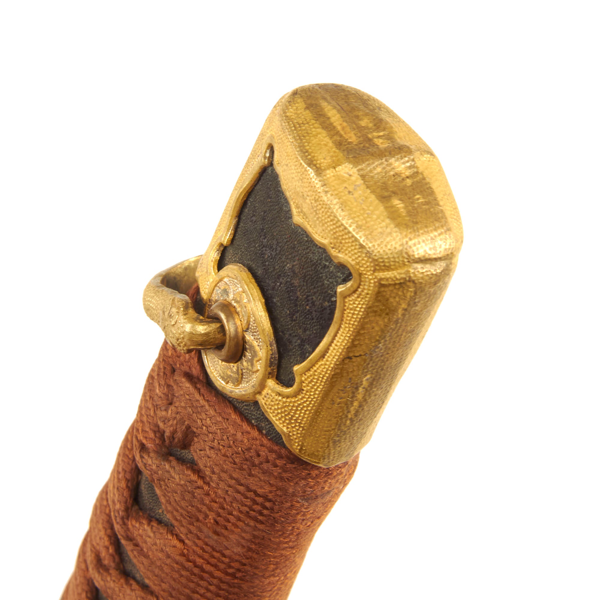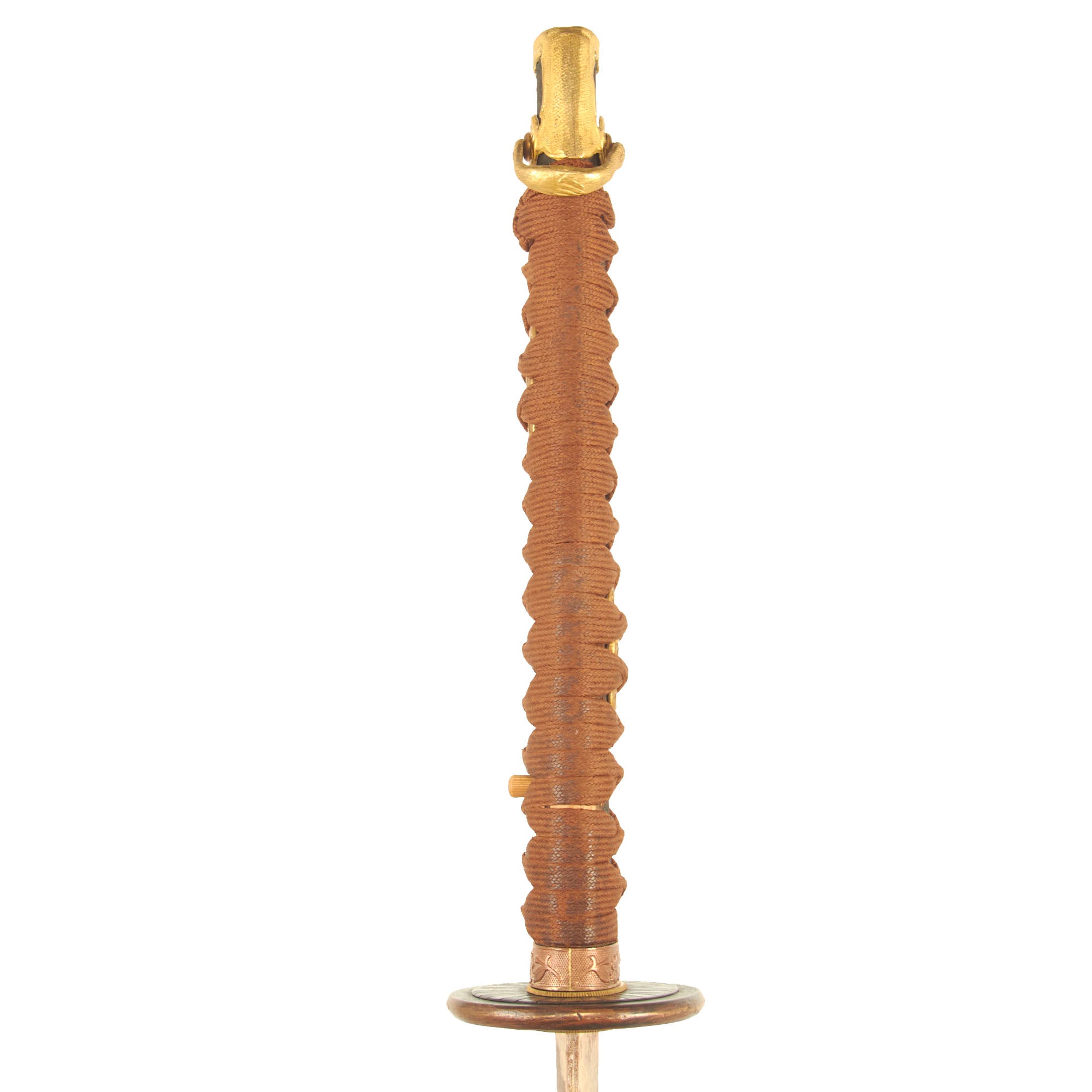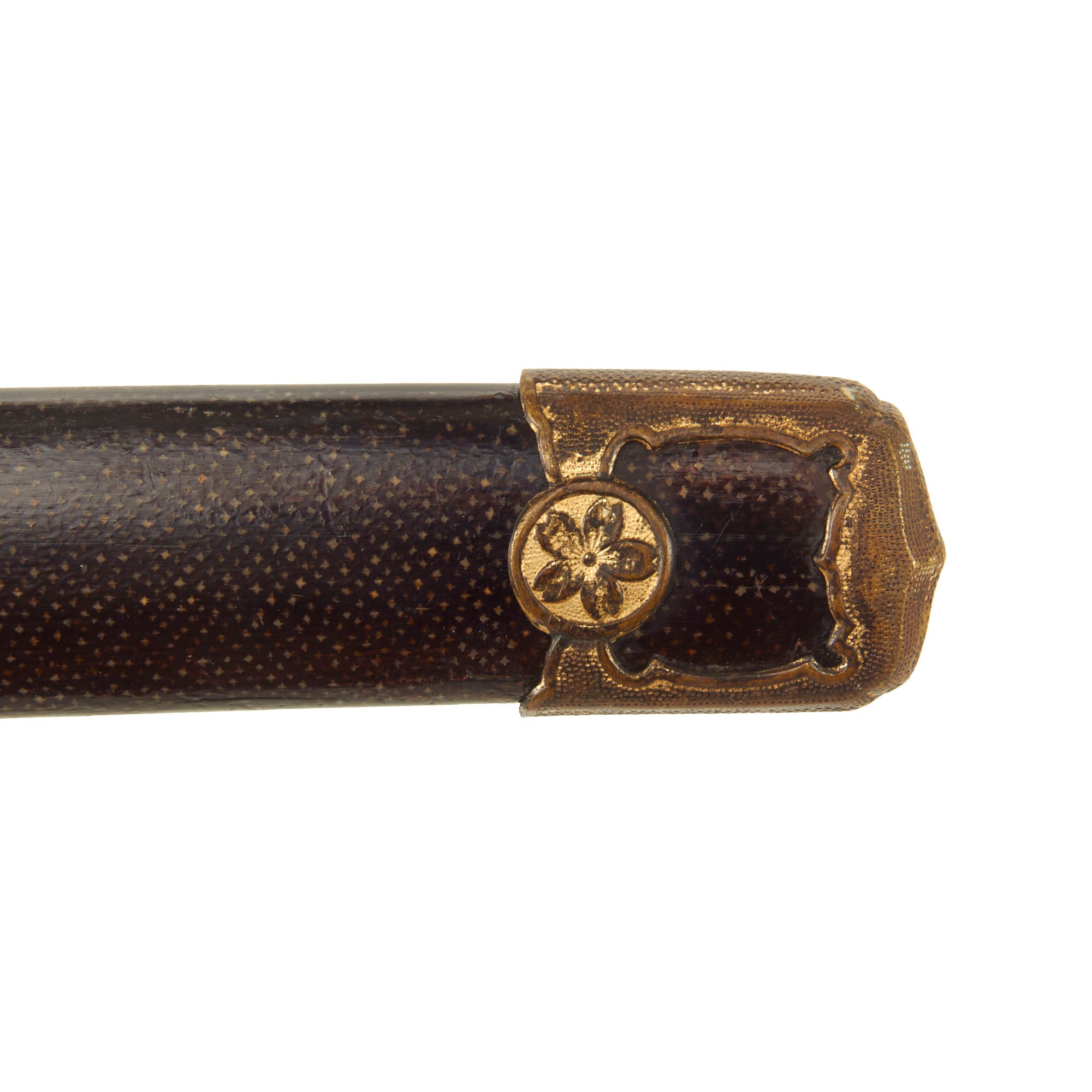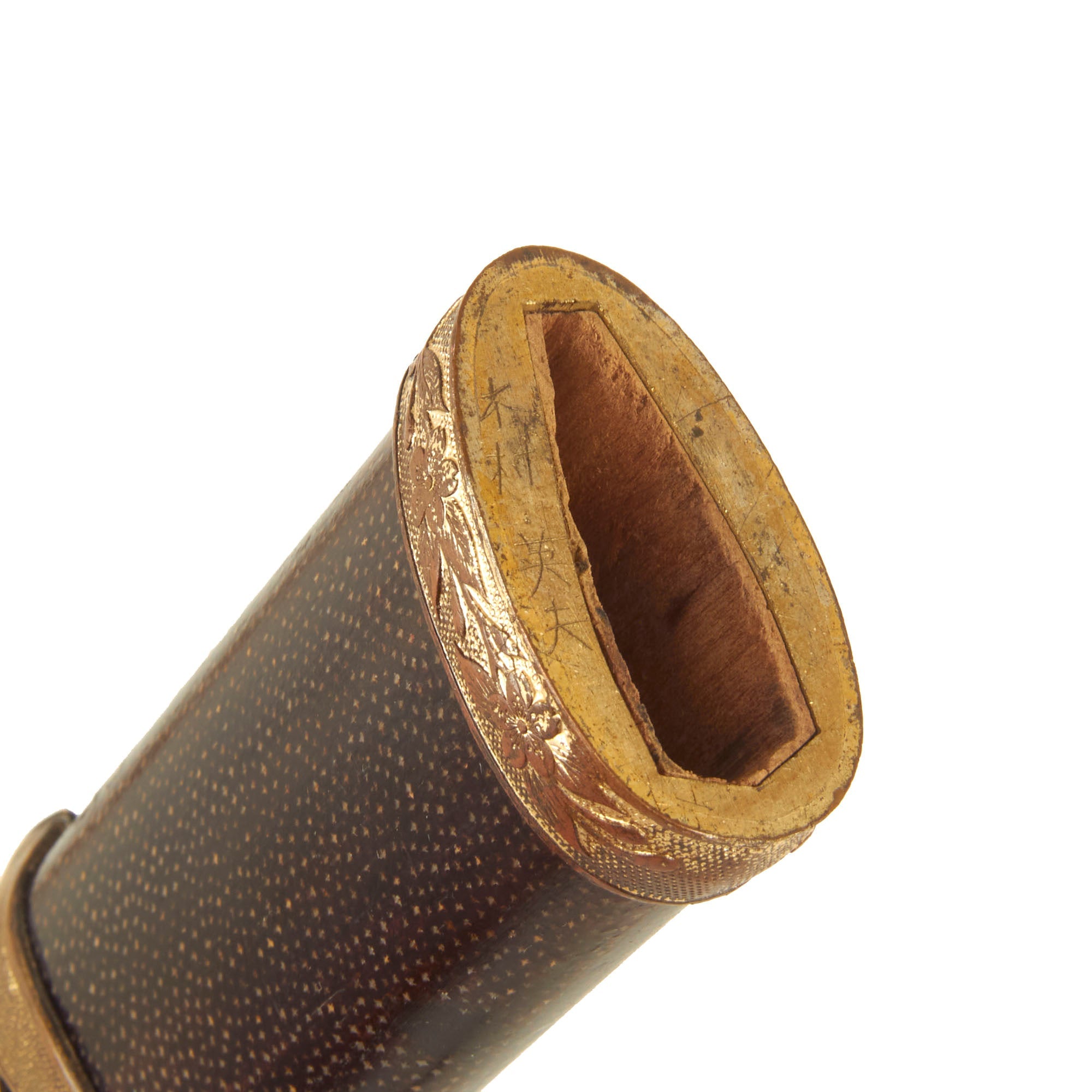 The Wood scabbard (saya) is wrapped in lacquered sharkskin shagreen, and has all plated brass fittings, which do show some wear and flaking of the plating. Unlike most we see, the fittings are still firmly in place on the scabbard, so the glue has not degraded over the years. The sharkskin covering is still in great shape, with almost all of the lacquer intact. There is no splitting along the seam, and this is definitely one of the best sharkskin covered scabbards that we have seen in some time. Both hanger rings are still present, making this a really great example of a high grade scabbard.