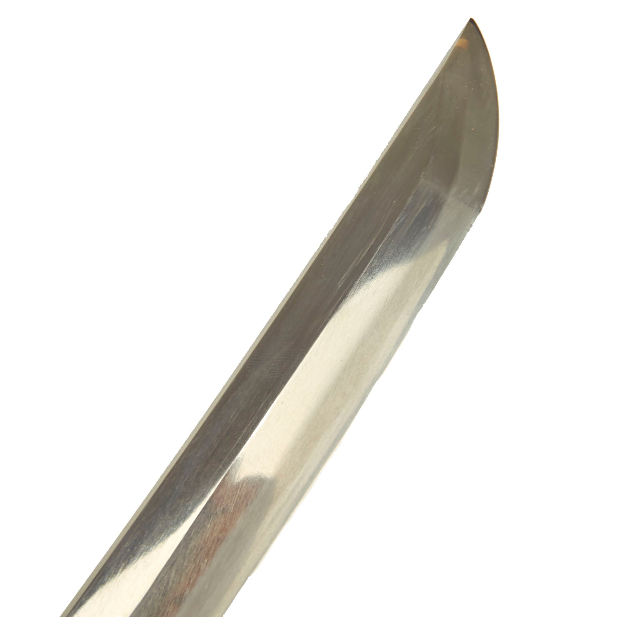 The blade retains virtually all of the original factory finish and simulated straight (sugu) hamon. There are are just a few minor scratches and scuff marks on the surface. There is also a simulated yokote and boshi, and given the total absence of rust on the blade, we believe it to be made from Stainless steel, which was popular for the rust-inducing ocean environment. There is some light oxidation on the tang, but even stainless steel can rust if exposed to wood for a long period. Japanese Kai-Gunto naval officers swords are somewhat rare, given that they usually went down with the ships. This particular example has high grade fittings, which we see much more often on signed and/or handmade blades.