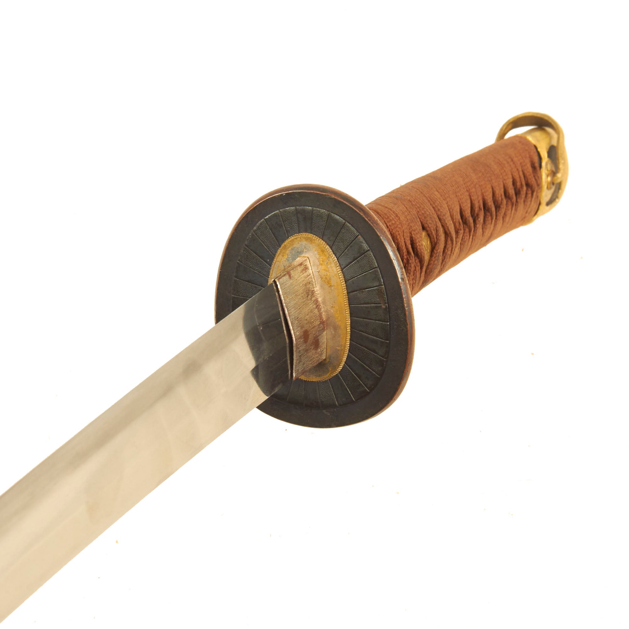 It has a heavy round tsuba (cross guard), with two Seppa (spacers) and two O-Seppa (Large spacers) around the tsuba that are large and highly stylized, correct for the Kai-Gunto pattern. All of these are non-magnetic, with the tsuba and O-seppa being made from blacked copper or brass. The tsuka (handle) has two gold highlighted Cherry-Blossom menuki (grip decorations), and a nice brass Kabuto-Gane (End Cap) with a brass loop through the end. There is a single bamboo securing peg still present, which looks to be a replacement. The grip has an excellent black textured oilcloth grip (Sa-Me) under the complete brown colored Ito (cloth binding) with fine brass decorative collar (fuchi).