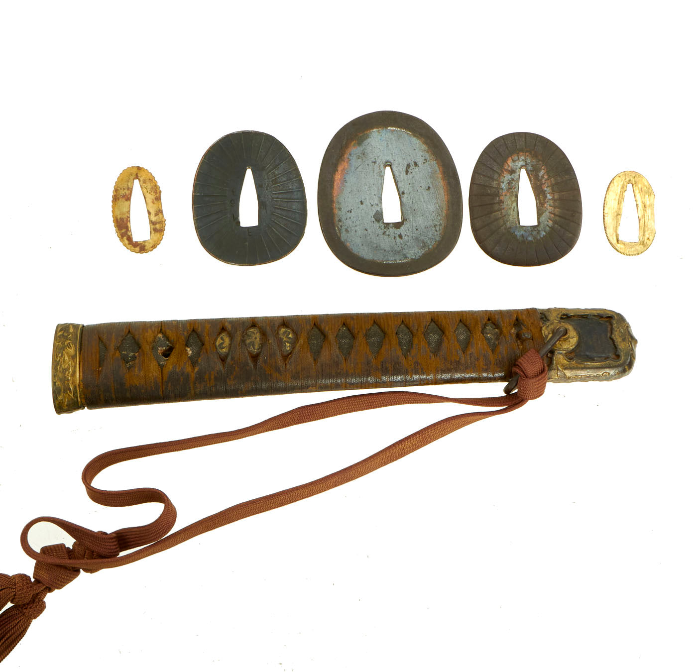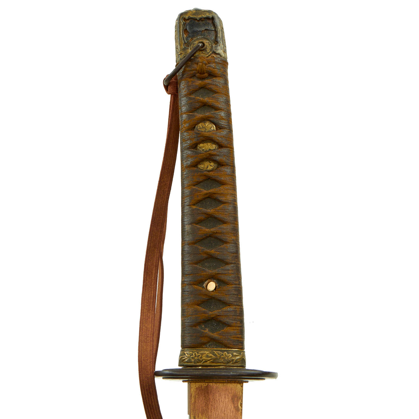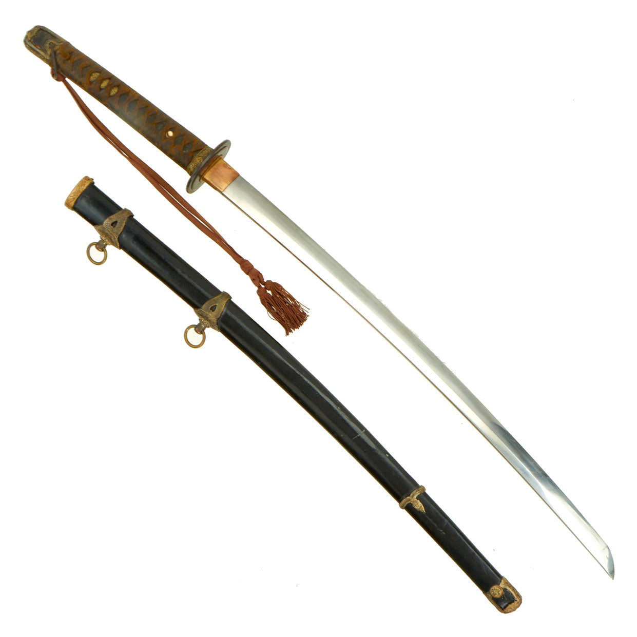Original Item: Only One Available. Purchased recently at a military show, this is a very nice wartime production Japanese Naval officer Katana in the Pattern 1937 Kai-Gunto setting. A Kai-Guntō (海軍刀, naval sword) is a weapon and symbol of rank used by the Imperial Japanese Navy during the WWII Period. This is a great example, complete with scabbard, and shows moderate service wear on the fittings. Usually we see these looking unissued, so to find one that was "really there" is a real treat! It still has the original brown tassel, which was used for all Naval officer grades.