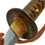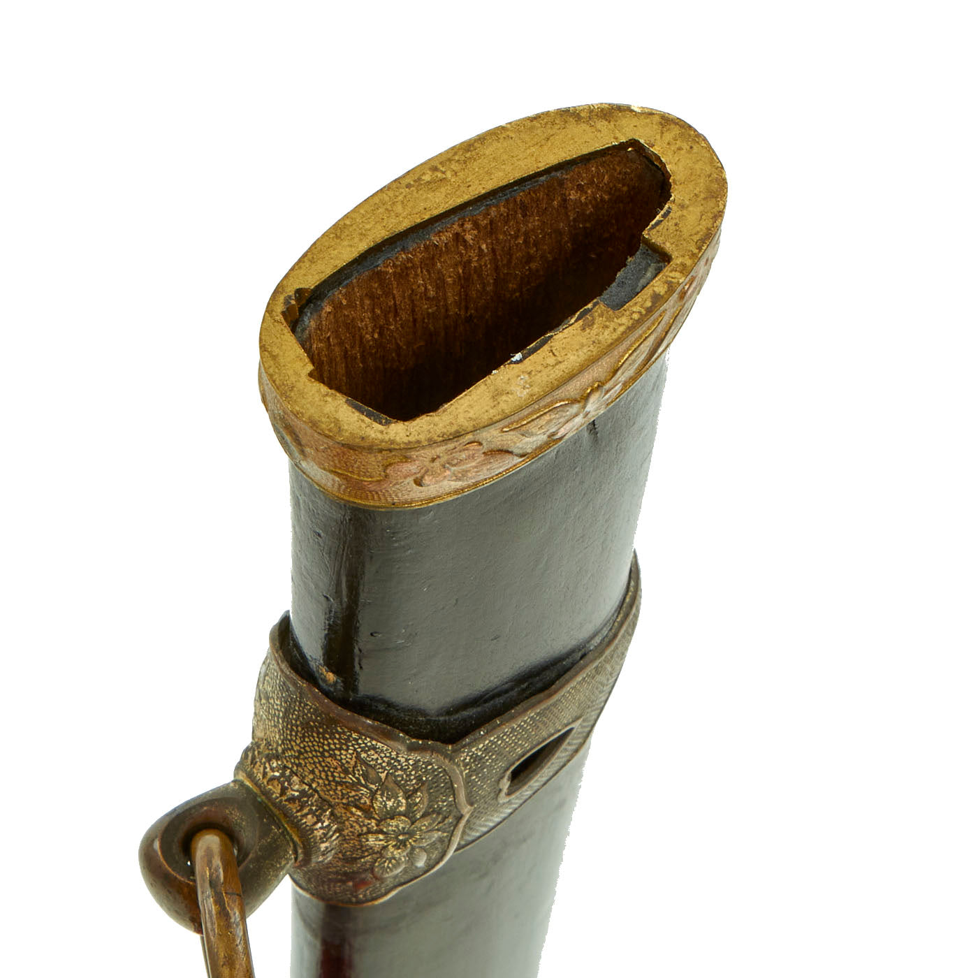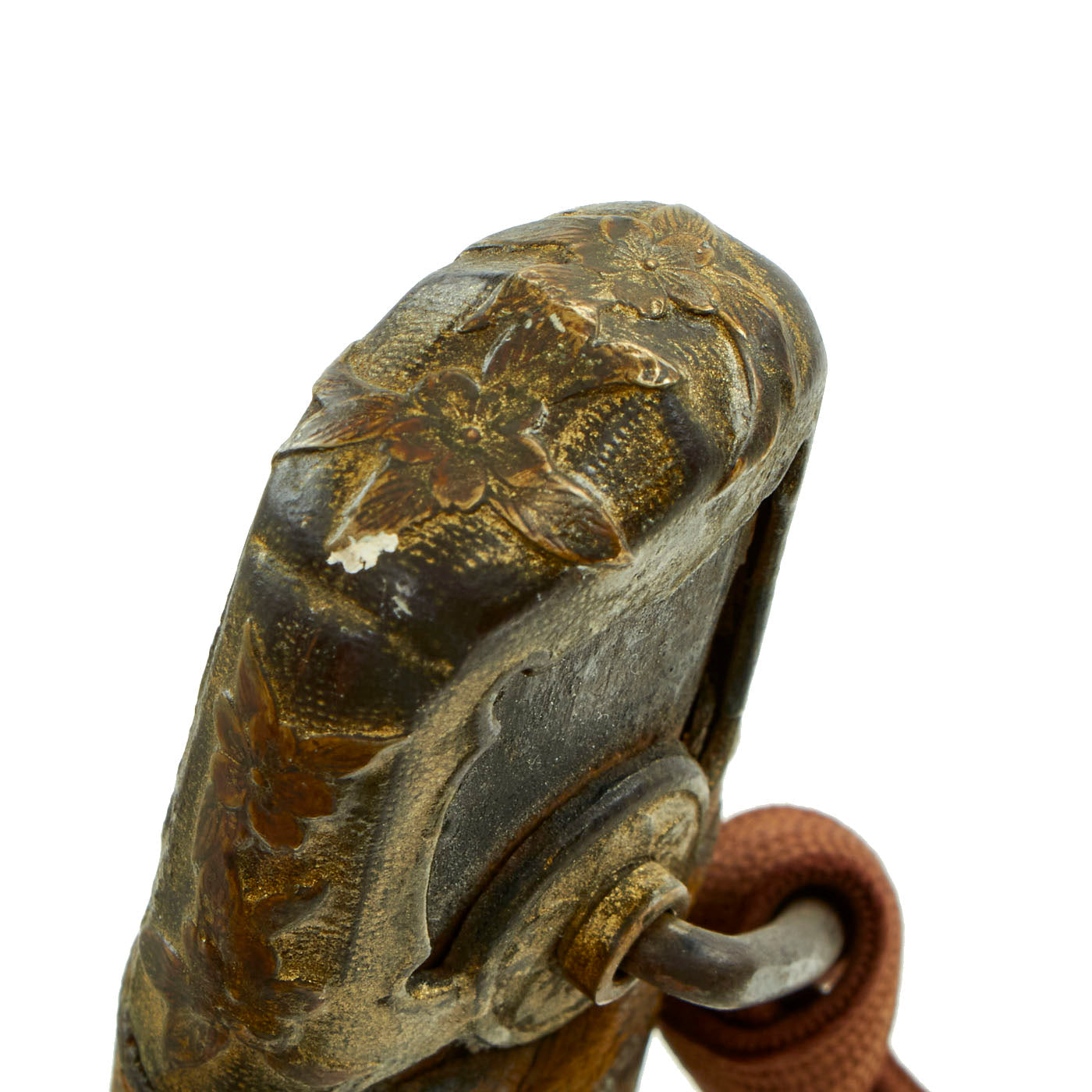 It has a heavy brass plated iron tsuba (cross guard), with 2 Seppa (spacers) and two O-Seppa (Large spacers) around the tsuba that are large and highly stylized, correct for the Kai-Gunto pattern. All of these are plated steel, with the tsuba and O-seppa being blacked over copper plate. The tsuka (handle) has two plated iron Cherry-Blossom menuki (grip decorations), and a nice brass Kabuto-Gane (End Cap). It has a very nice black sharkskin grip (Sa-Me) with complete service worn olive brown-colored Ito (cloth binding) with fine decorative brass collar (fuchi). Condition of the blade, scabbard and fittings is very good, indicating light use. As typical of the pattern, Cherry Blossom motifs appear on many of the fittings. The handle is tight to the blade, though there is a bit of cross guard wobble, and the mekugi (peg) is a replacement.