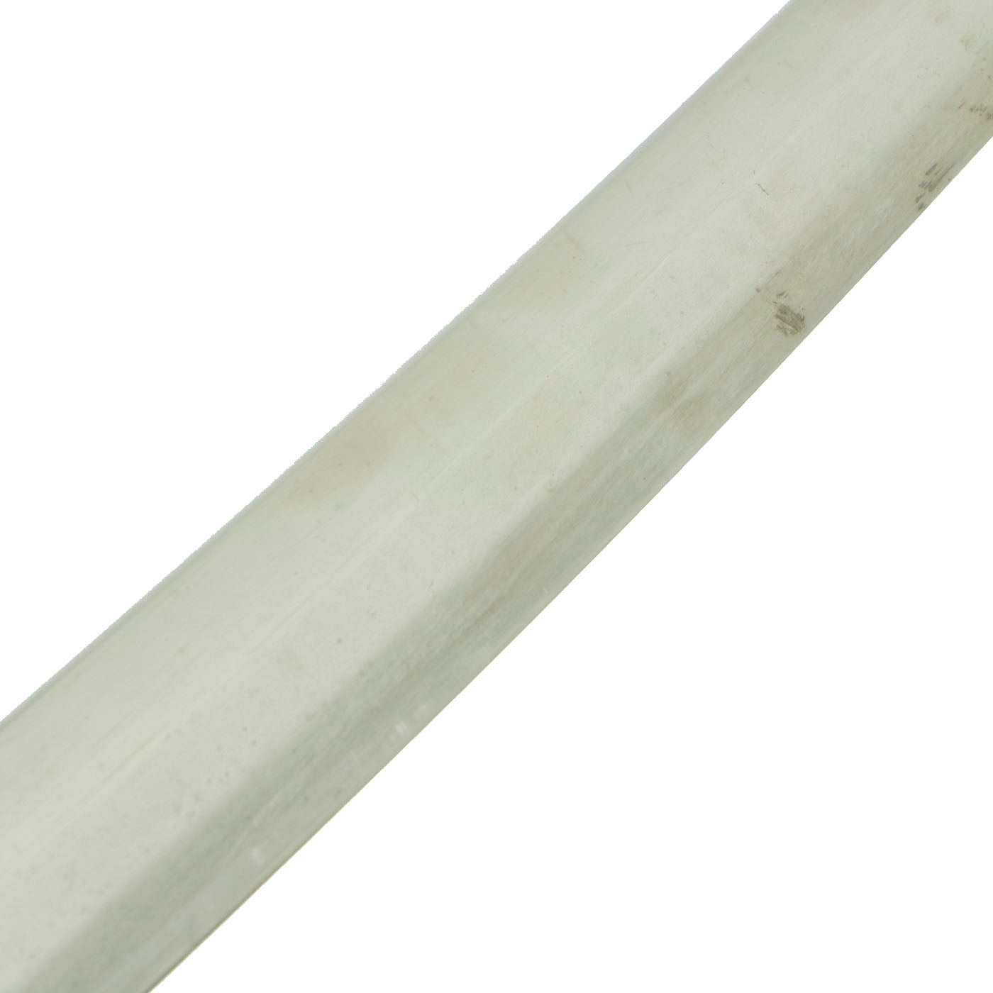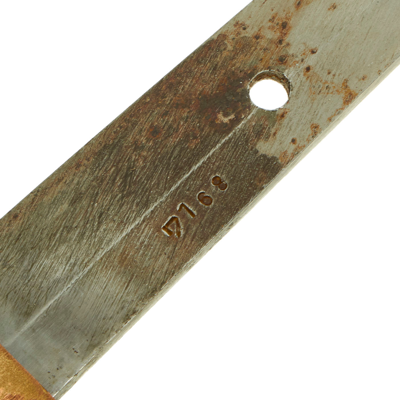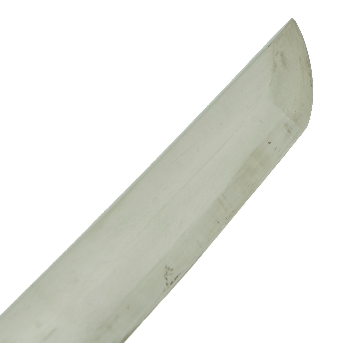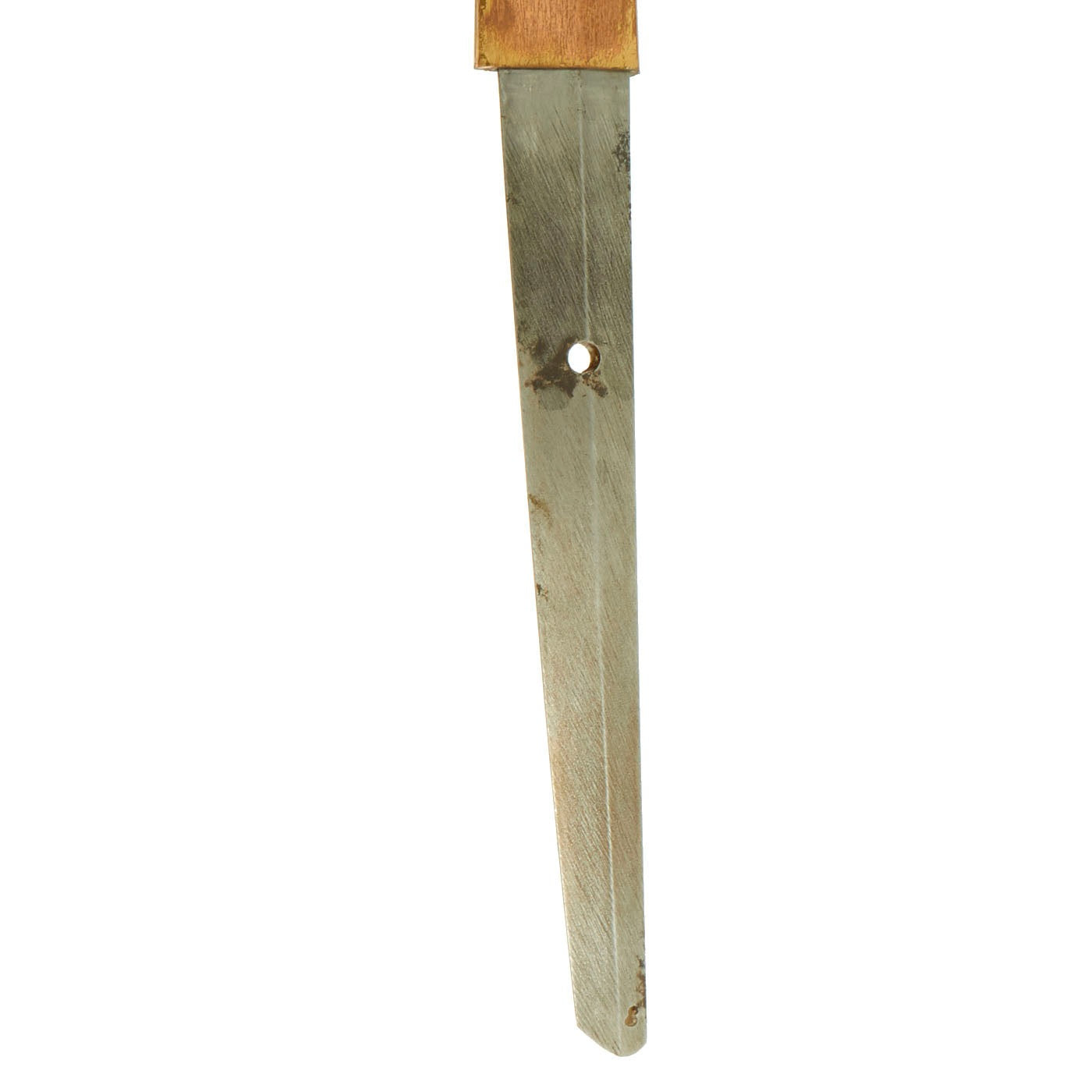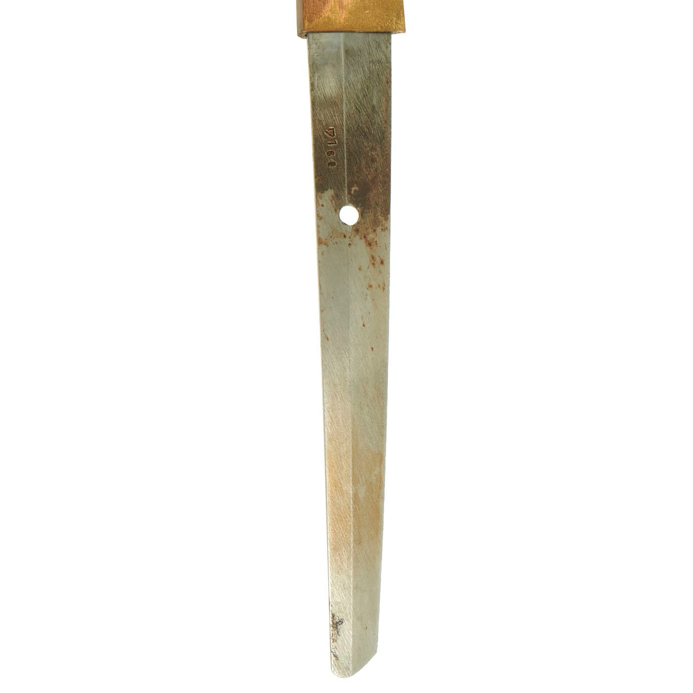 The blade is in excellent condition, with an edge which is still quite sharp. There are just a few areas of minor scuffing from use and cleaning, and no nicks or dents on the edge that we can see.. Blade length is 25 1/2 inches and overall length 36 1/4 inches. It has a factory forged steel blade, with a single mounting hole in the standard long Futsu 普通 (regular) shaped Nakago (tang) with a Naagari (asymmetrical rounded) nakago-jiri (tang tip). There is no signature (MEI), as is usual for later war pieces, however the tang is stamped with matching number ワ1 6 8 (WA 168).