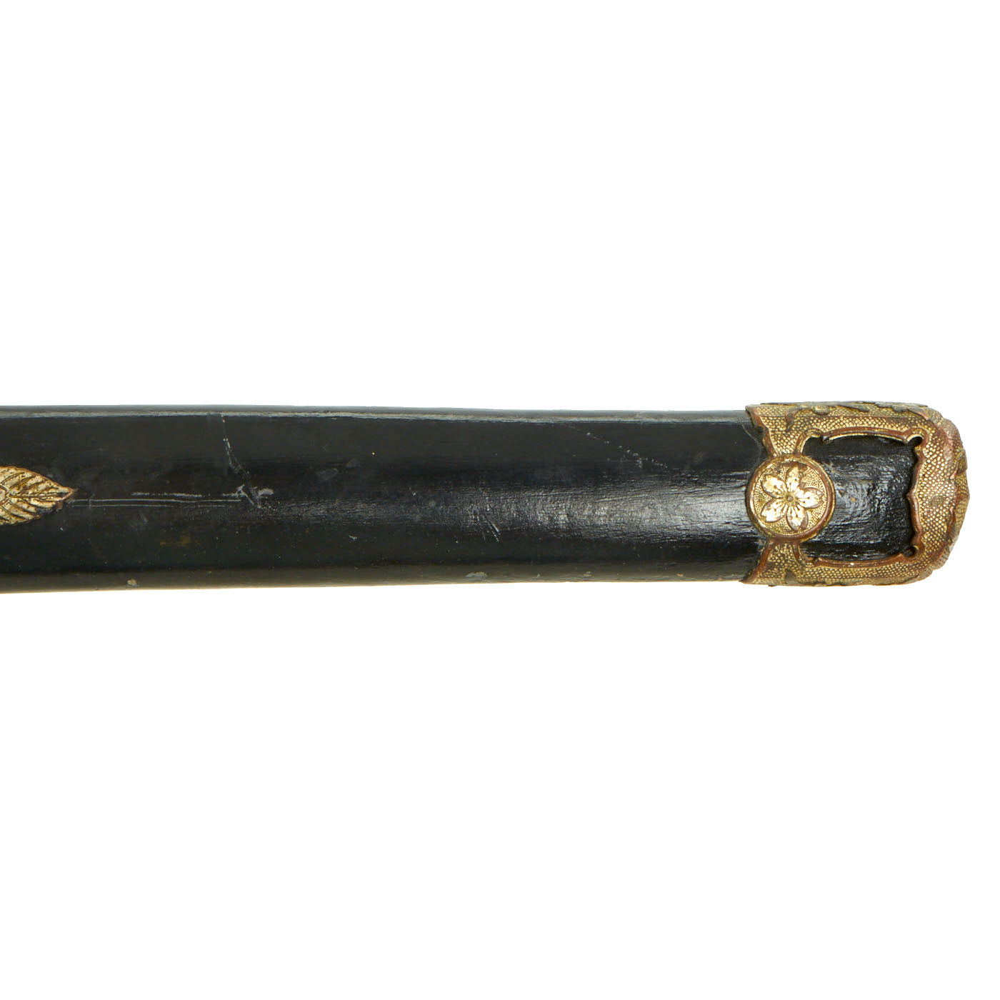 The blade retains virtually all of the original factory finish and simulated straight (sugu) hamon. There are are just a few minor scratches and scuff marks on the surface. There is also a simulated yokote, and given the total absence of rust on the blade, we believe it to be made from Stainless steel, which was popular for the rust-inducing ocean environment. Japanese Kai-Gunto naval officers swords are somewhat rare, given that they usually went down with the ships. This particular example has mid grade fittings, which are quite nice, but not the same level seen on the higher end examples made for command officers.