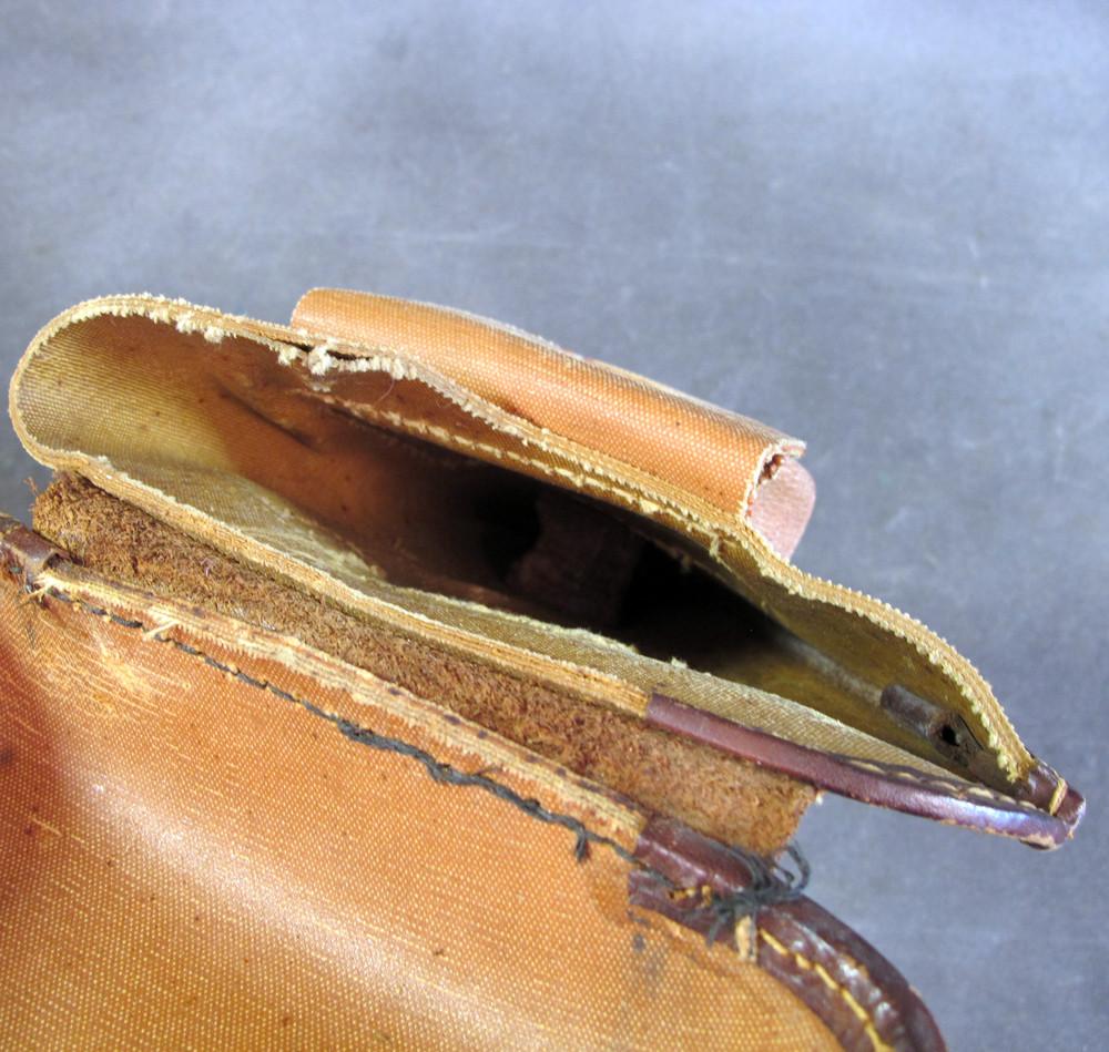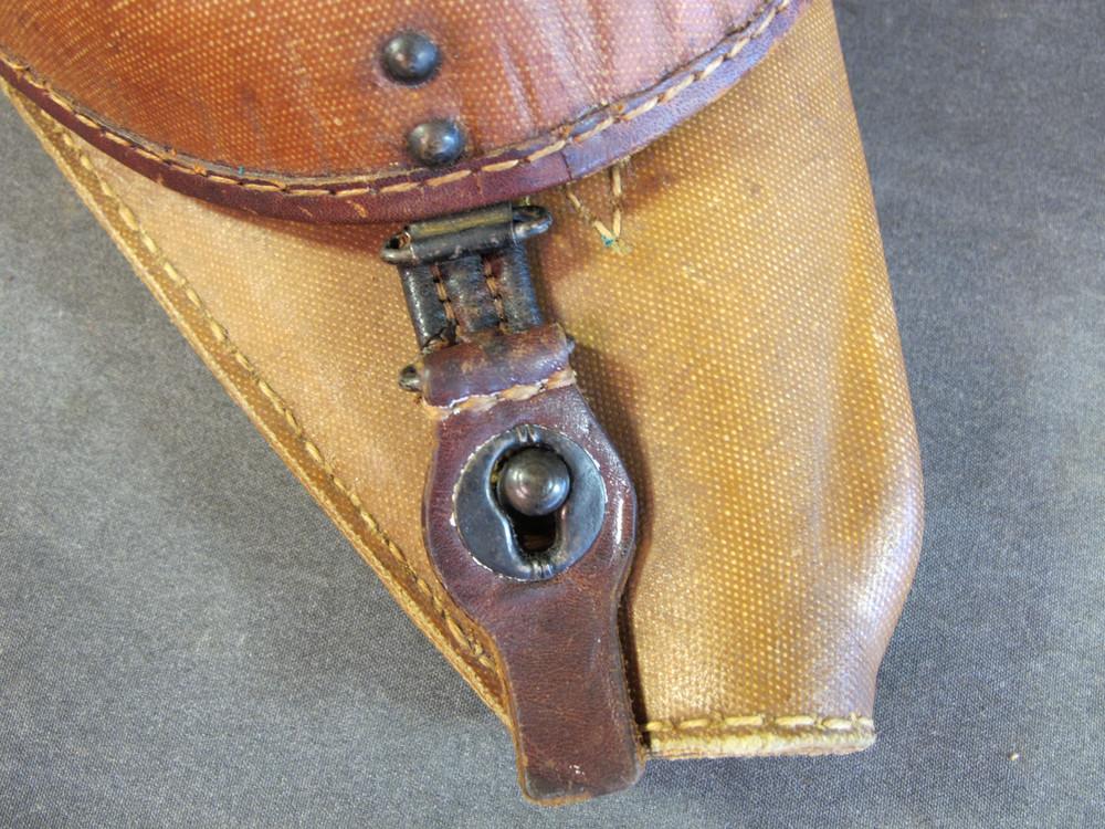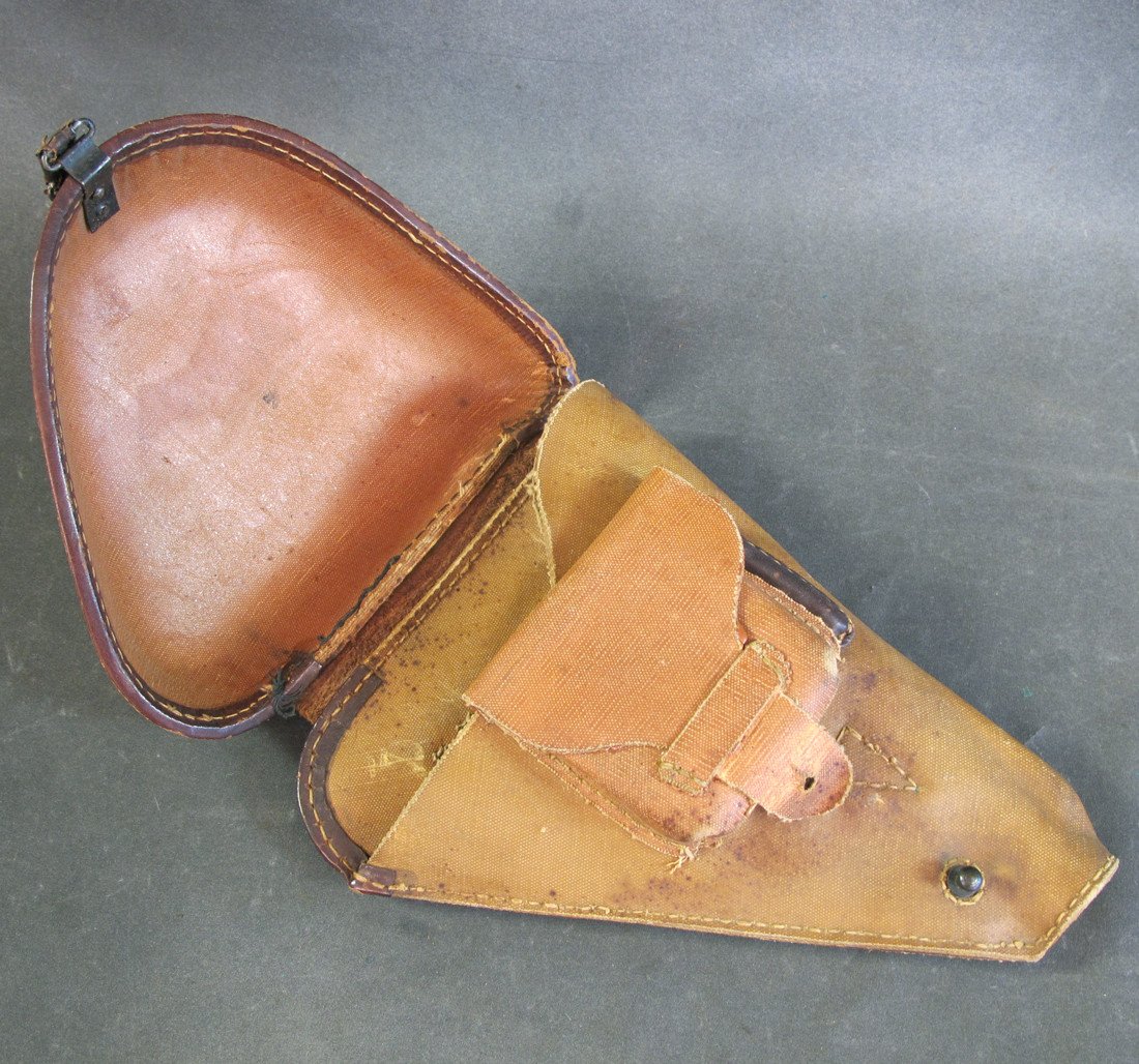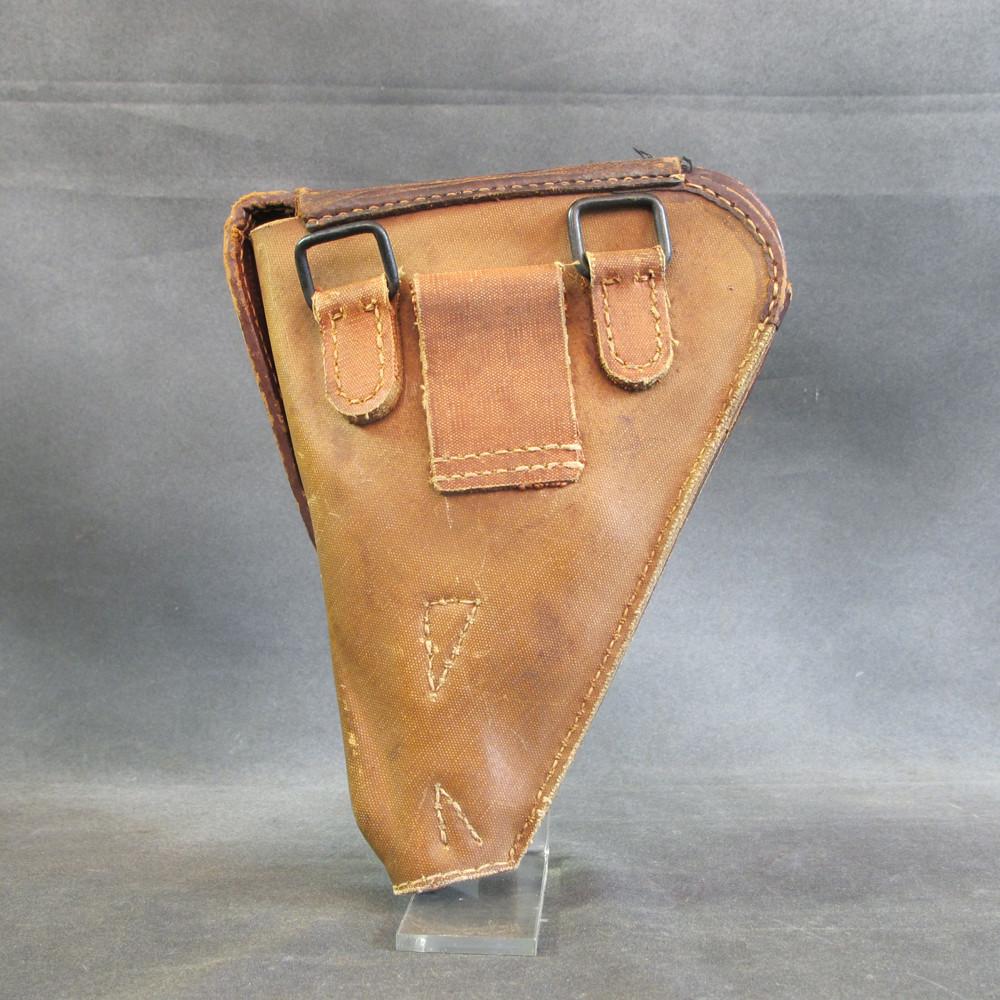 Original WWII Type 14 Nambu rubberized canvas late war pistol holster, offered in very good, but stiff condition. Even the closure latch with the three springs under a leather covering is in full working order.