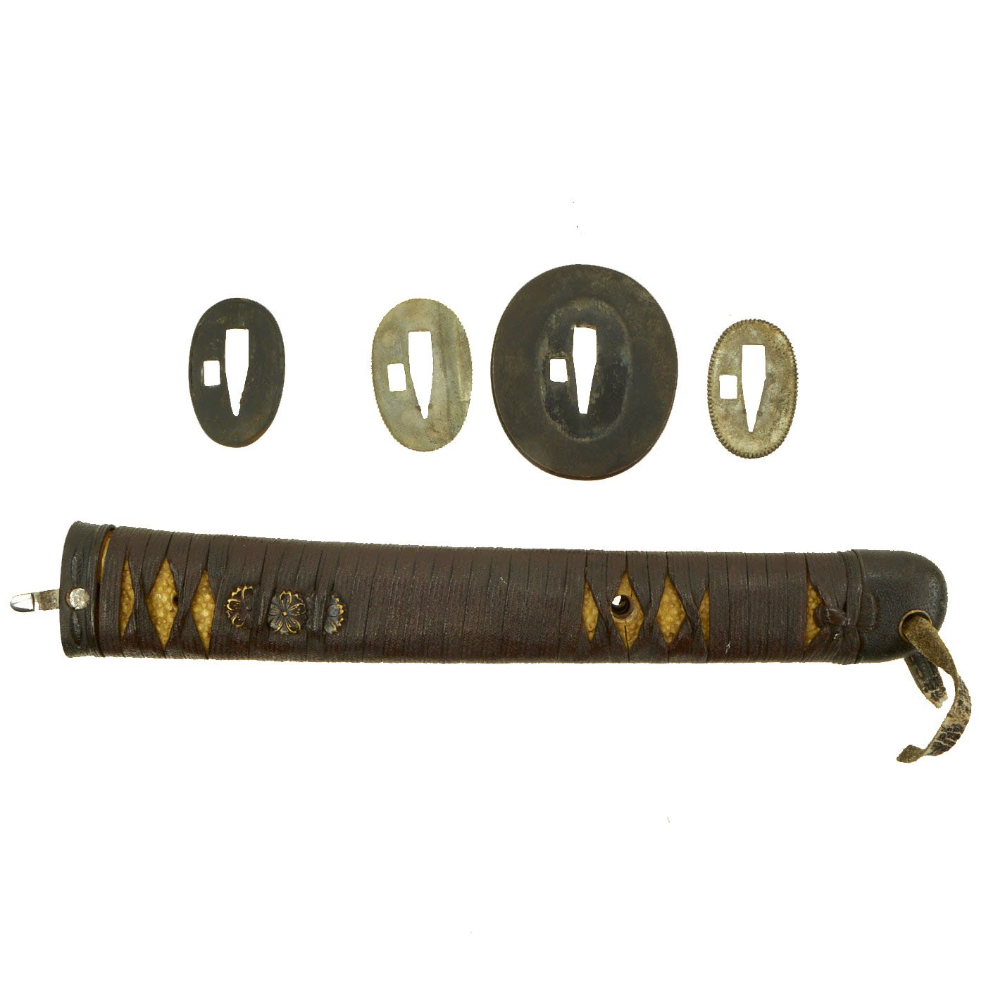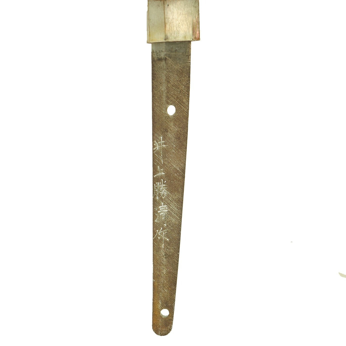 The blade on this example was hand forged, and the tang of the blade bears a faint star stamp of the RJT inspection by the upper peg hole. Below this it is signed (Mei) with the characters 井上 勝 清 作 - INOUE KATSUKIYO SAKU, or "Inoue Katsukiyo made this." We have compared the tang to other blades and this is definitely in the same style as they usually sign their blades. They are on the 1933 Rikugun Jumei Tosho Meibo list, but there is not much else that we have been able to find out about them.