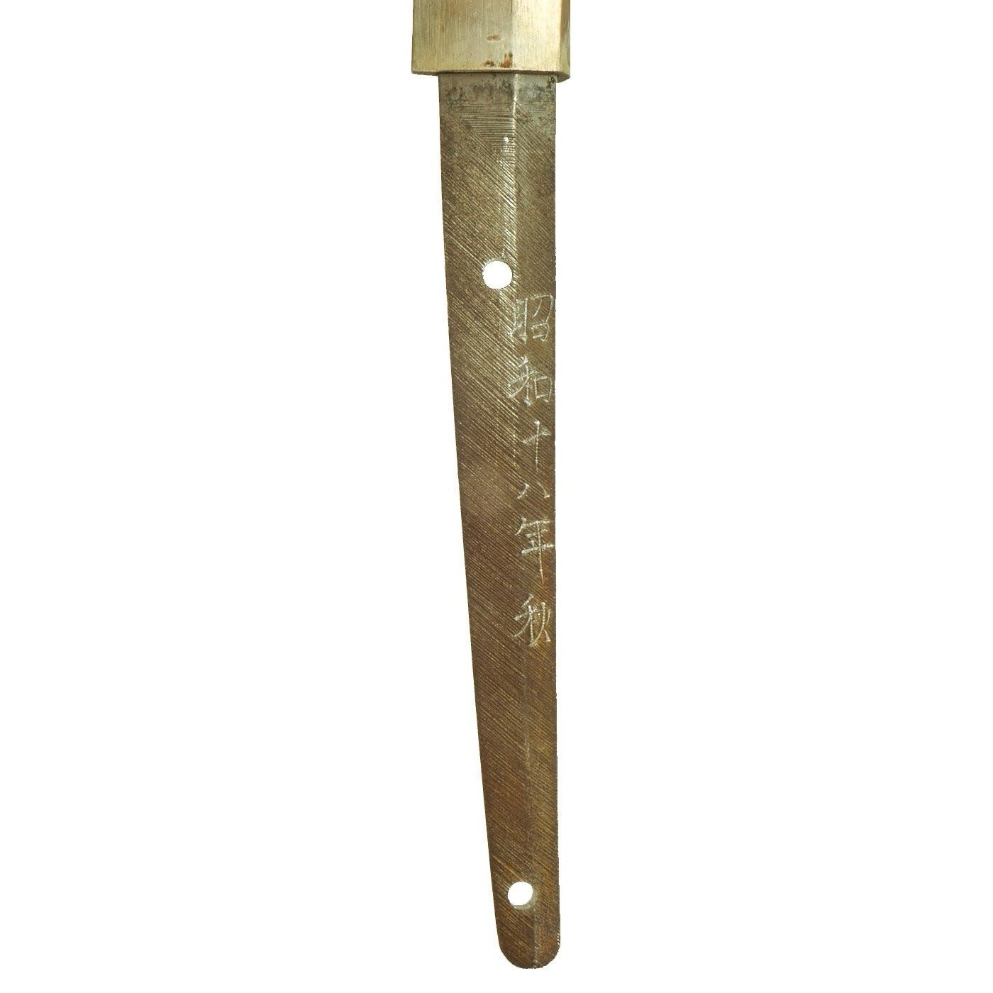 The other side of the tang bears the date when the blade was produced, in the standard long form indicating years into the current emperor's reign: 昭 和 十 八 年 秋. This would be read: SHOWA (current reigning emperor) Juu-Hachi Nen (18th year of reign - 1943) Aki (Autumn). The tang markings have been highlighted with white to make them easier to see.