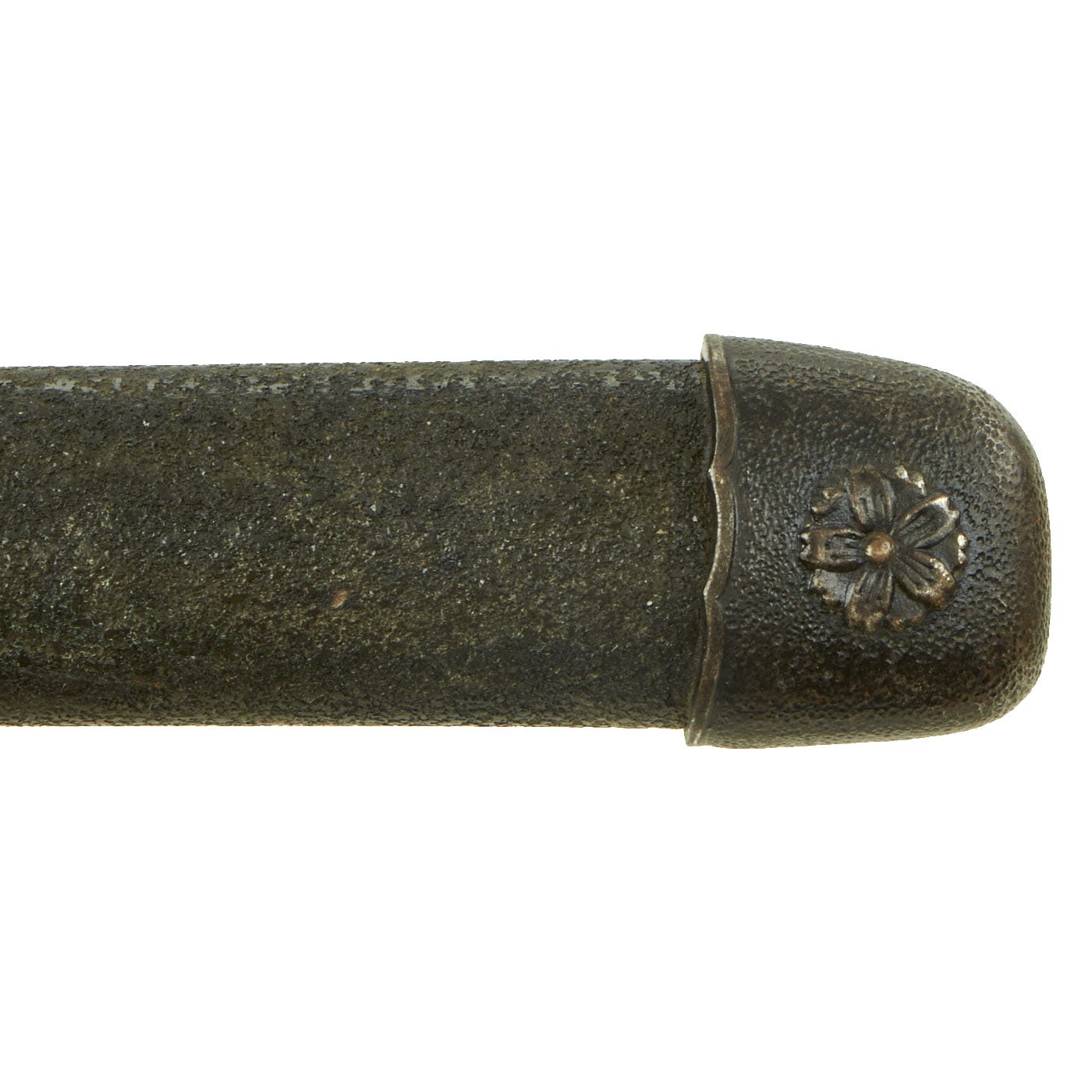 The blade mountings are the typical Rikugun Jumei Tosho Army style, similar to the P-1944. Round iron tsuba (cross guard) with no decorations, a plated copper habaki (blade collar), with an iron fuchi (grip collar). There are three seppa (spacers) surrounding the tsuba, properly inlet for the scabbard lock, and the one closest to the blade is "cup" shaped. The scabbard lock is present and fully functional, but unlike the usual pattern, there are release buttons on both the fuchi and on the scabbard itself.