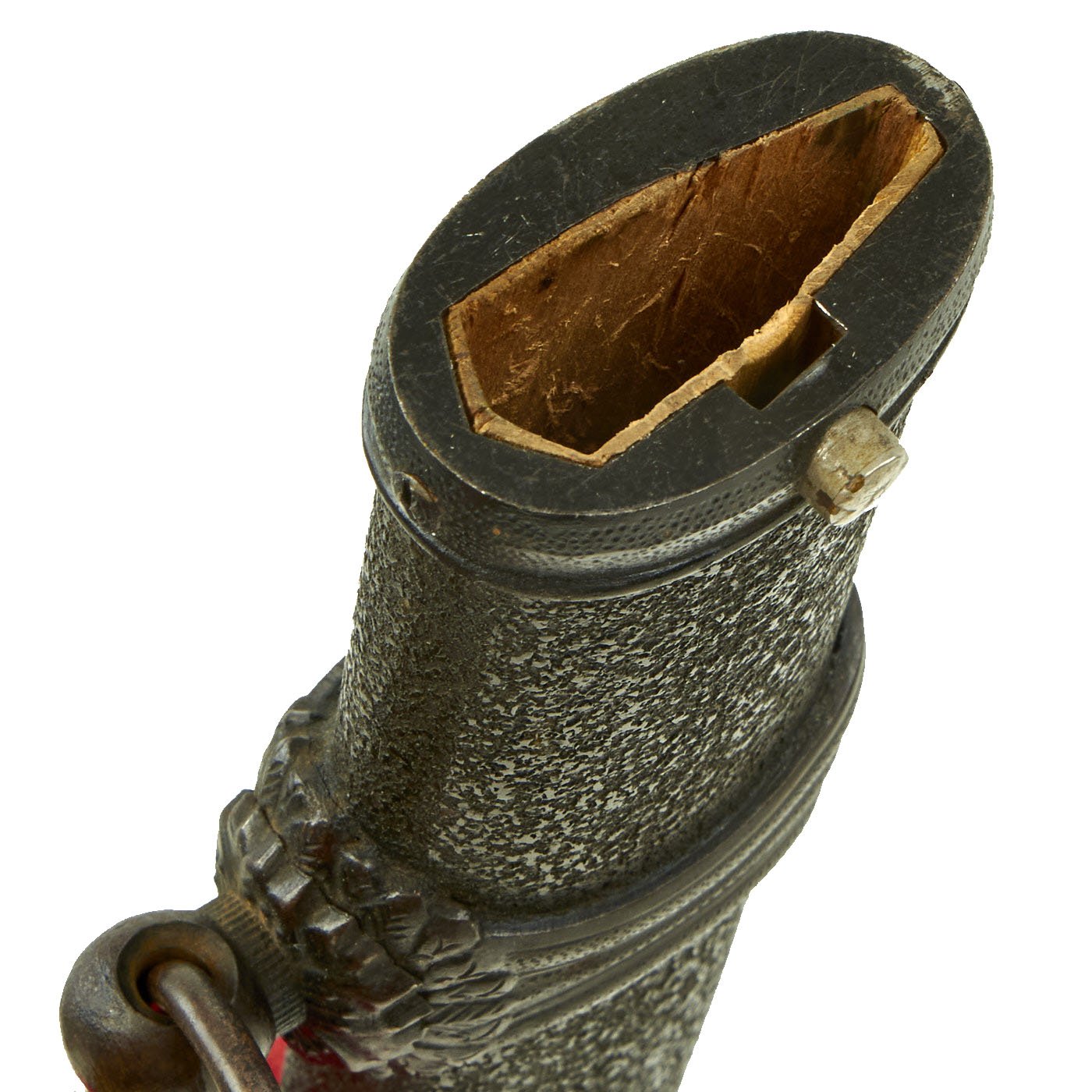 Original Item: One of a Kind. Recently purchased at a large military auction, this is a great USGI Bring-Back wartime production high grade Japanese officer Katana in the Rikugun Jumei Tosho fittings. These were a high grade of variation of the 臨時正式 (Rinji Seikishi) or "Special Contingency" version of the Type 98 Shin-Gunto (九八式軍刀 kyūhachi-shiki guntō) setting, sometimes called the "Type 3". They feature a textured lacquered scabbard, as well as a blade lock that has releases on both sides of the crossguard, not seen on the "regular" version of the Rinji Seishiki. The cross screws through the handle, instead of the usual wooden or bamboo pegs, is another change made.